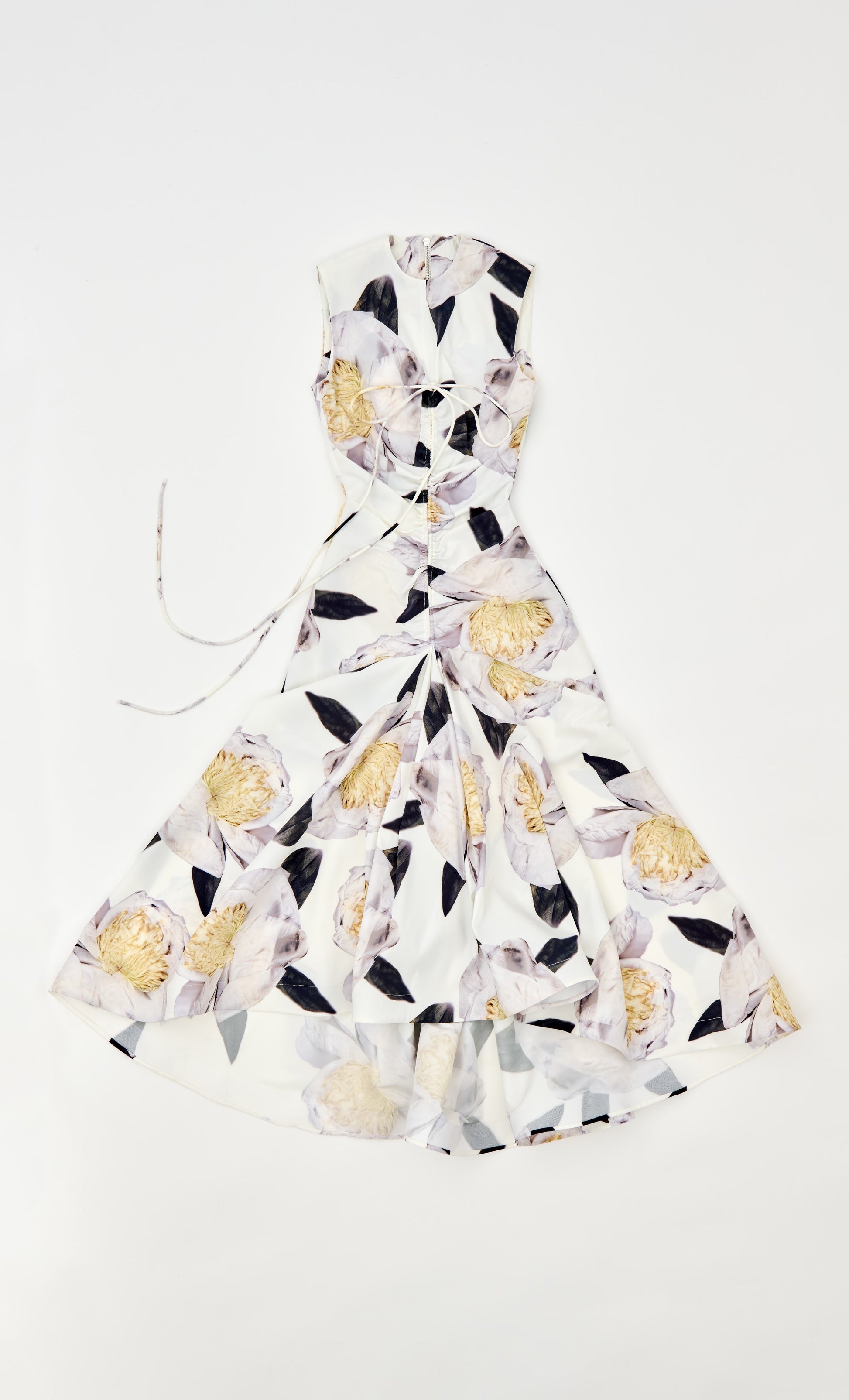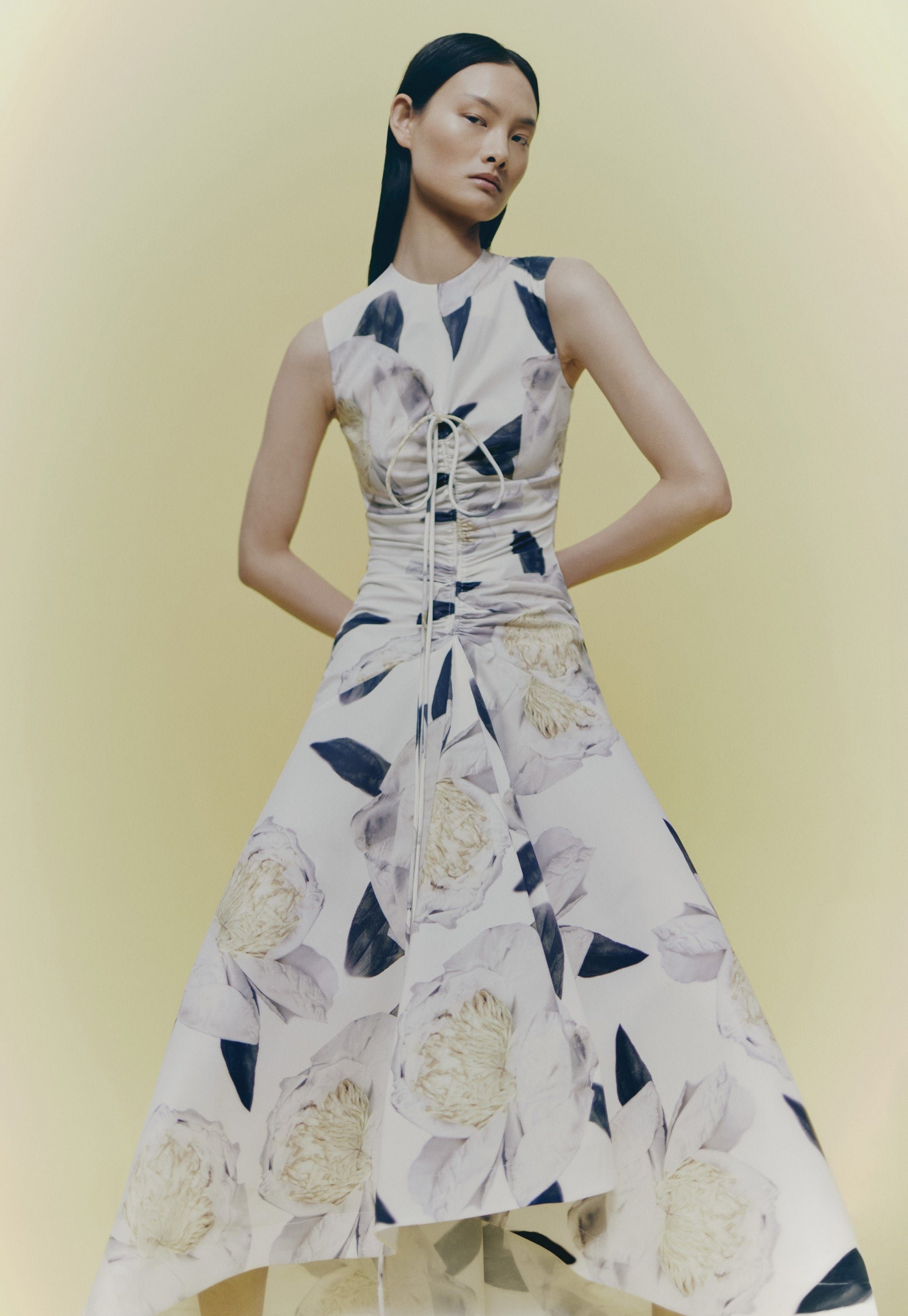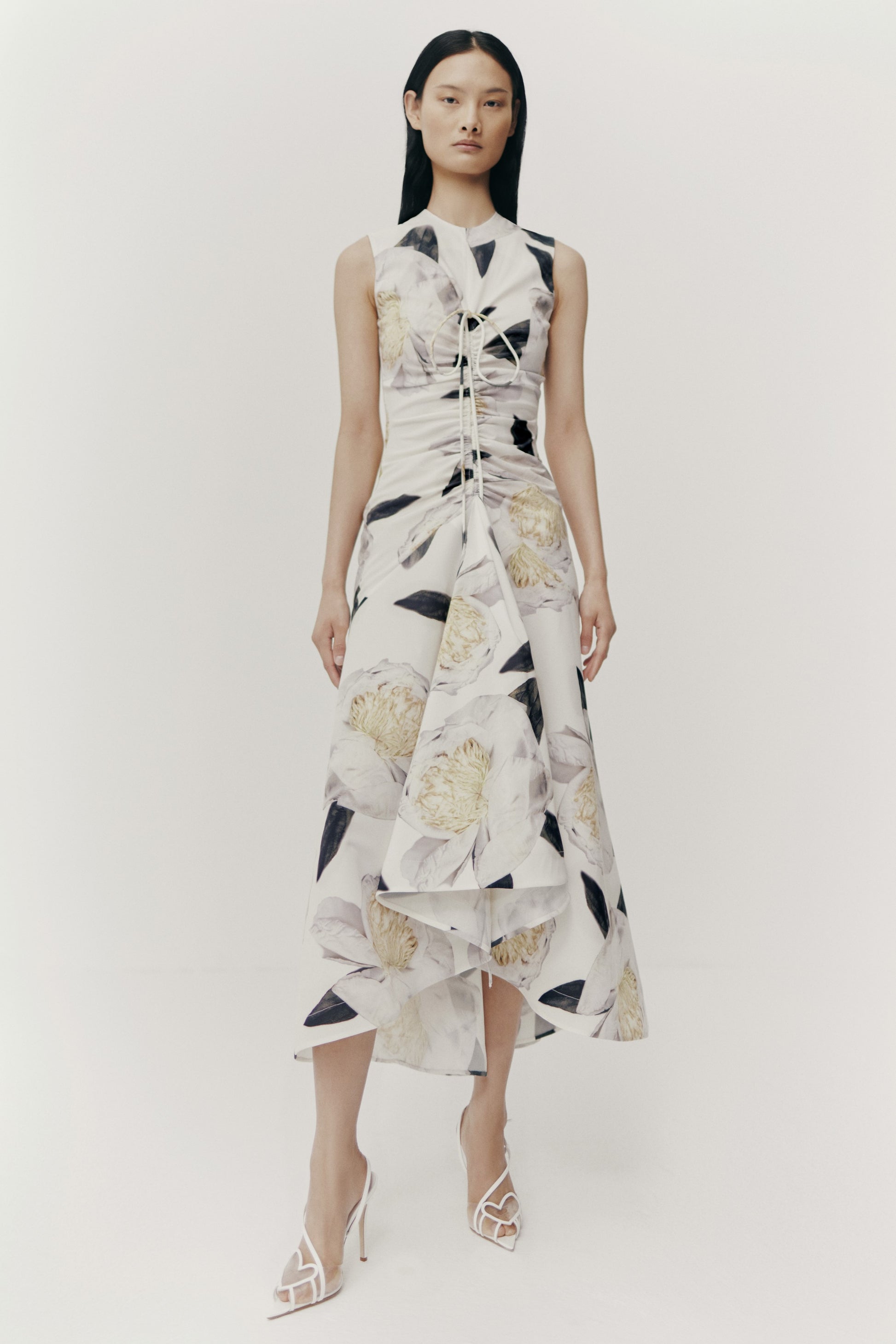 VESTIDO LARGO MIDI, ESCOTE CAJA Y SIN MANGAS, DRAPEADO EN EL CENTRO DELANTERRO CON UN CANAL DOBLE QUE DESEMBOCA EN UN LAZO FRONTAL A LA ALTURA DEL PECHO. FALDA CON VUELO IRREGULAR EN LA ZONA FRONTAL DELANTERA. LA PARTE TRASERA DEL VESTIDO ES LIMPIA.