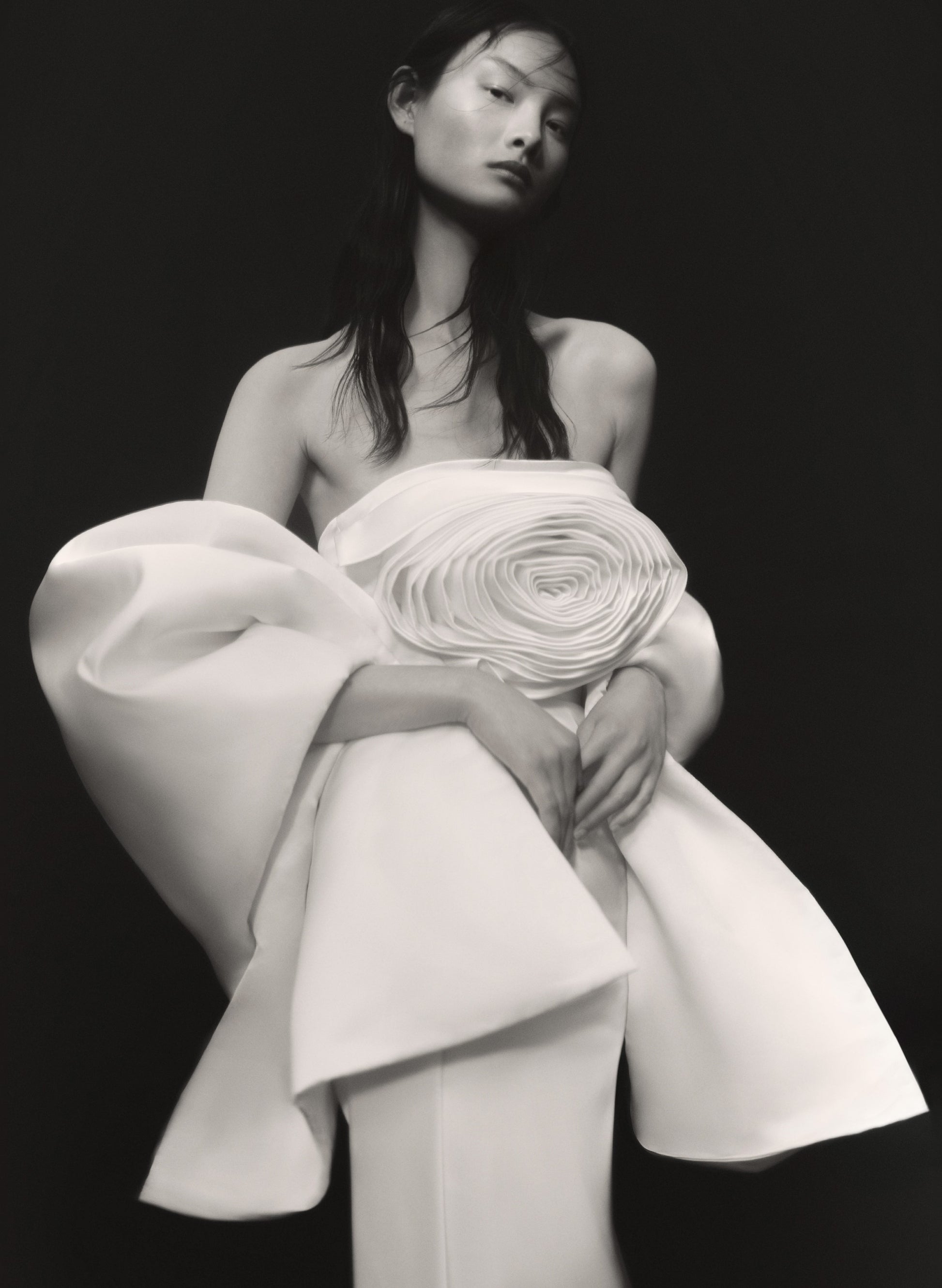 VESTIDO CUELLO CAJA SIN MANGAS, CON ESCOTE EN FORMA DE U PROFUNDA Y REMATADA CON UNA ESTRUCTURA INTERIOR MOLDEADA PARA ADAPTARSE AL CUERPO E IMPEDIR SU ABERTURA. EL ESCOTE ESTÁ DECORADO CON UNA ROSA METÁLICA DE TALLO LARGO COSIDA A MANO SOBRE UNA PIEZA DEL MISMO TEJIDO. EL VESTIDO SE CIERRA EN LA ESPALDA A TRAVÉS DE UNA LÁGRIMA ABOTONADA EN LA PARTE SUPERIOR.