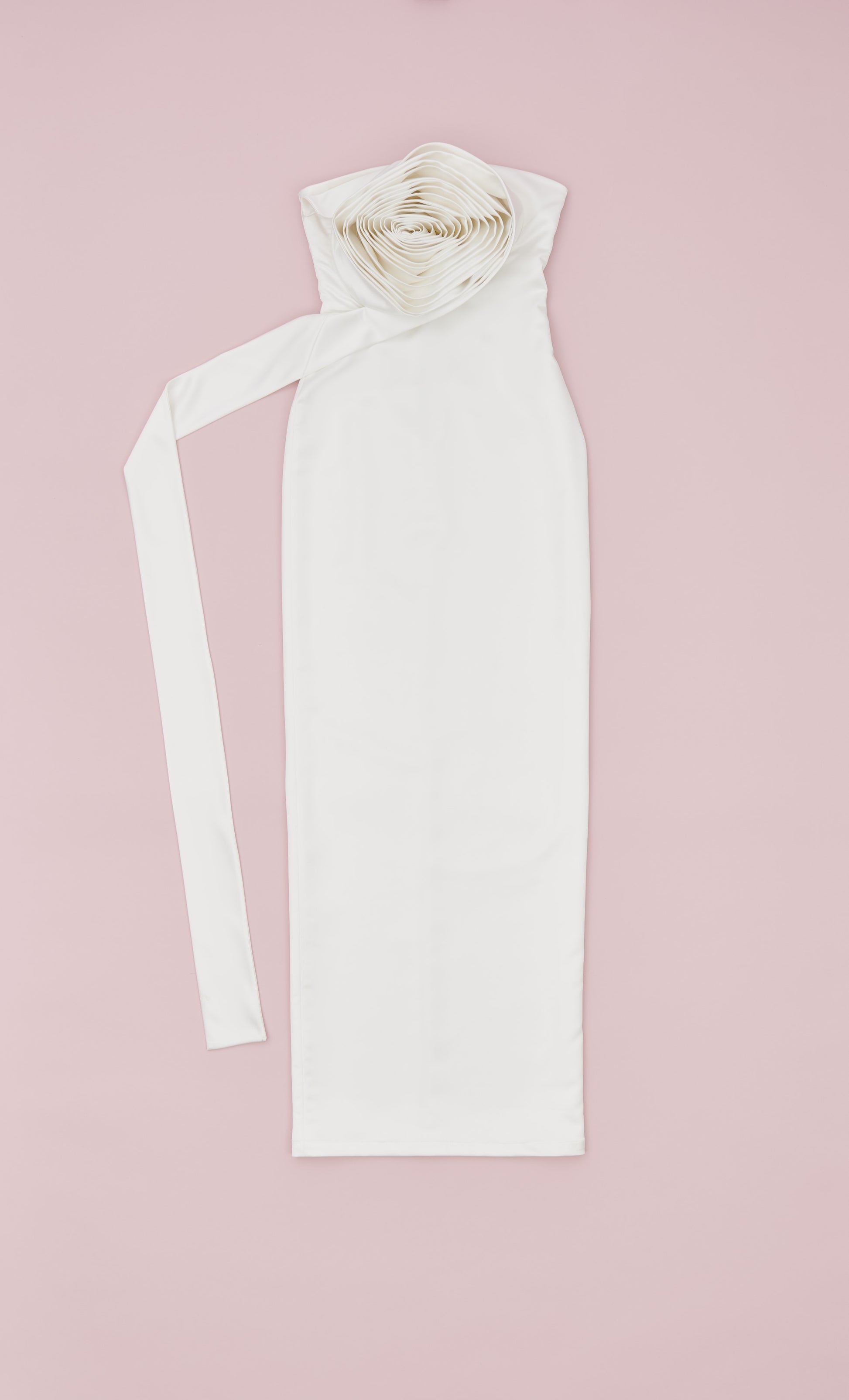VESTIDO ROSE MAXIFICADO, PALABRA DE HONOR CON FLOR TRIDIMENSIONAL DE GRAN TAMAÑO A LA ALTURA DEL PECHO. REALIZADO EN RASO ELASTICO SEMI-BRILLO.