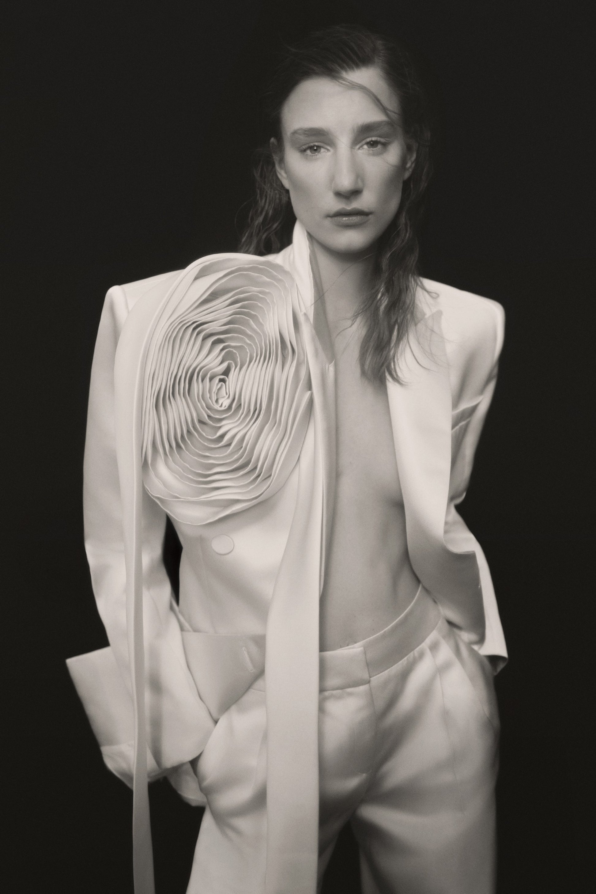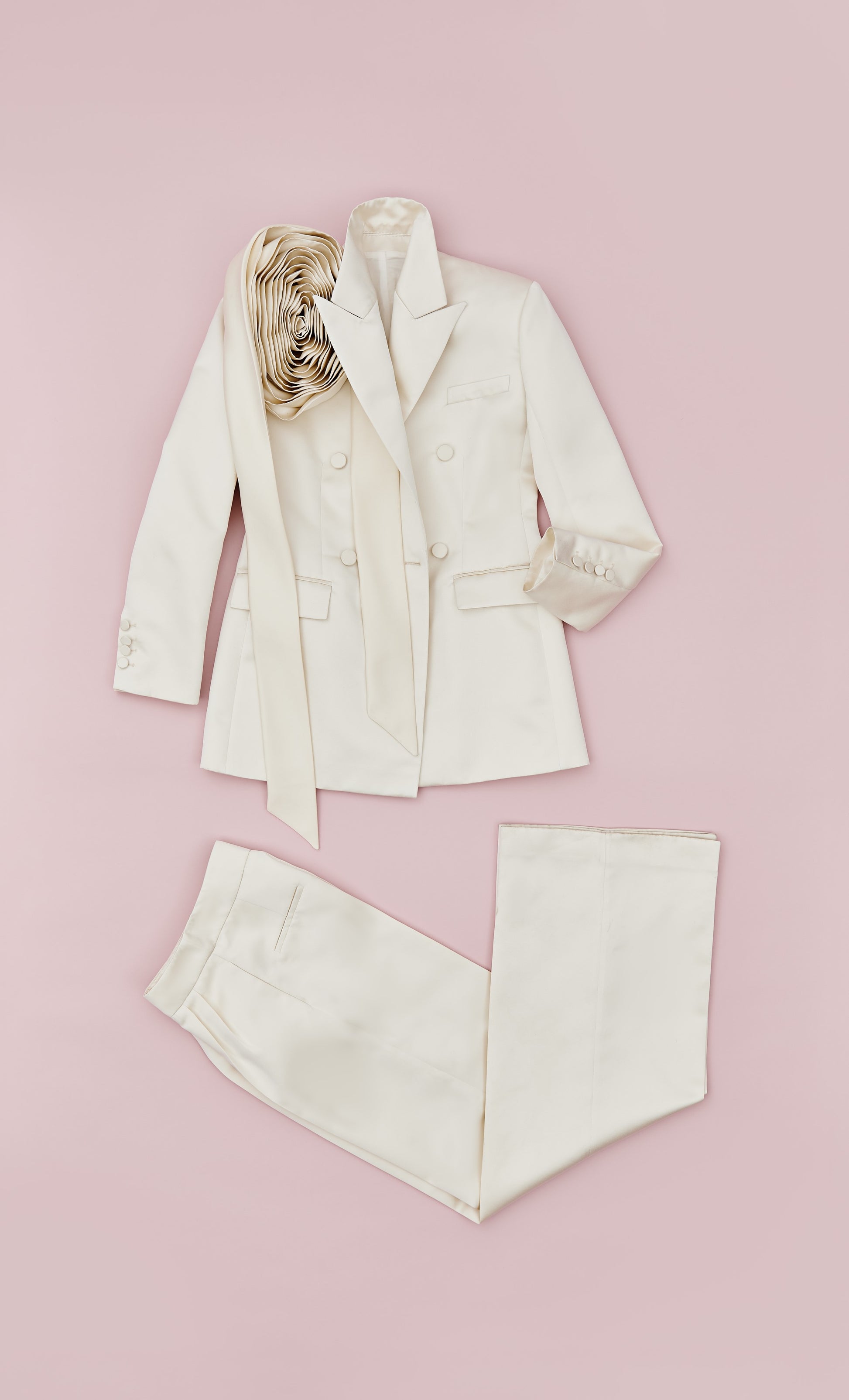 TRAJE DE CHAQUETA DE RASO DE ALGODÓN GRUESO SATINADO, COLOR CRUDO, CON APLICACIÓN DE ROSA TRIDIMENSIONAL EN UN LADO. LA ESTRUCTURA DE LA AMERICANA ES AMPLIA, CRUZADA, CON SOLAPA DE PUNTA DE LANZA. EL PANTALÓN ALTO DE CINTURA CON DOBLE PLIEGUE FRONTAL, CON DOS BOLSILLOS LATERALES.