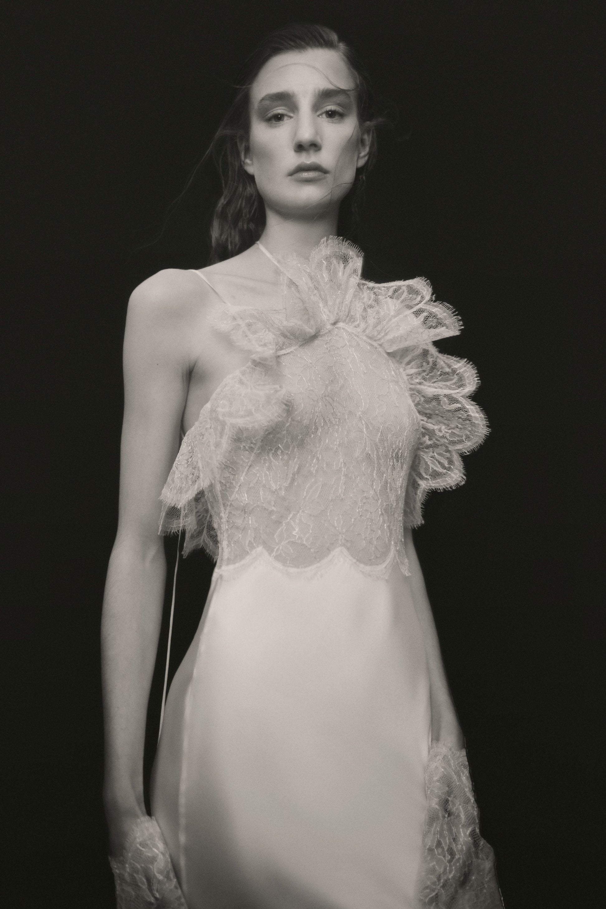 VESTIDO LENCERO CORTADO AL BIES, CUELLO HALTER, COMBINACION DE CHANTILLY ENTOLADO SOBRE PIEL DE ANGEL DE SEDA NATURAL BILLO. EL CANTO DEL ESCOTE DECORADO CON UN VOLANTE DE ONDAS DE CHANTILLY.
