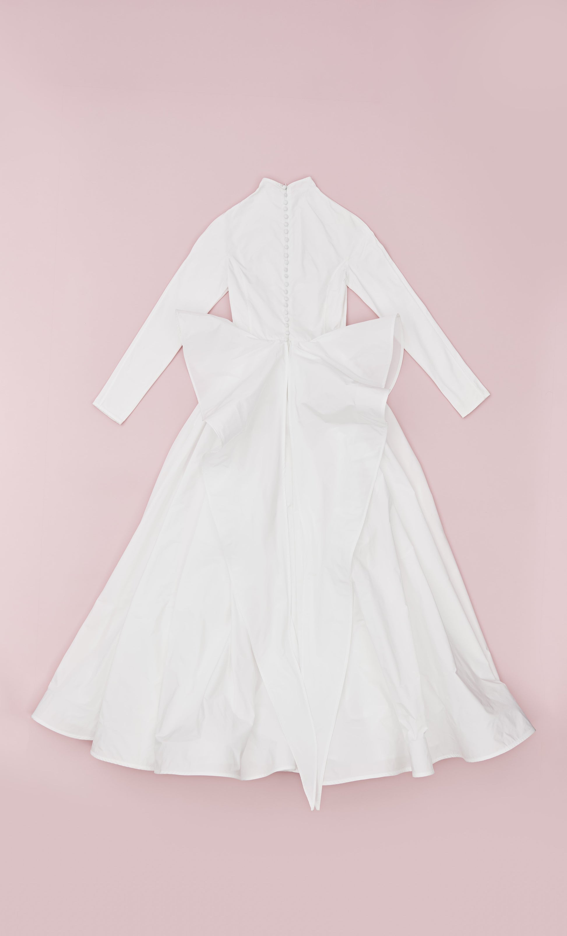 VESTIDO CUELLO CAJA SIN MANGAS, CON ESCOTE EN FORMA DE U PROFUNDA Y REMATADA CON UNA ESTRUCTURA INTERIOR MOLDEADA PARA ADAPTARSE AL CUERPO E IMPEDIR SU ABERTURA. EL ESCOTE ESTÁ DECORADO CON UNA ROSA METÁLICA DE TALLO LARGO COSIDA A MANO SOBRE UNA PIEZA DEL MISMO TEJIDO. EL VESTIDO SE CIERRA EN LA ESPALDA A TRAVÉS DE UNA LÁGRIMA ABOTONADA EN LA PARTE SUPERIOR.