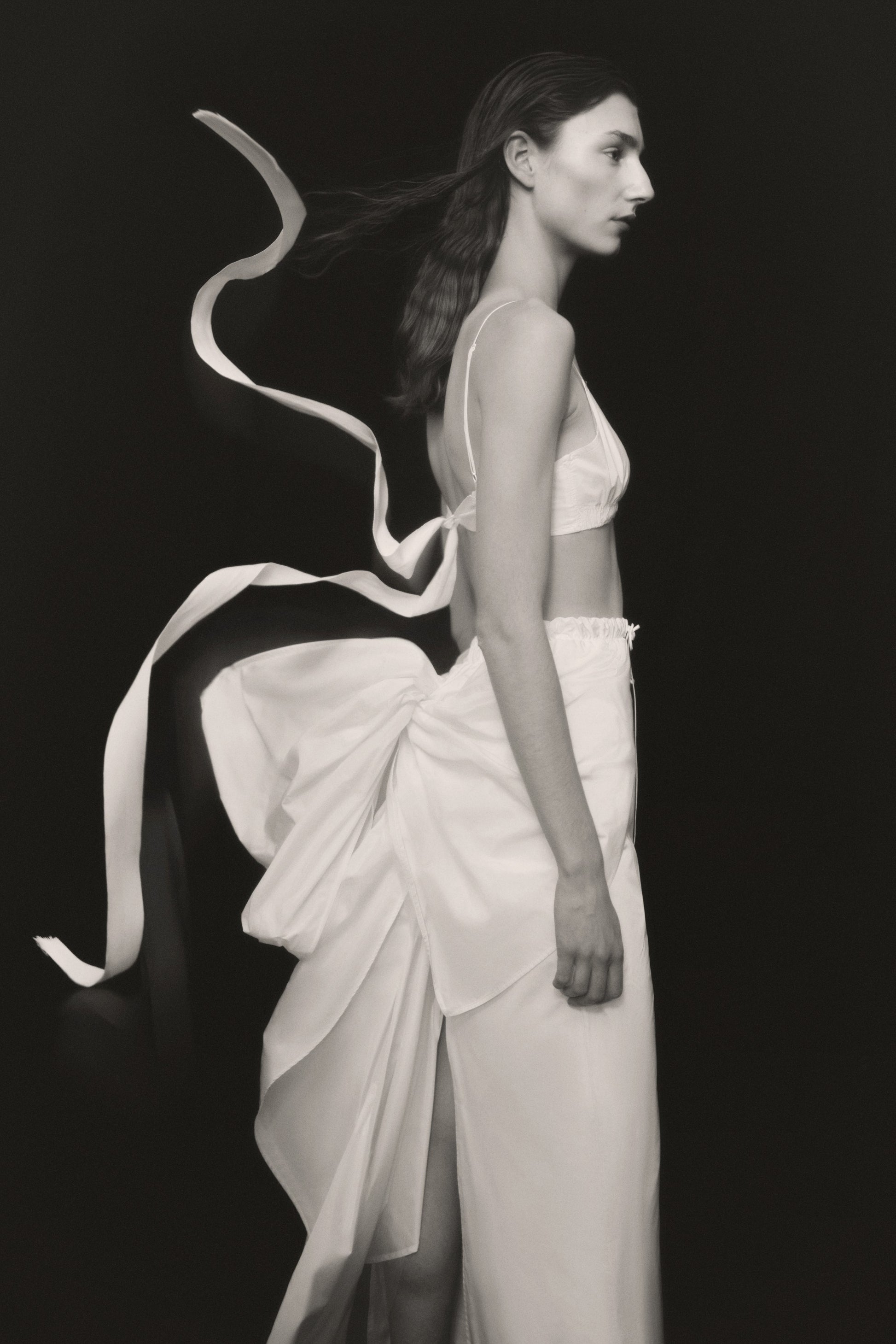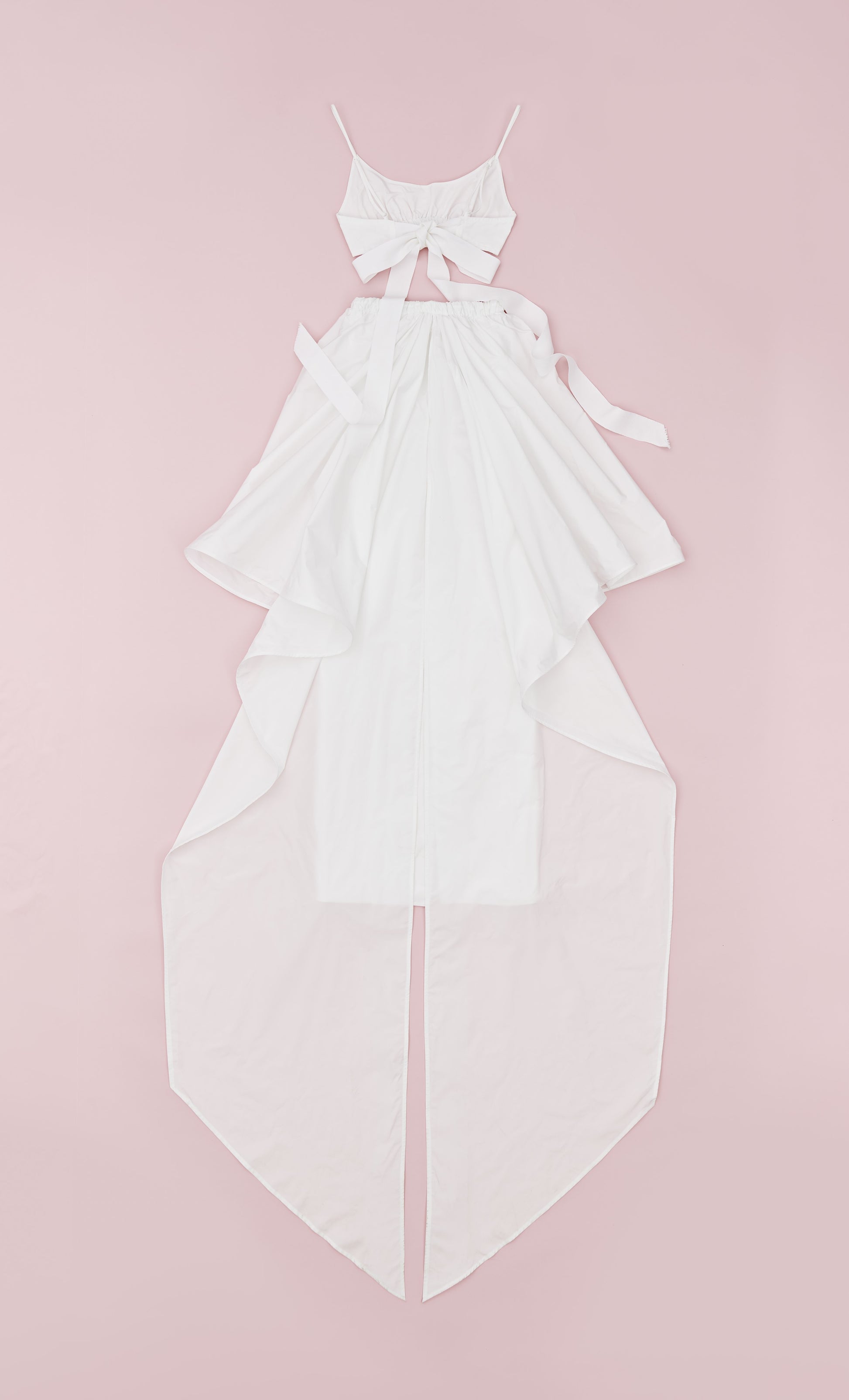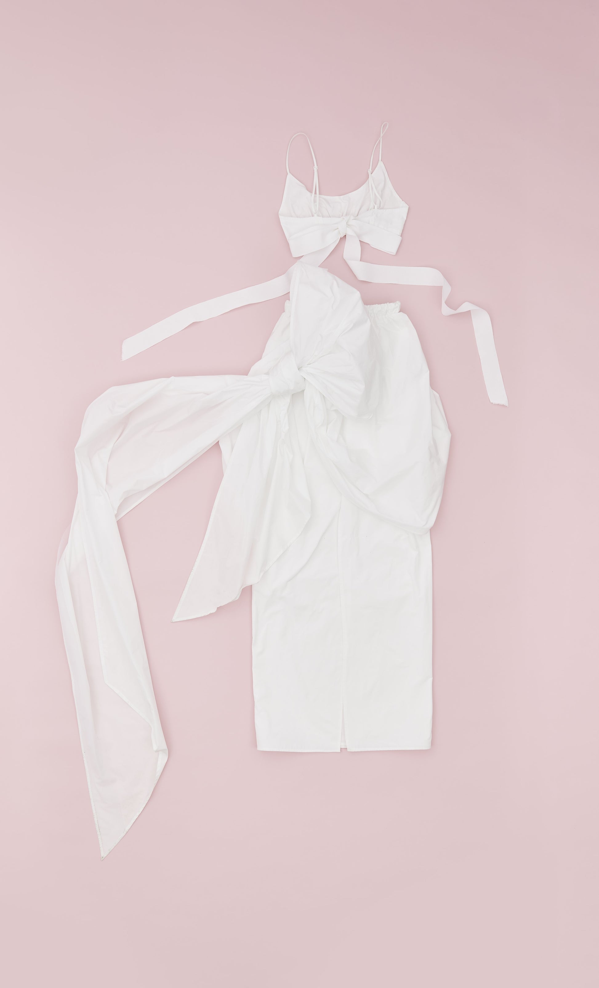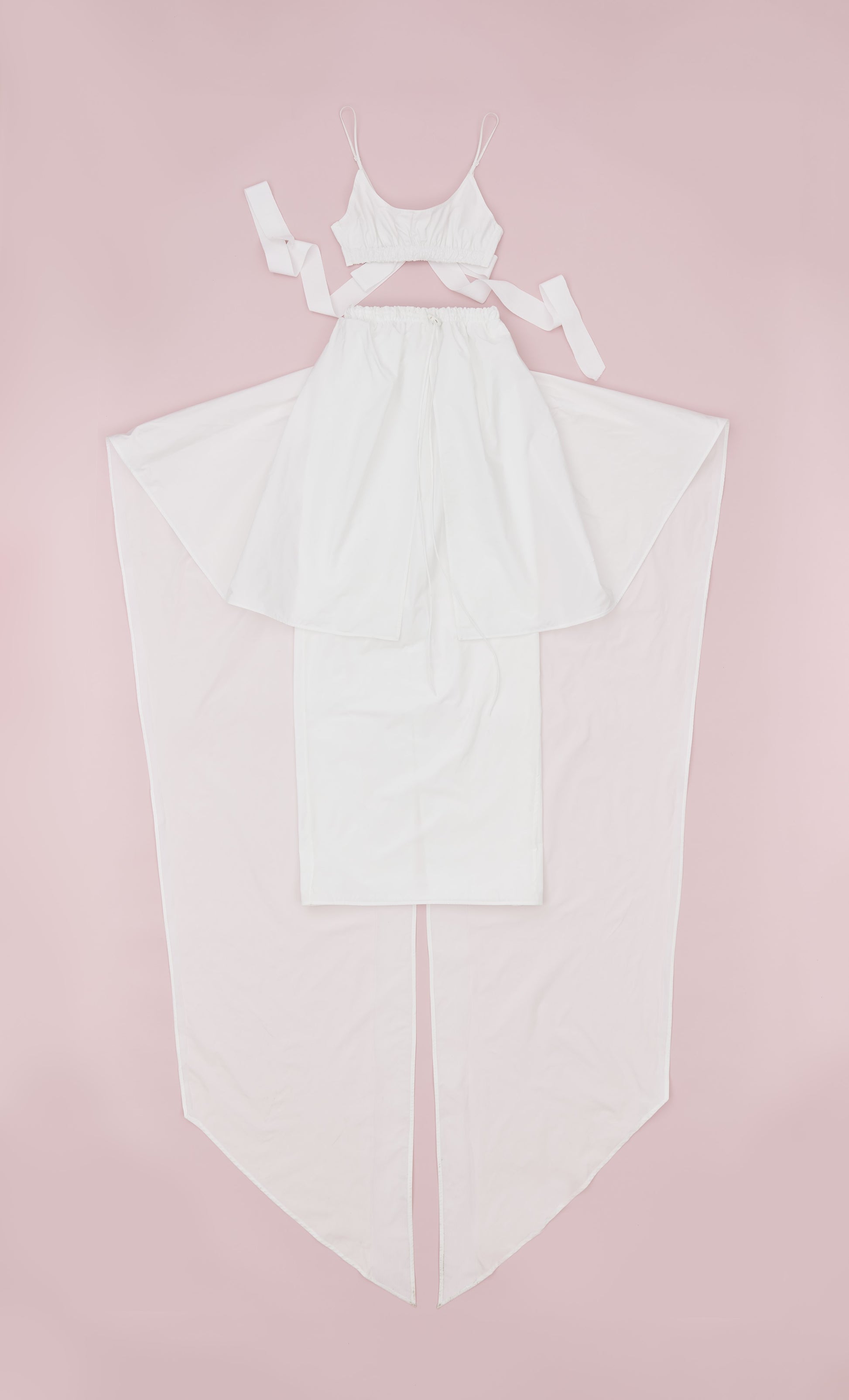 SET DE DOS PIEZAS REALIZADAS EN TAFETA. PARTE SUPERIOR MICRO TOP DE TIRANTES CON ESCOTE EN U ANUDADO A LA ESPALDA CON CINTA DE GROSGRAIN EN CONTRASTE. LA FALDA RECTA LLEVA UNA SOBRE FALDA AMPLIA Y LARGA QUE SE RECOGE EN LA ESPALDA CON MEDIO LAZO MODULAR .