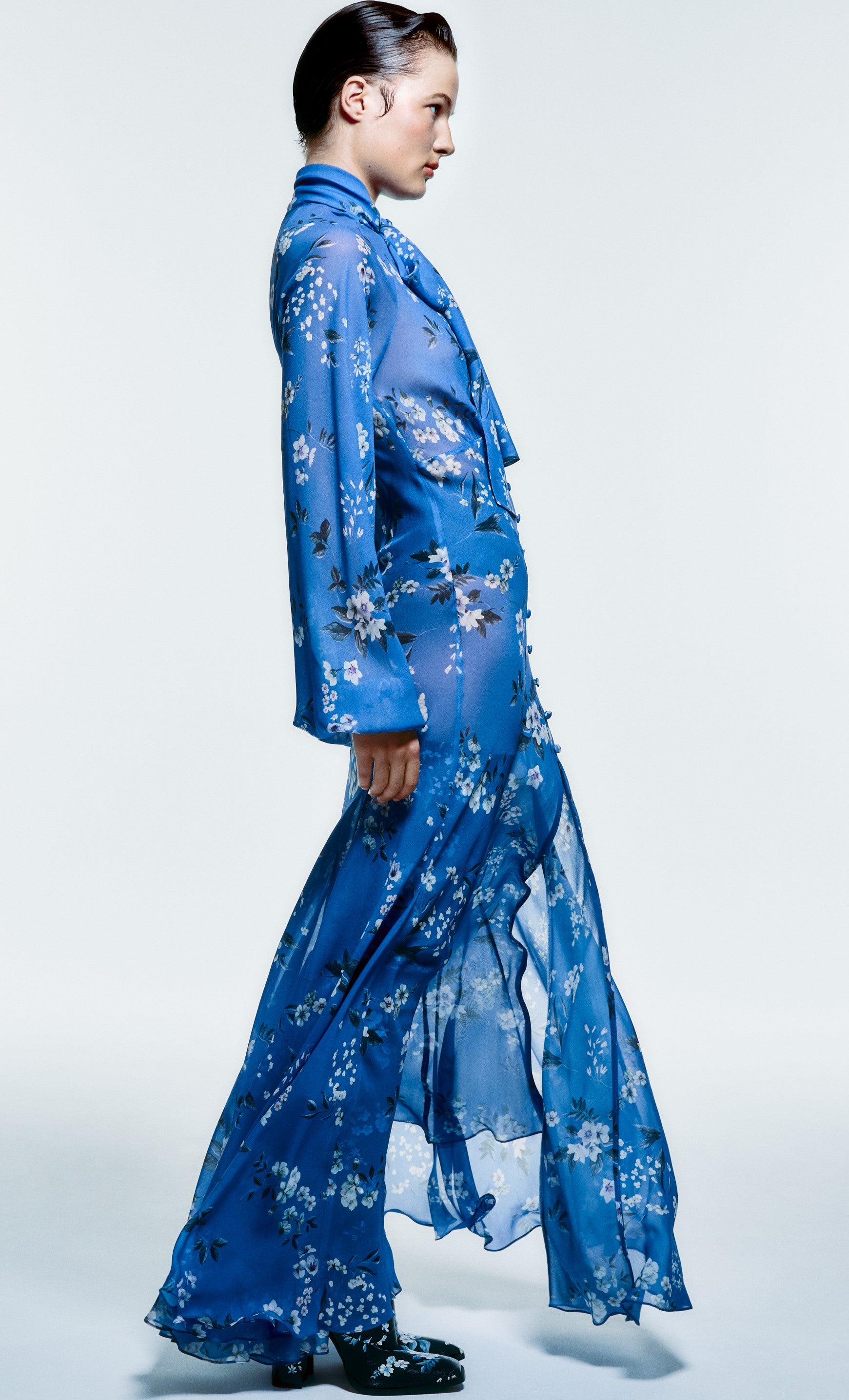 Dress with long sleeves and lacing at the neck, high waist with gathers on the chest decorating a deep V-neckline. Skirt with asymmetrical godets that give movement to the bottom of the dress, front opening decorated with covered buttons. The dress has a comfortable wearability because of the bies cut, which allows a better adaptation to different body shapes.