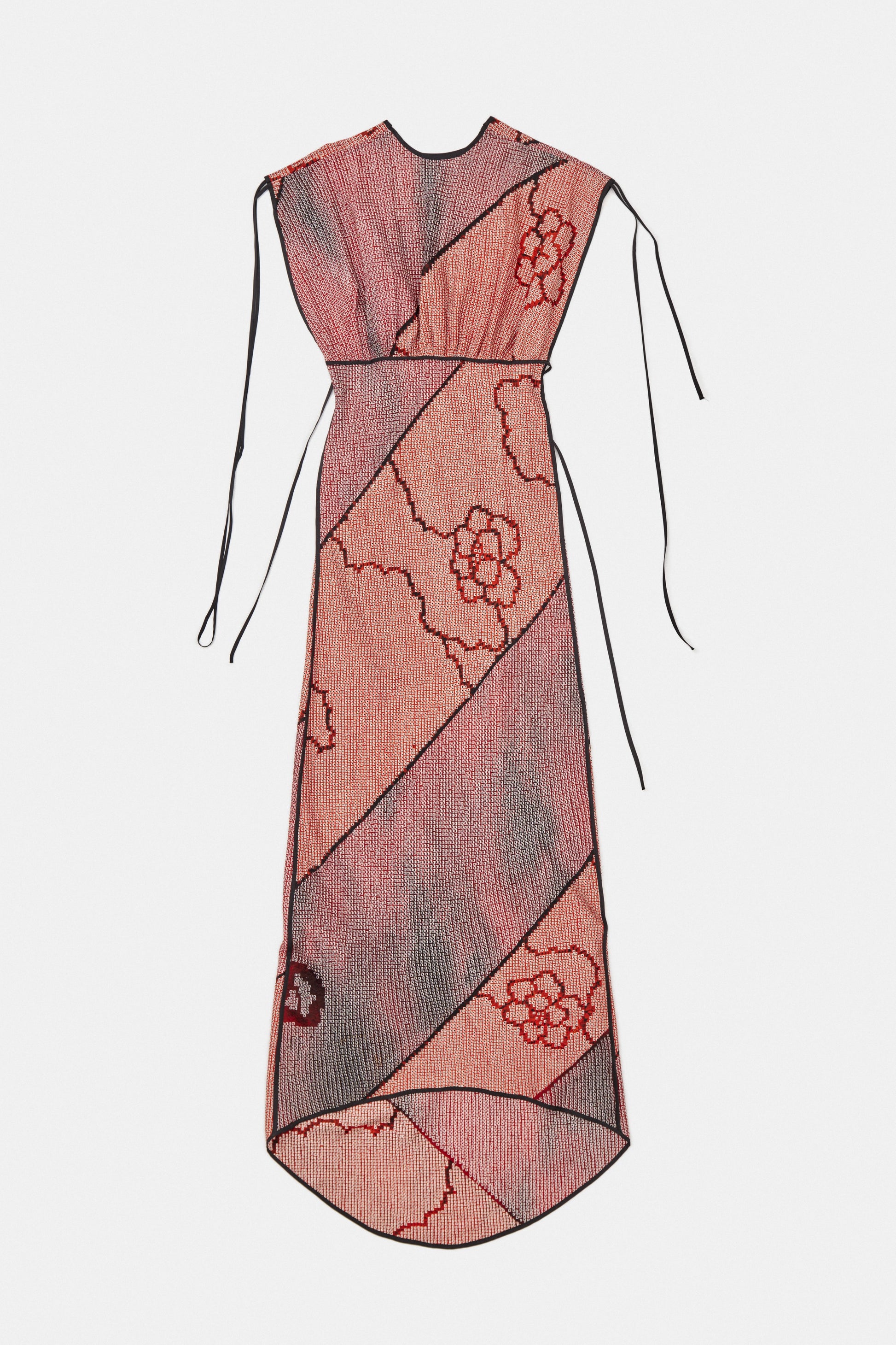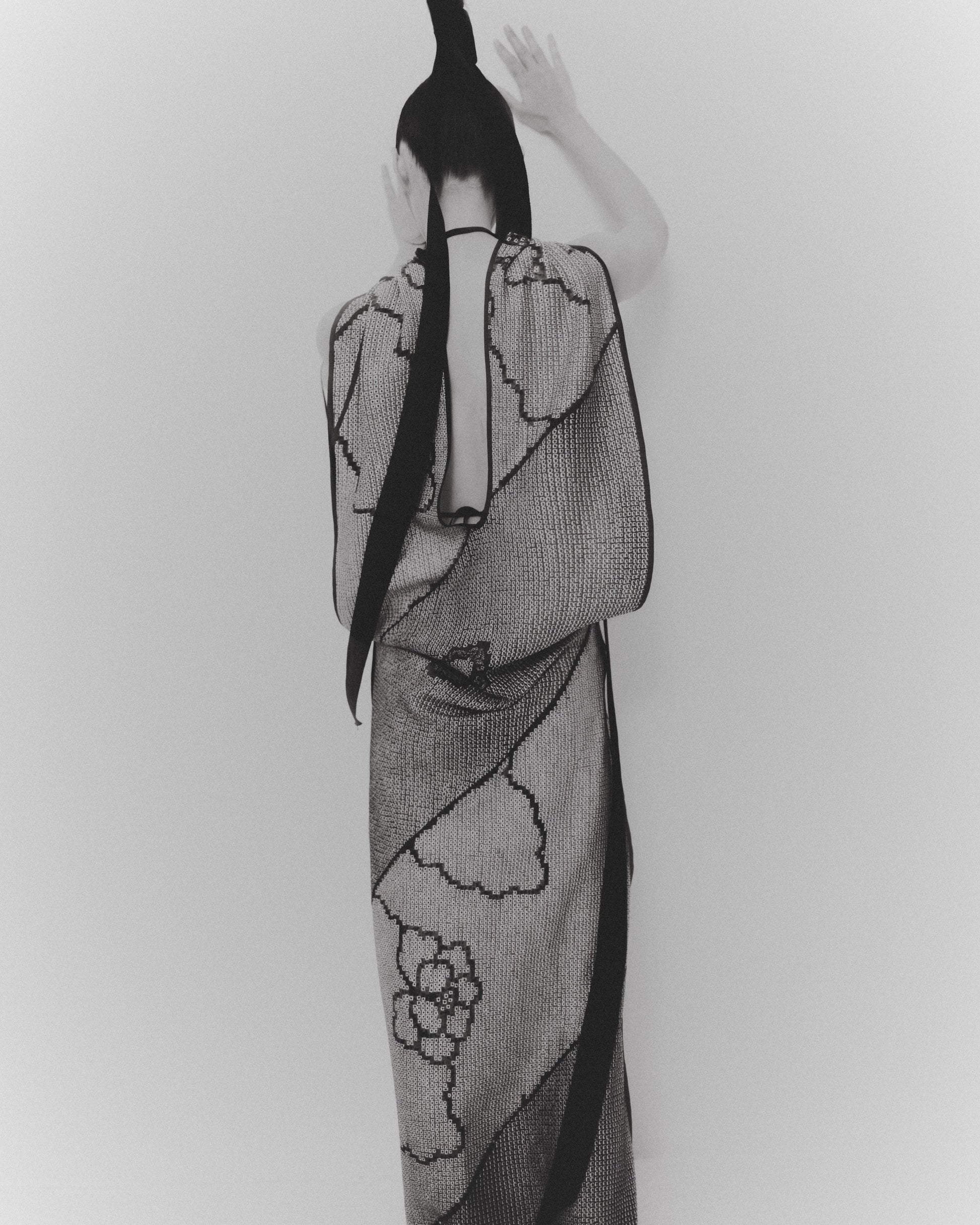 VESTIDO CUELLO CAJA SIN MANGAS, CON ESCOTE EN FORMA DE U PROFUNDA Y REMATADA CON UNA ESTRUCTURA INTERIOR MOLDEADA PARA ADAPTARSE AL CUERPO E IMPEDIR SU ABERTURA. EL ESCOTE ESTÁ DECORADO CON UNA ROSA METÁLICA DE TALLO LARGO COSIDA A MANO SOBRE UNA PIEZA DEL MISMO TEJIDO. EL VESTIDO SE CIERRA EN LA ESPALDA A TRAVÉS DE UNA LÁGRIMA ABOTONADA EN LA PARTE SUPERIOR.