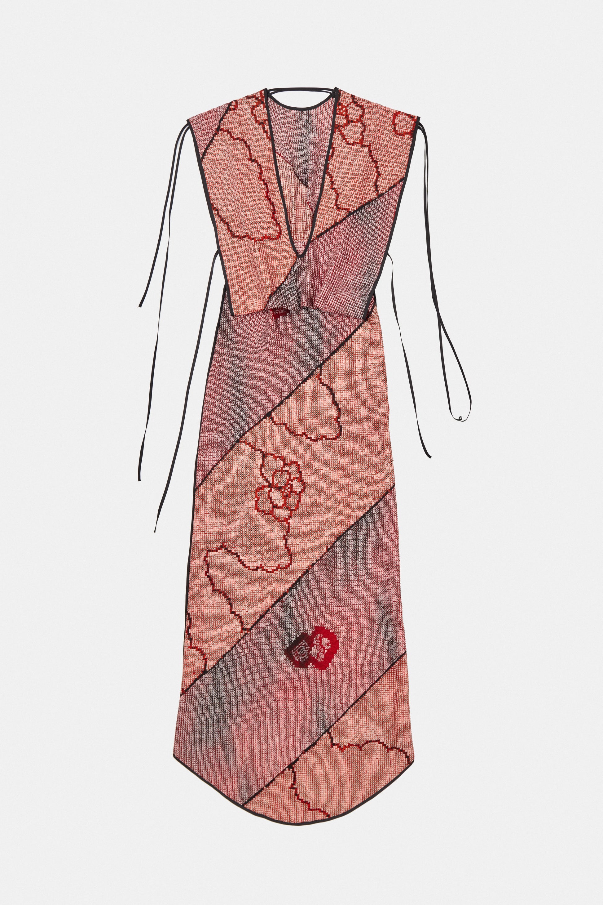 Los paneles en diagonal se remarcan con los cantos del tejido original teñidos en negro, paradas una mayor visibilidad al patchwork. El kanoki shibori es una tecnica tradicional japonesa que consiste en teñir el tejido con nudos lo mas pequeños posibles para enfatizar la tridimensionalidad del tejido. El kanoko o “cría de ciervo” realizado al completo en kimonos requiere un gran esfuerzo en su elaboración convirtiendo la prenda en un artículo de lujo.