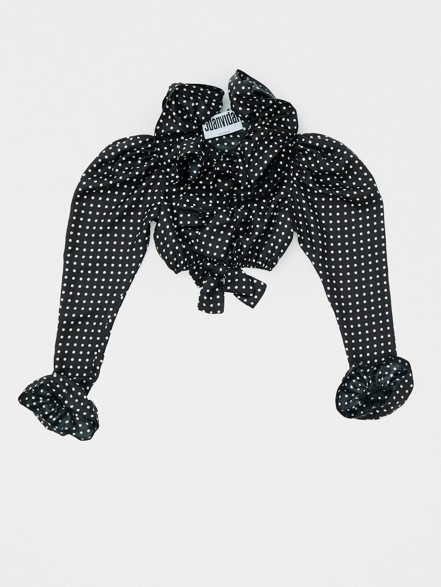 Camisa crop de seda con lazos. Diseño con volante en el cuello y tres lazos frontales, que aportan volumen y un gesto femenino y sofisticado.