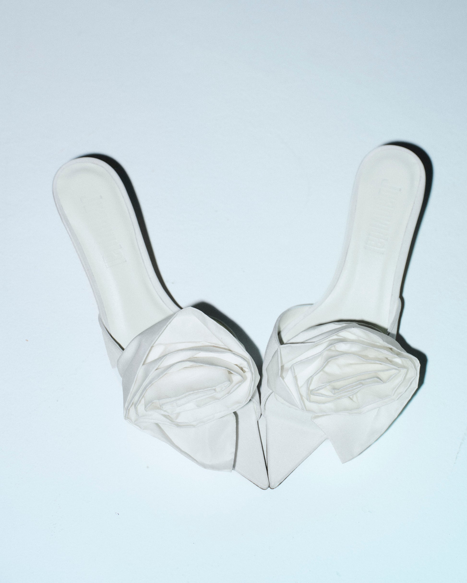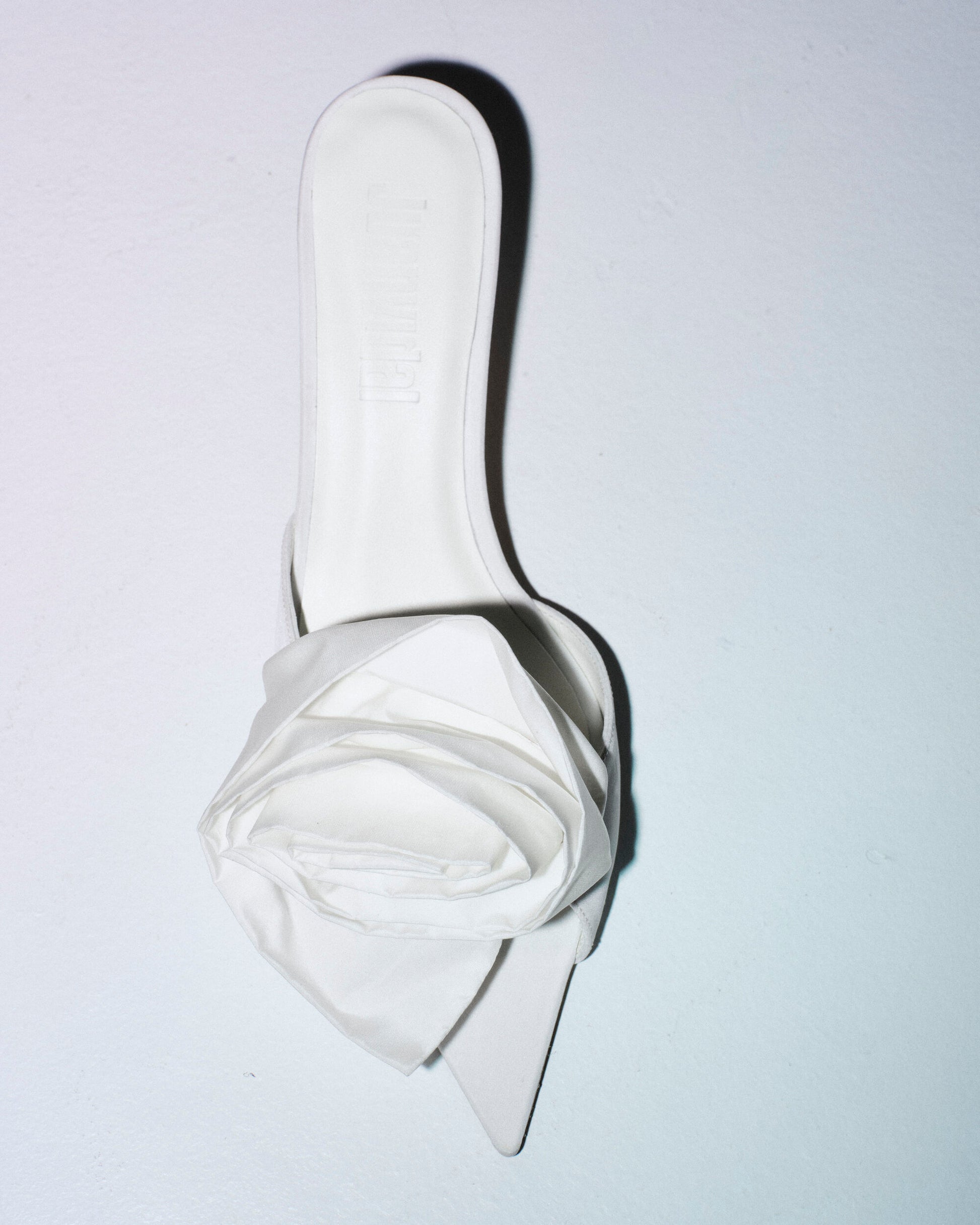 Mule de tacón 4,5 cm realizado en tafeta. La pala se adorna con una flor de tafeta tridimensional. Forro y suela de piel.