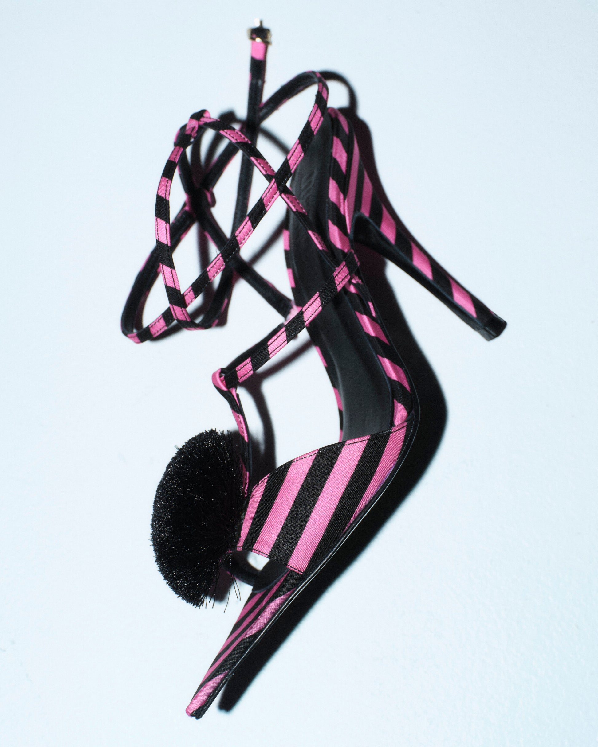 Sandalia de tacón 10,5 cm realizada en seda estampada de lunares.Diseño de tiras finas cruzadas con pulsera y cierre de hebilla.La pala se adorna con un pompón de seda.Forro y suela de piel.