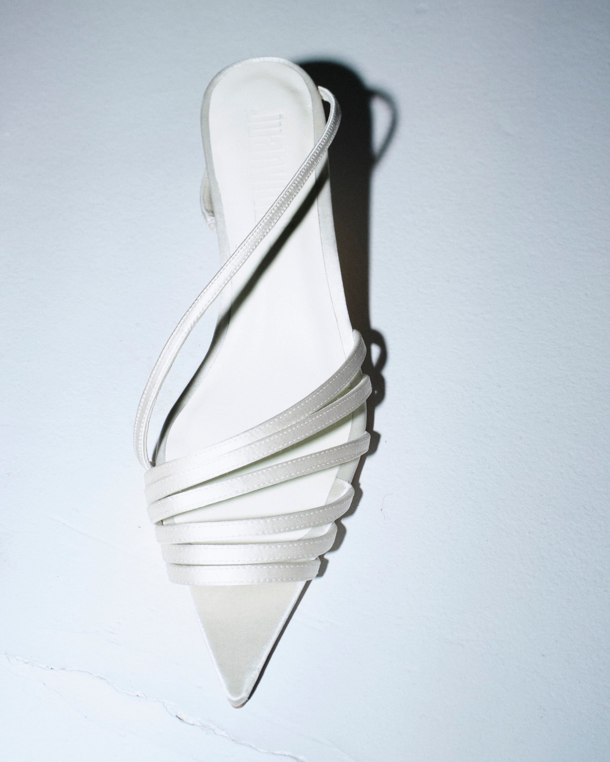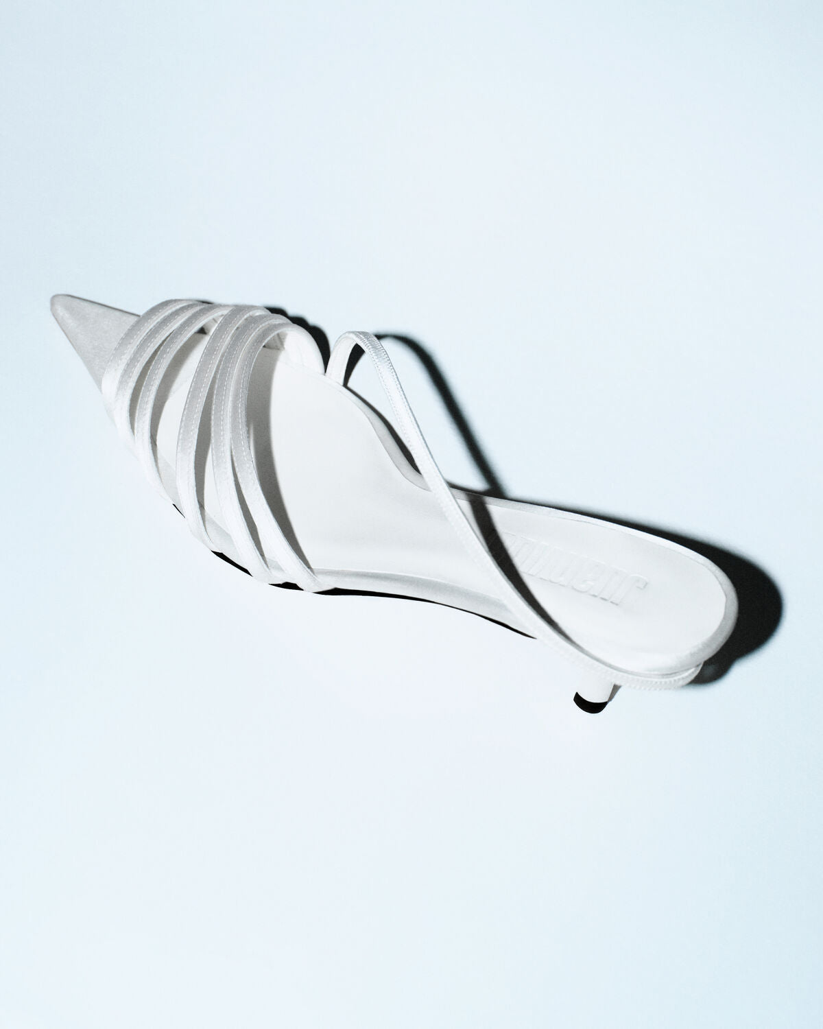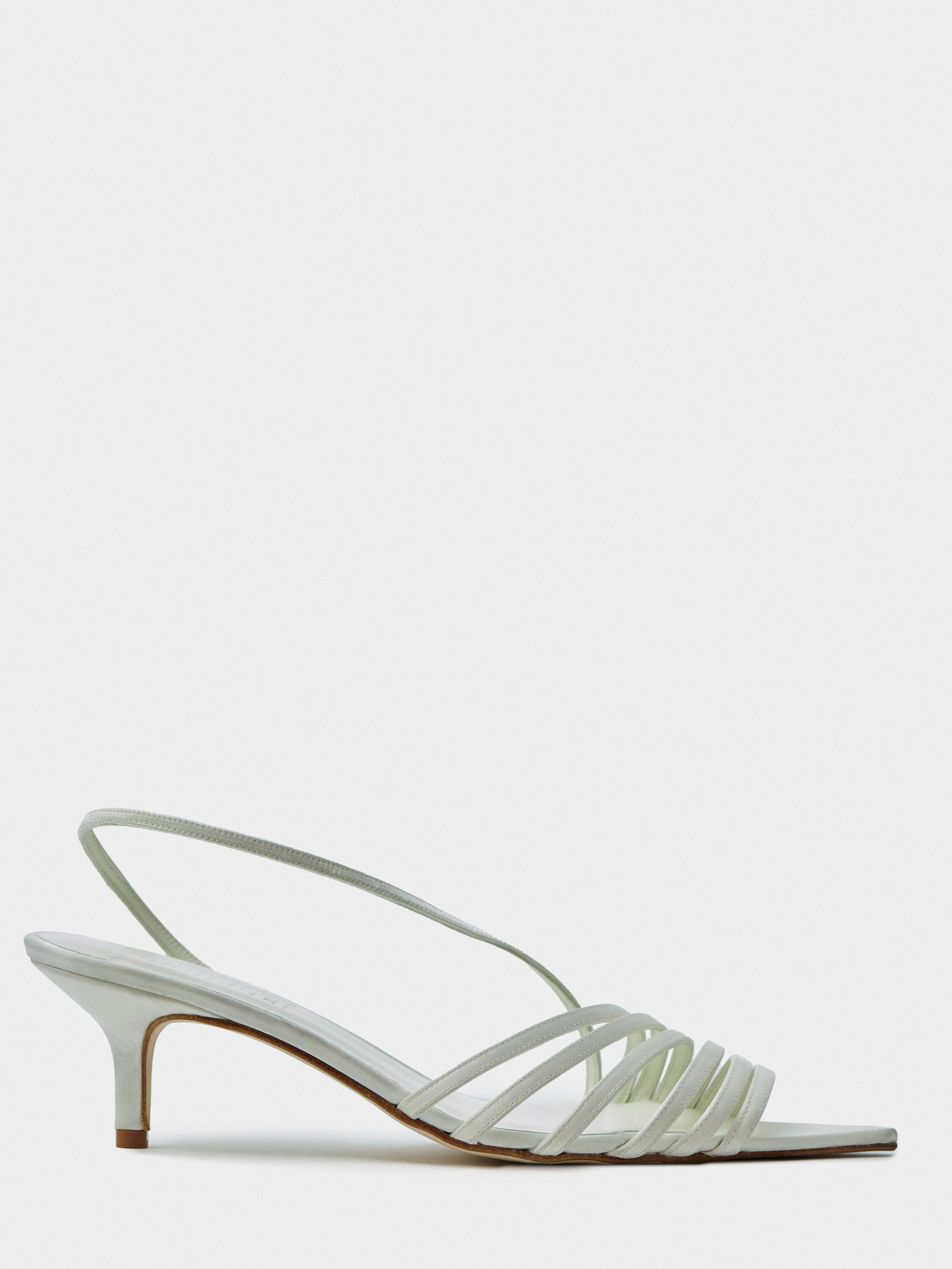 Sandalia de tacón 4,5 cm realizada en raso. Diseño de múltiples tiras finas que envuelven el empeine, con pulsera trasera. Forro y suela de piel.
