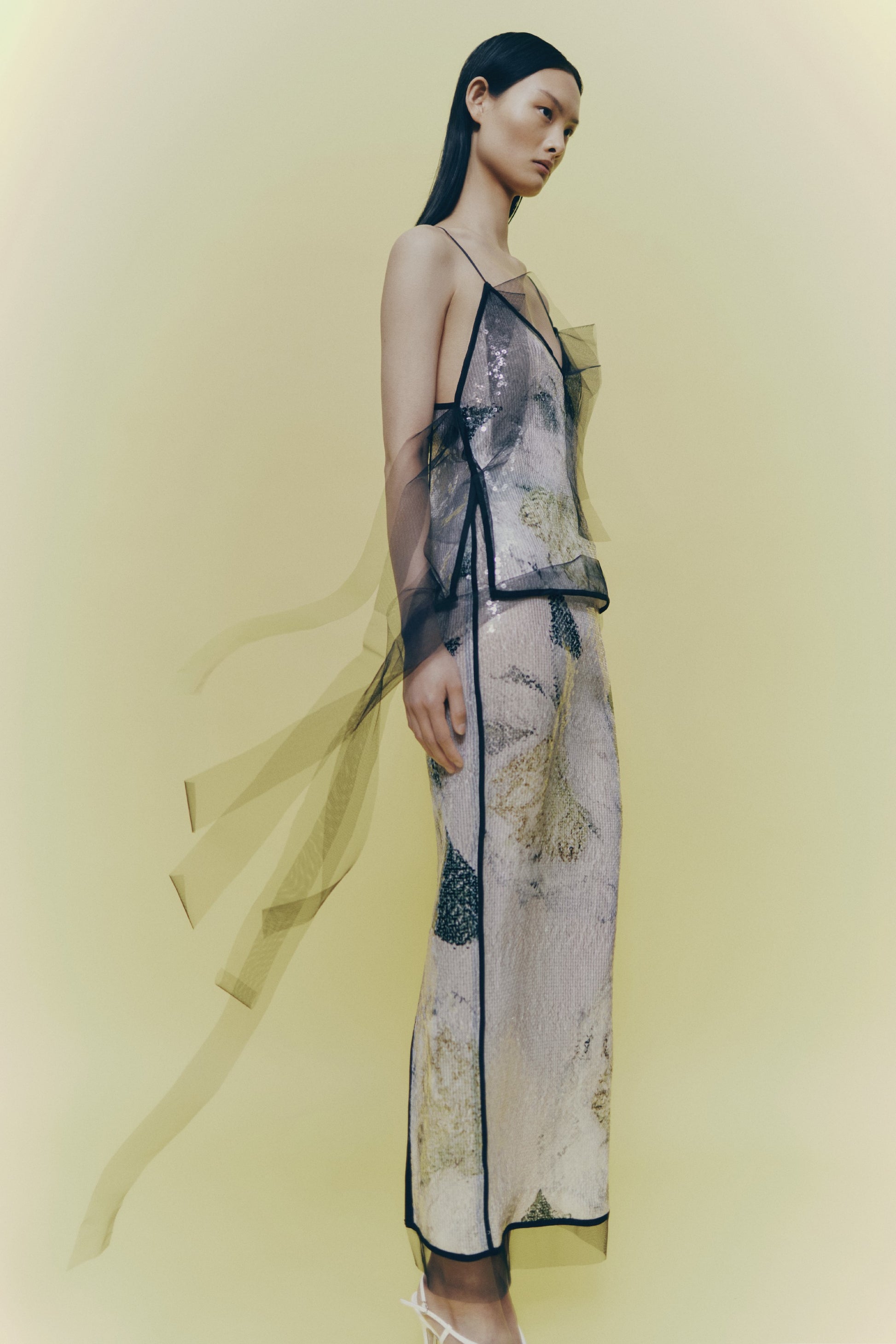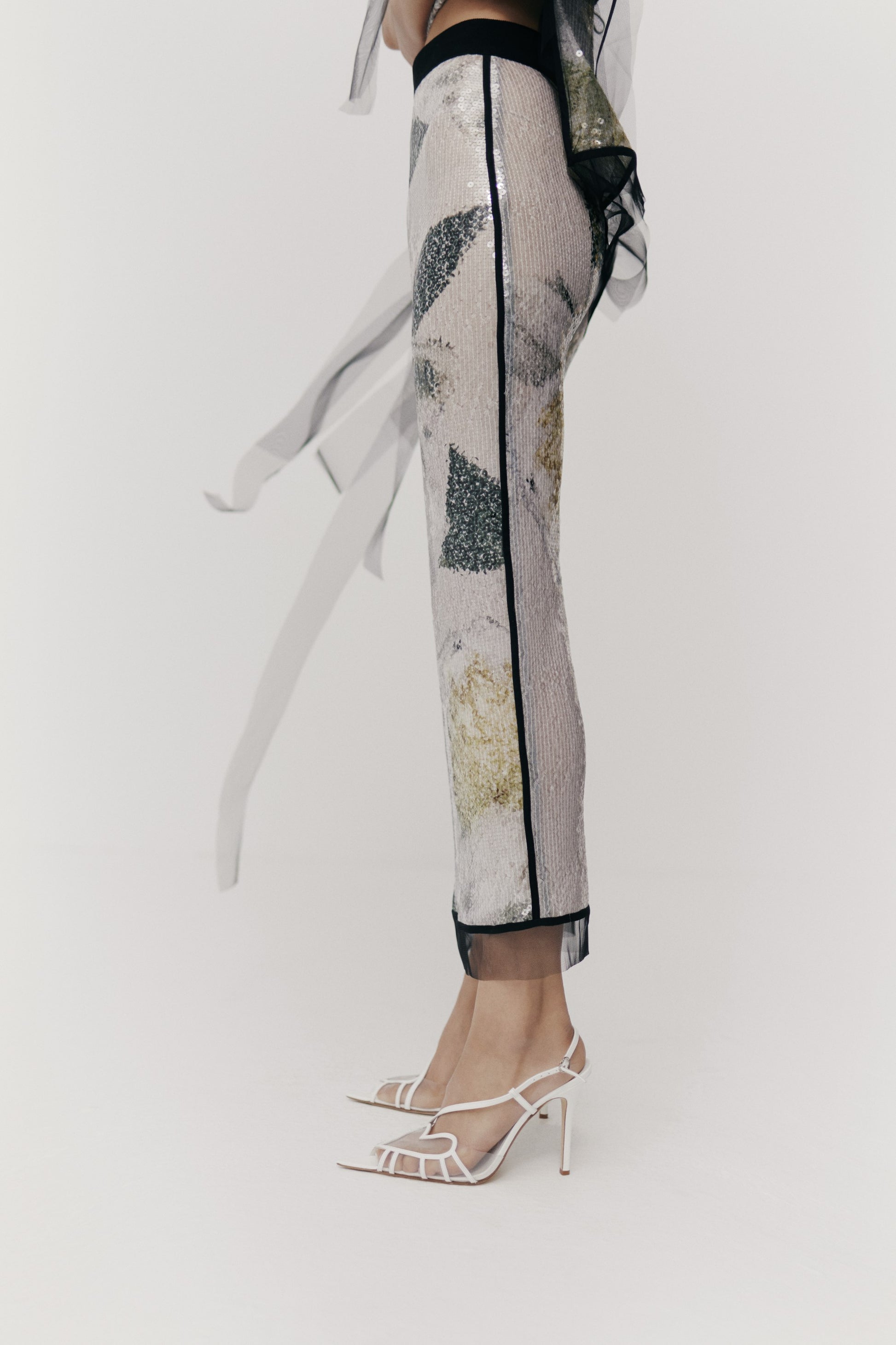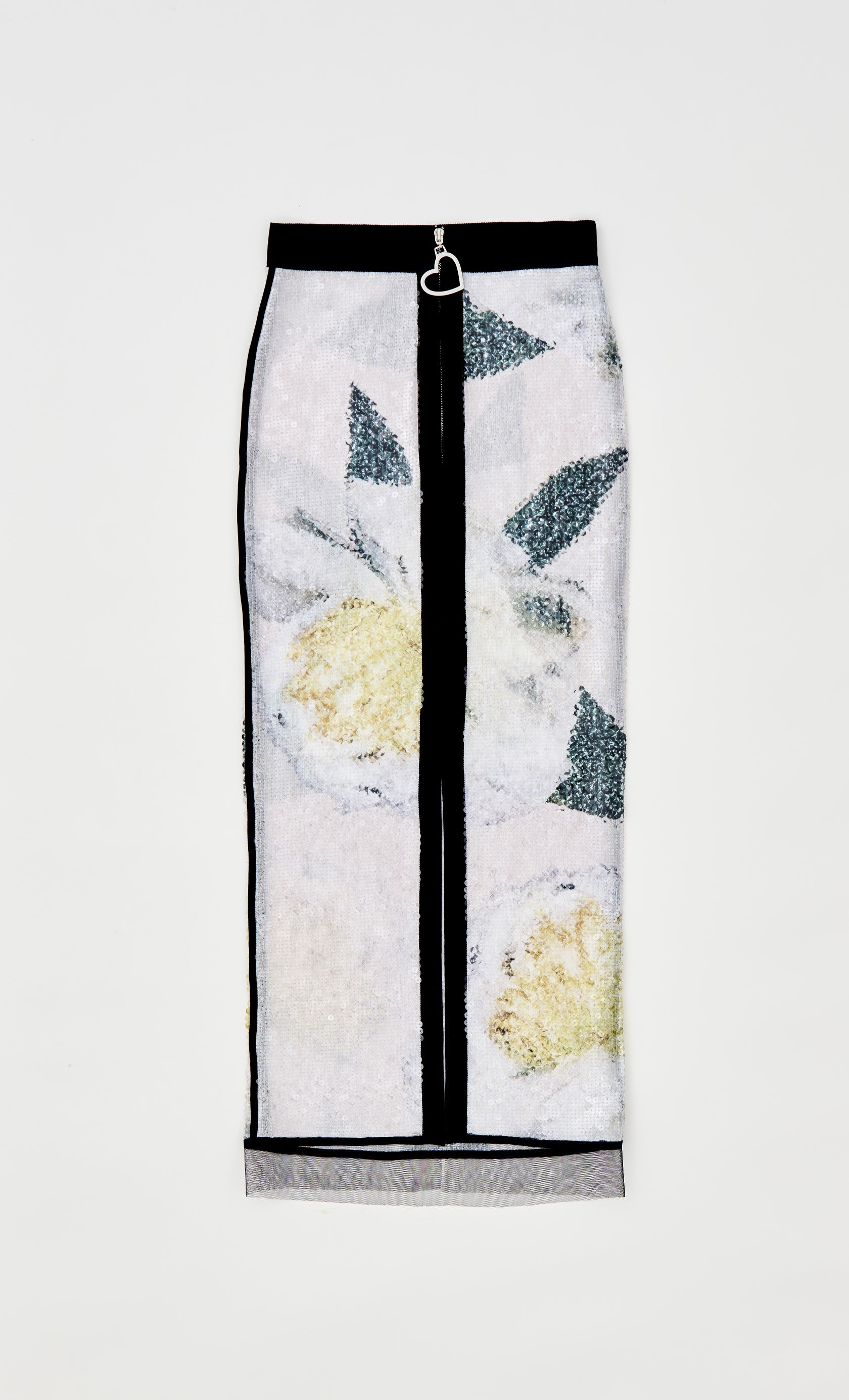 FALDA TUBO DE LENTEJUELAS TRANSPARENTES ESTAMPADAS, REMATADA CON MULTIPLES VIVOS A CONTRASTE EN COLOR NEGRO. CINTURILLA DE GROSGRAIN CON CREMALLERA METALICA CORAZON EN LA ESPALDA. BAJO ADORNADO CON UNA TIRA DE TUL NEGRA.
