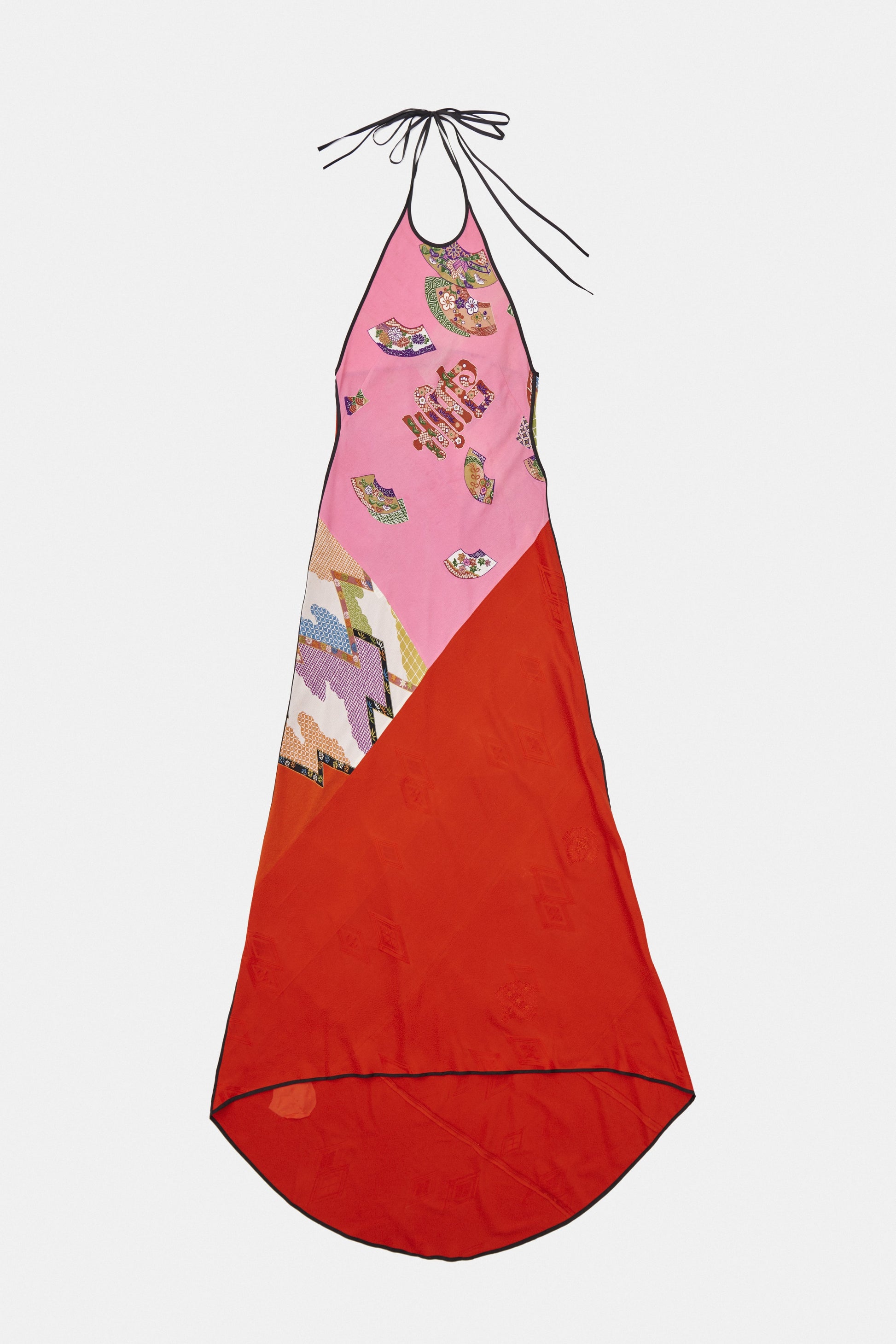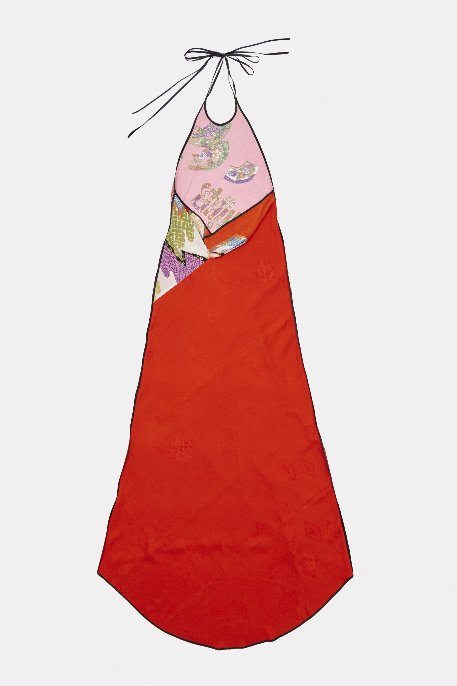 - Kimono Haroi naranja tostado, el Haroi es un kimono tradicional corto por lo cual se han usado dos Haroi diferentes para la confección del vestido al bies.