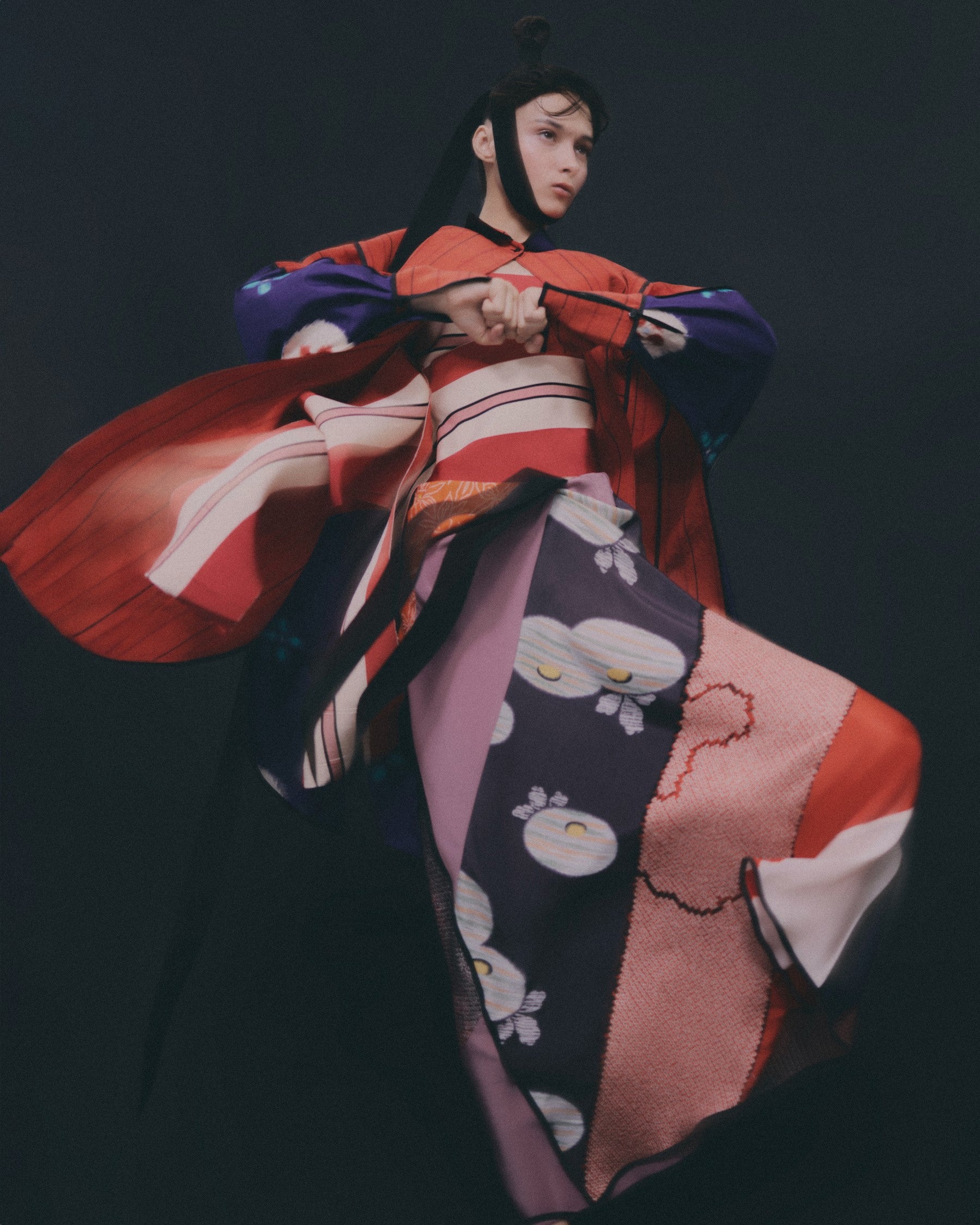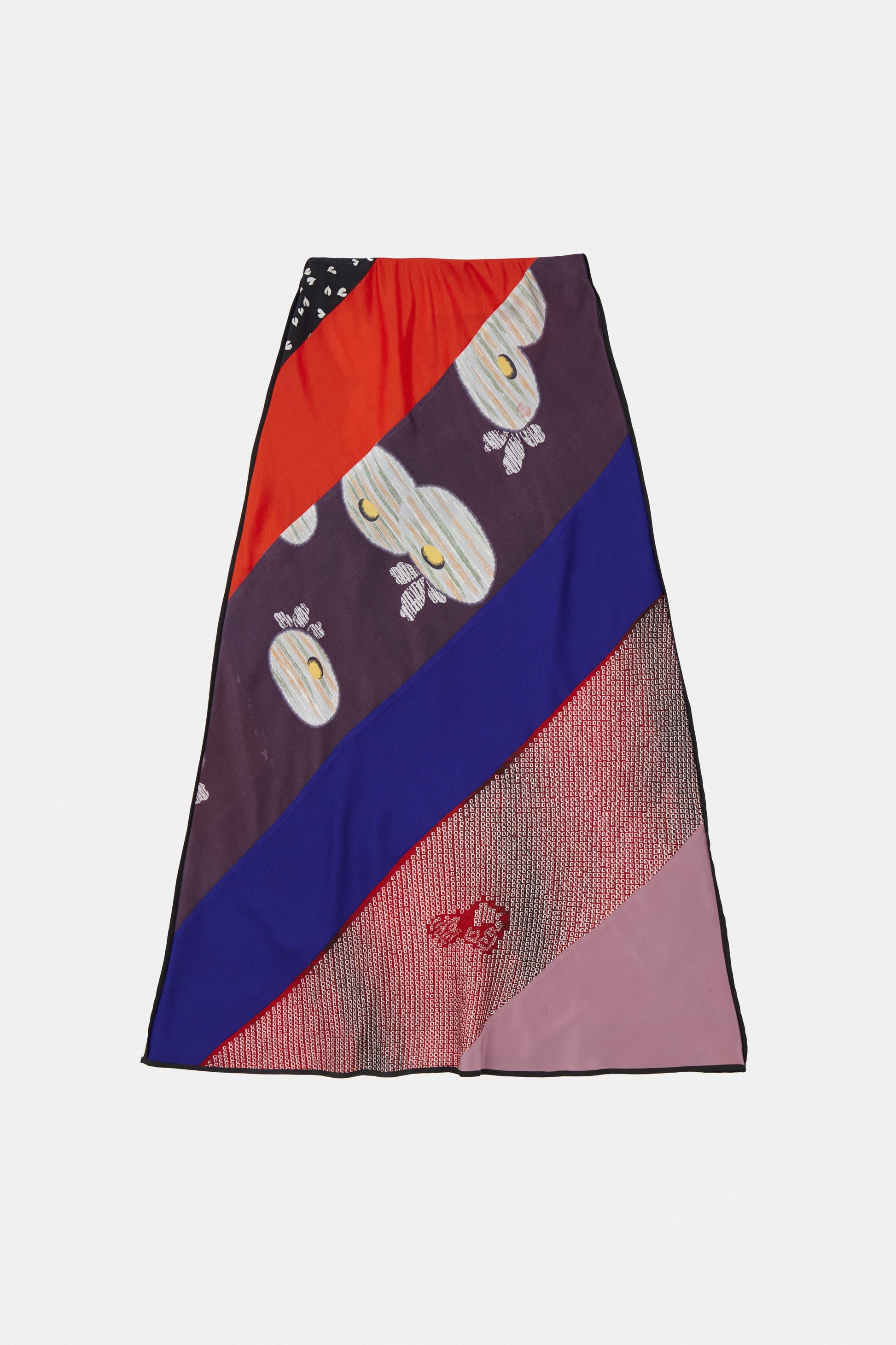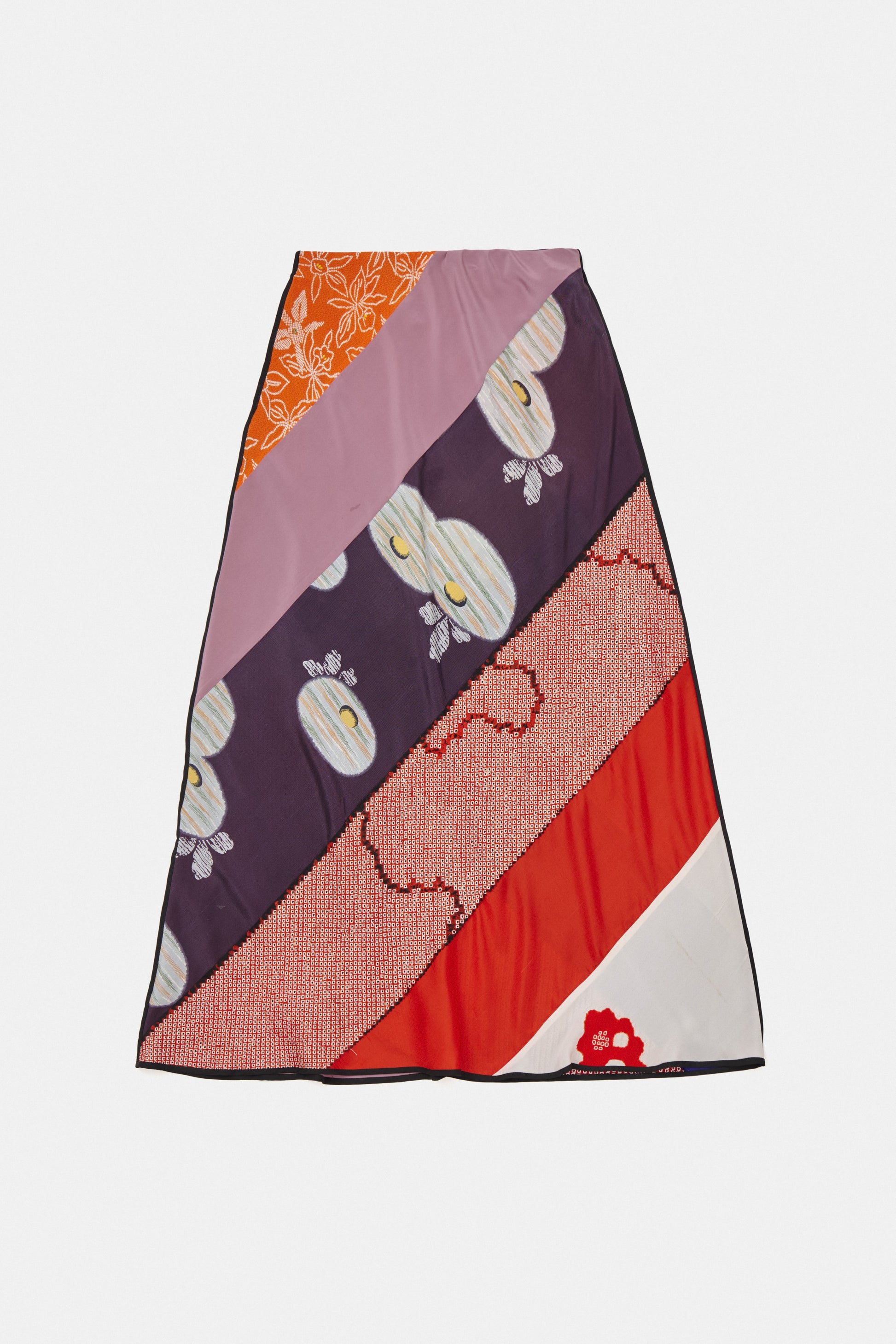 Falda larga realizada a  a partir de paneles extraídos del desmontaje de varios kimonos antiguos de seda, ensamblados a. Modorre patchwork diagonal.