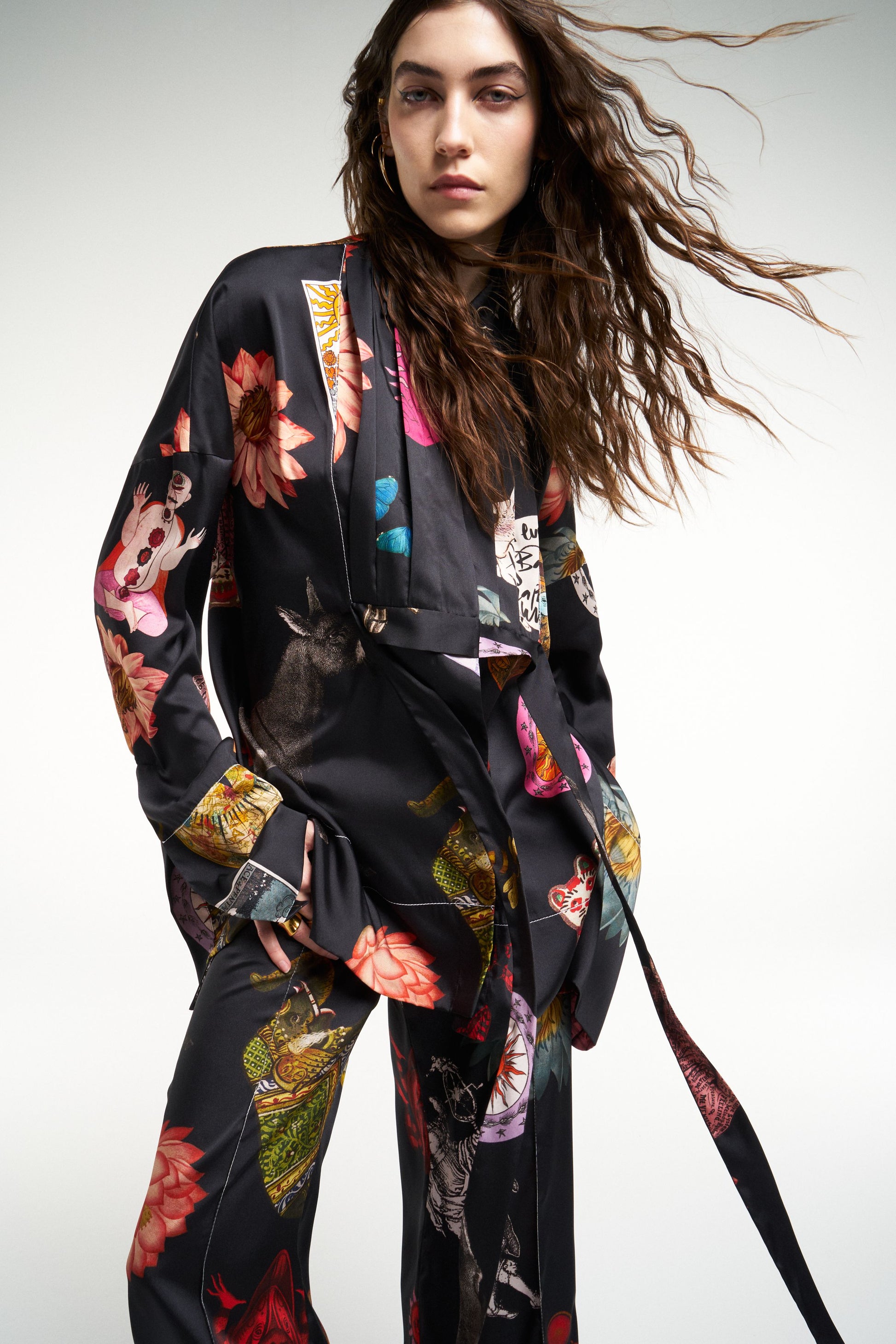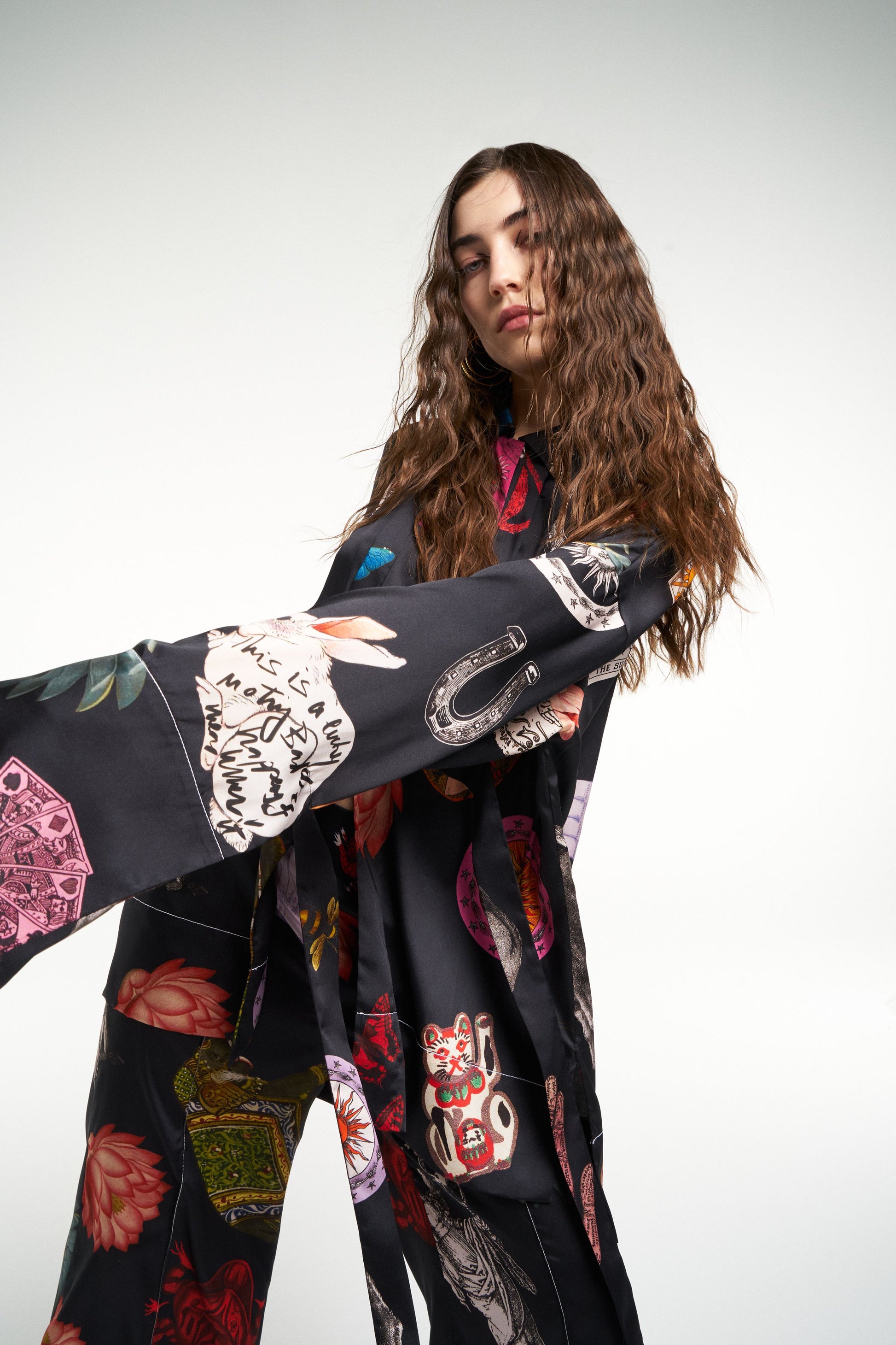 CAMISA OVERSIZED CON PECHERA Y CUELLO ESMOQUIN. MANGAS EXTRA LARGAS CON GRANDES ABERTURAS. DETALLE DE CINTURÓN CAÍDO A MODO DE CINTAS QUE SE PUEDEN ANUDAR A LA CINTURA PARA GENERAR UNA VESTIBILIDAD MÁS ENTALLADA. PESPUNTES DECORATIVOS A CONTRASTE EN DIVERSAS ZONAS.