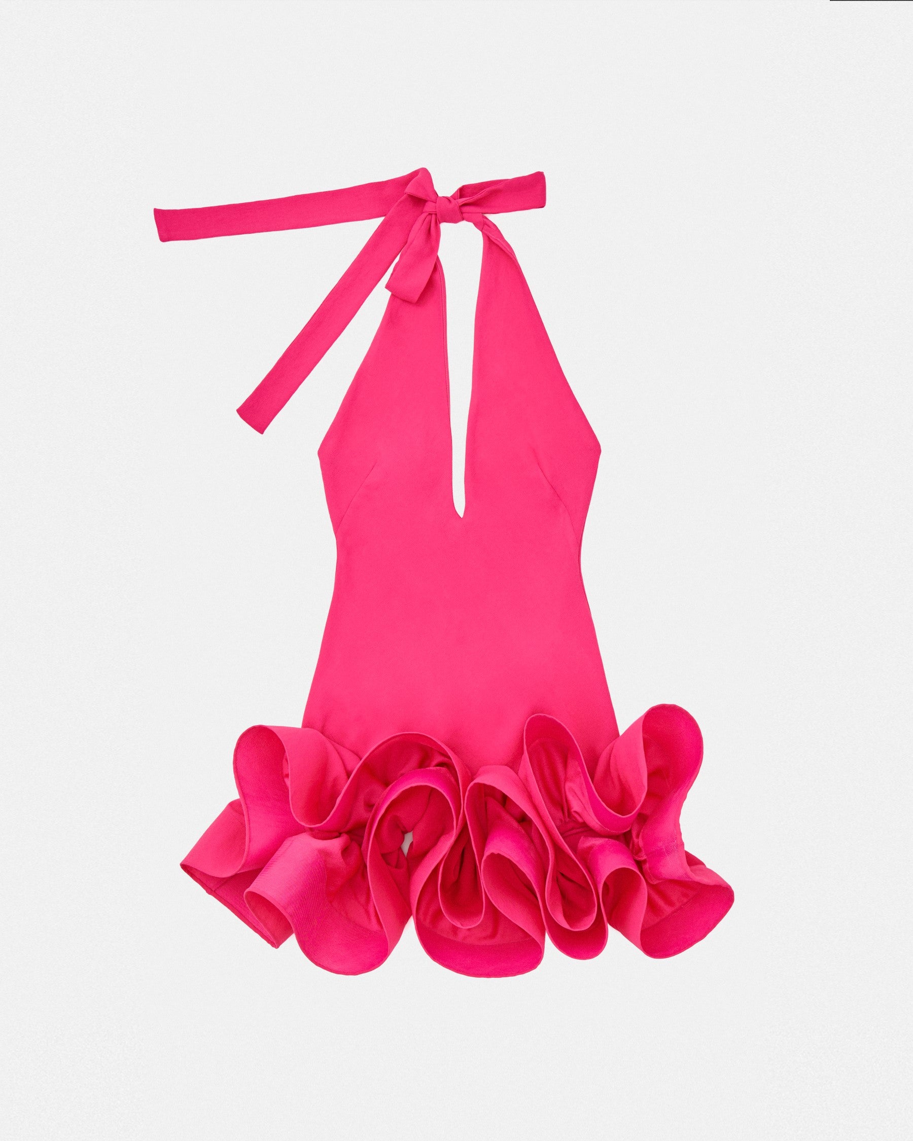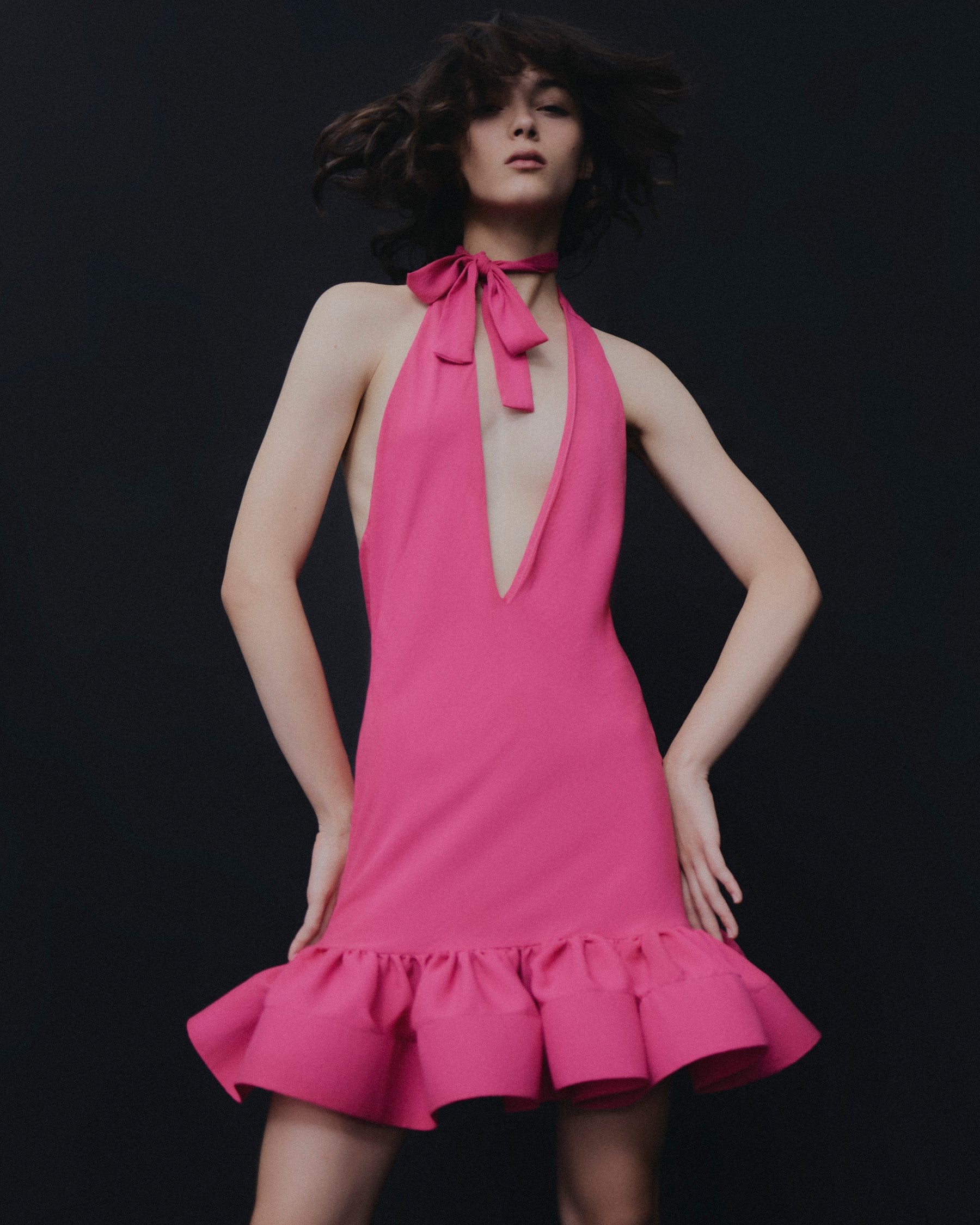 Vestido mini al bies con escote Halter y espalda desnuda.