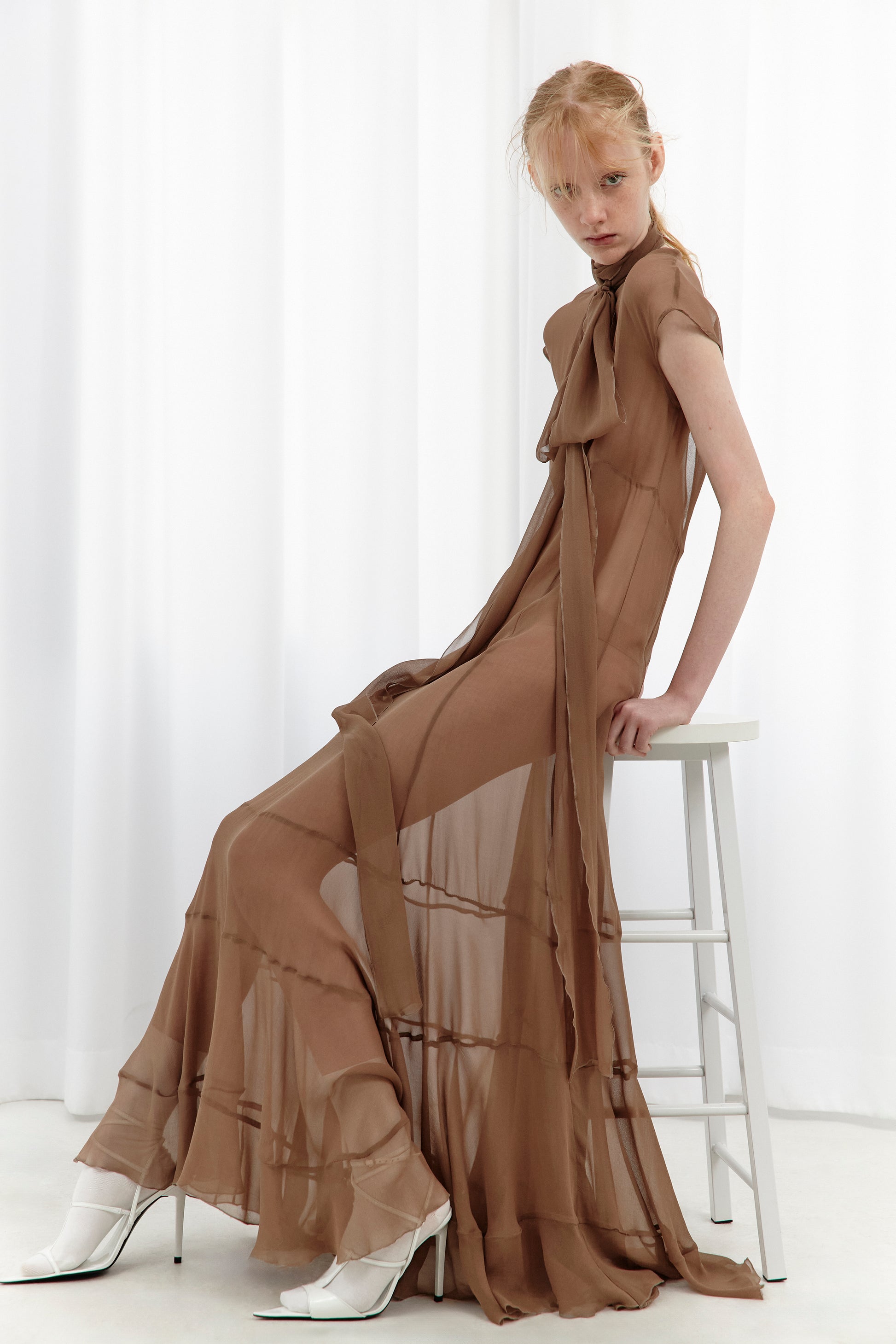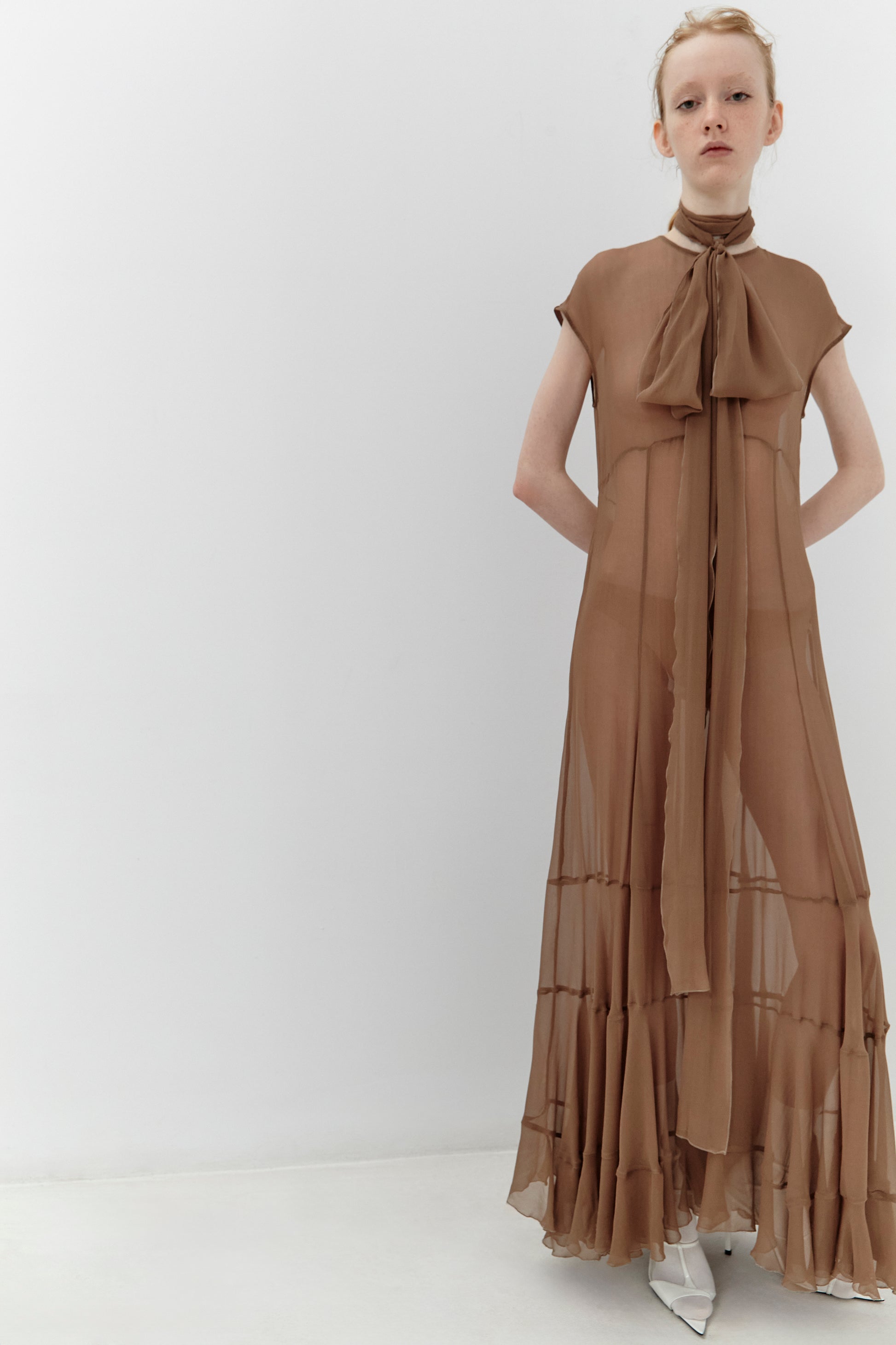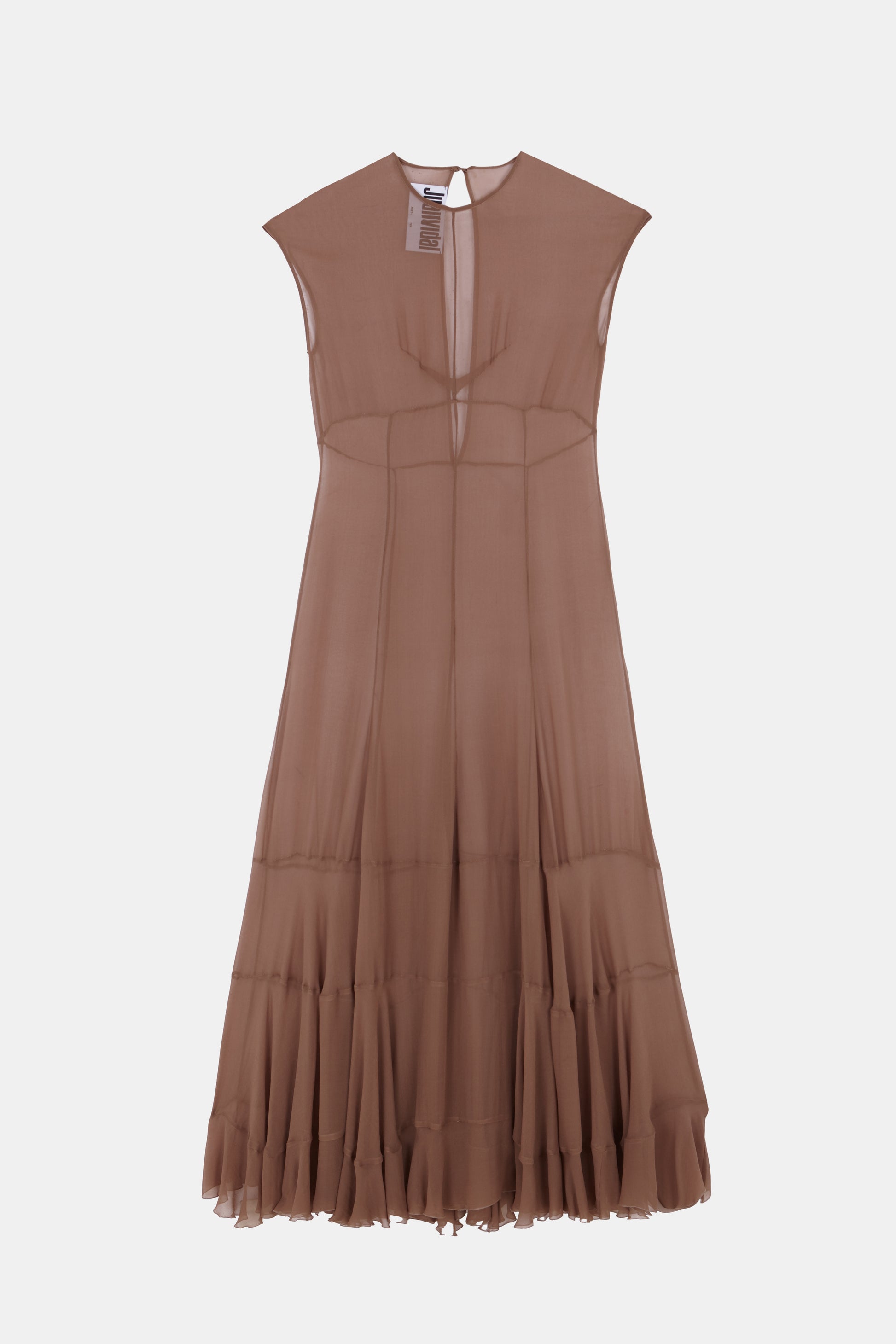 VESTIDO DE VUELO EN SEDA CON LAZADA Y FALDA CON PISOS DE PIEZAS CIRCULARES EN EL BAJO.