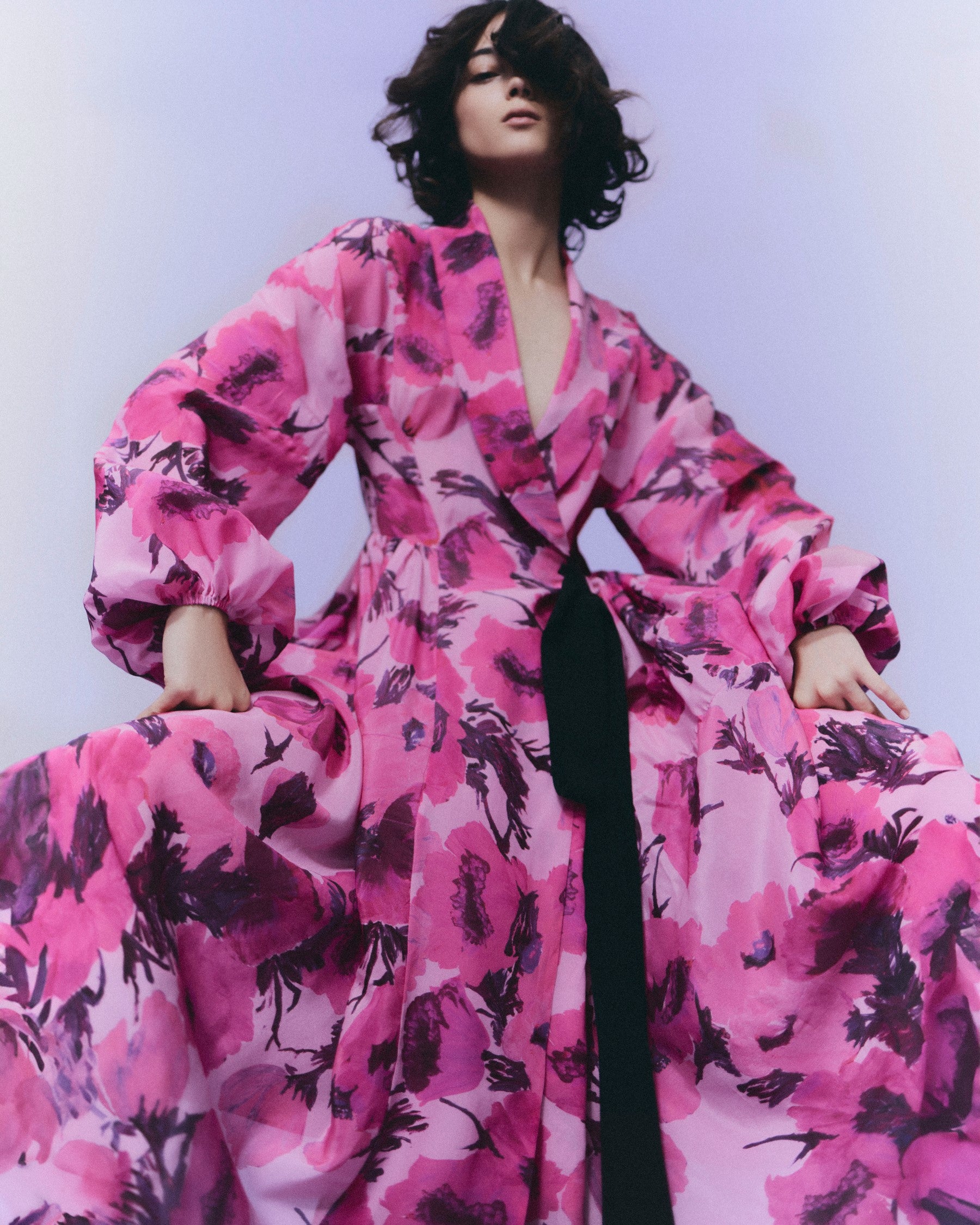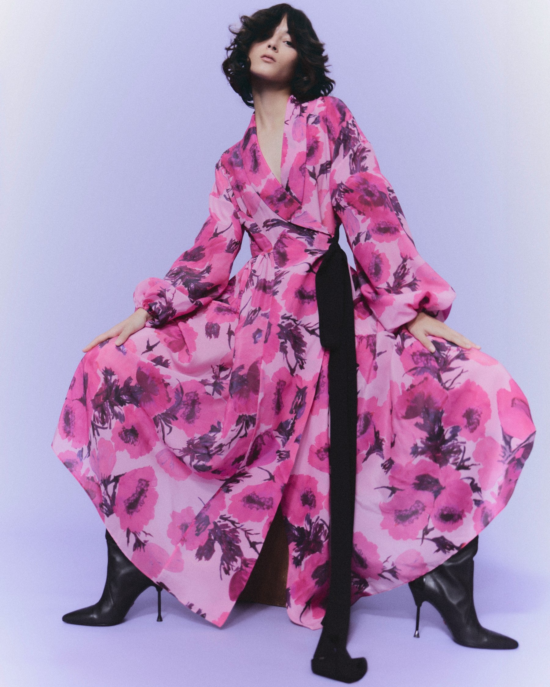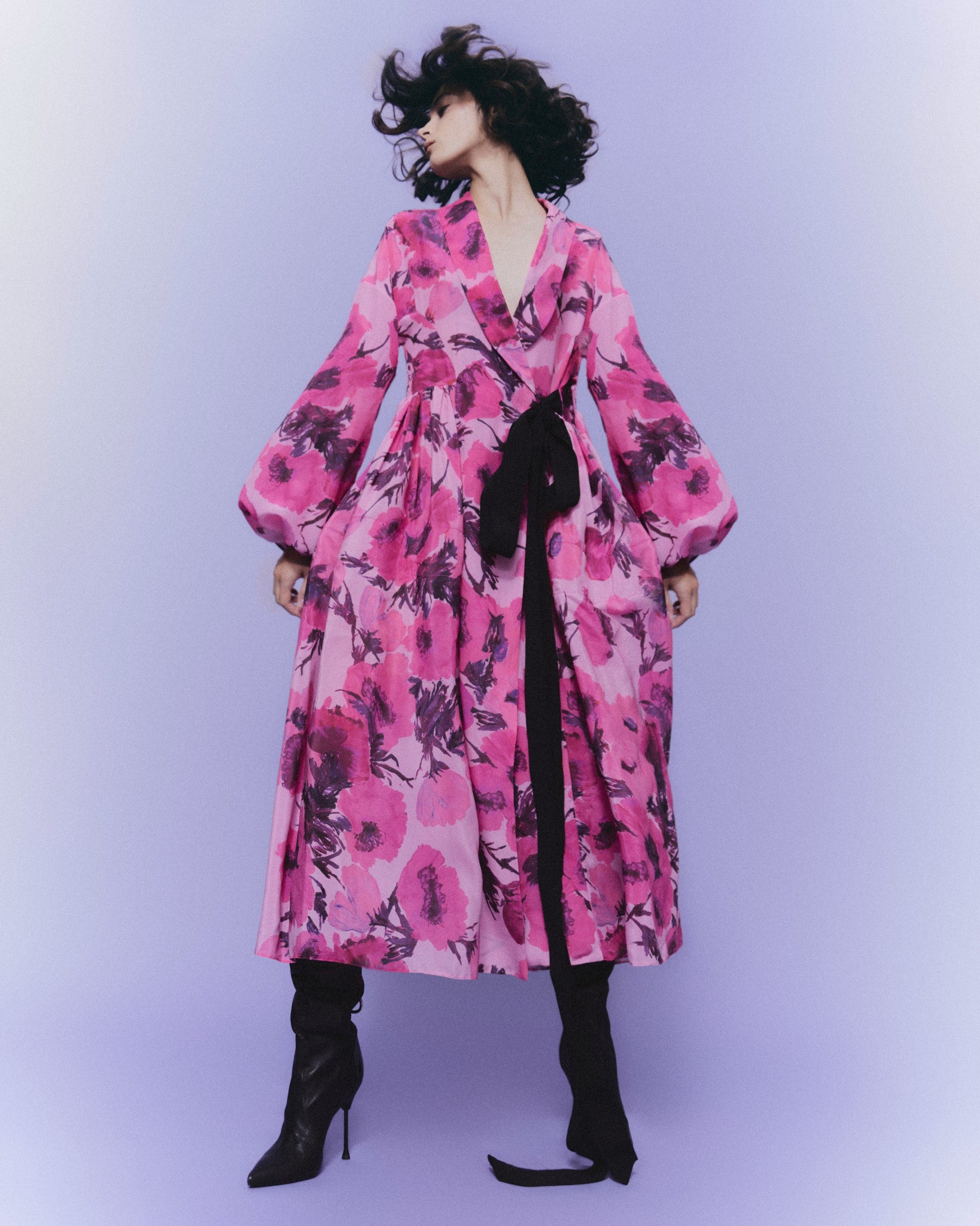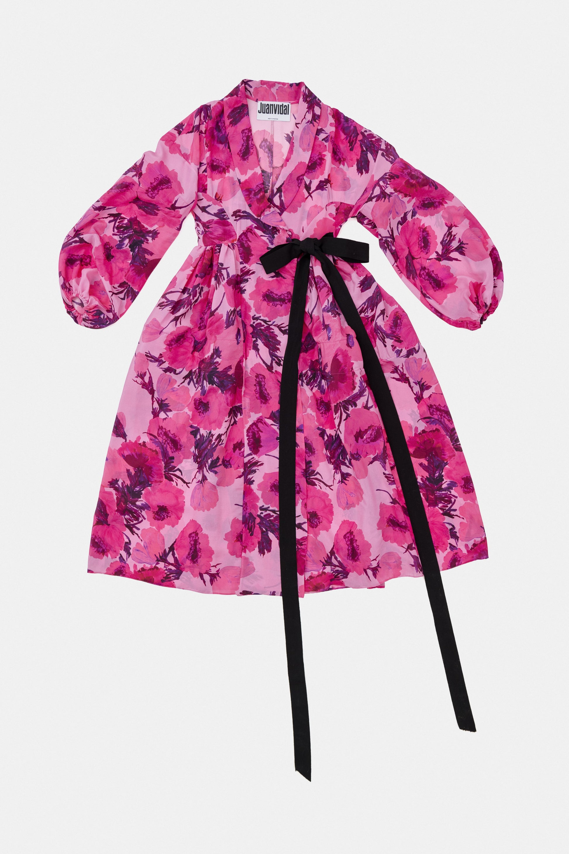 Vestido wrap camisero cortado en cintura, manga larga ablusada y falda de vuelo. Escote en V con solapa smoking que desemboca en un lazo de grosgrain a contraste. Para sostener el volumen el vestido lleva refuerzos de crin interiores.