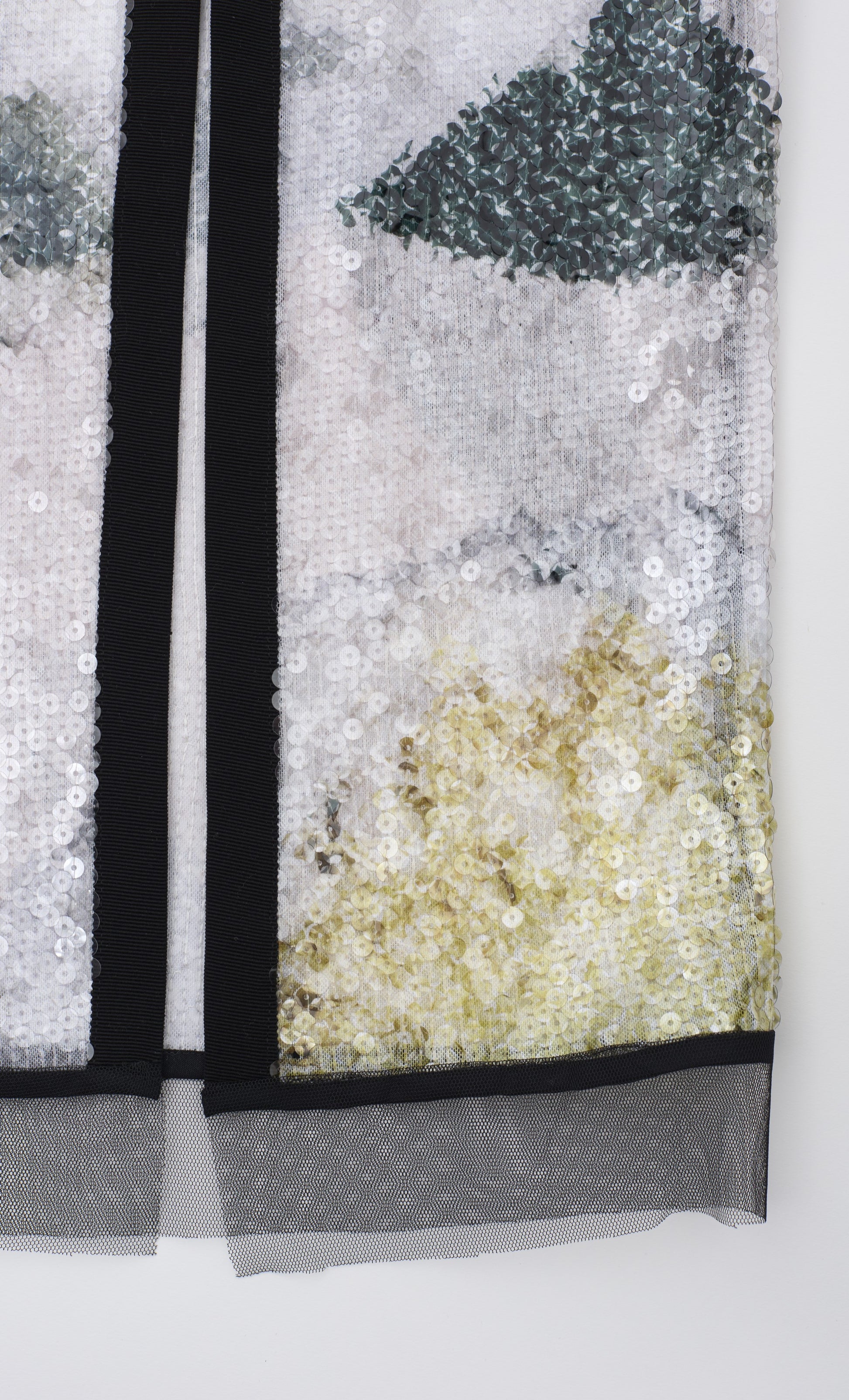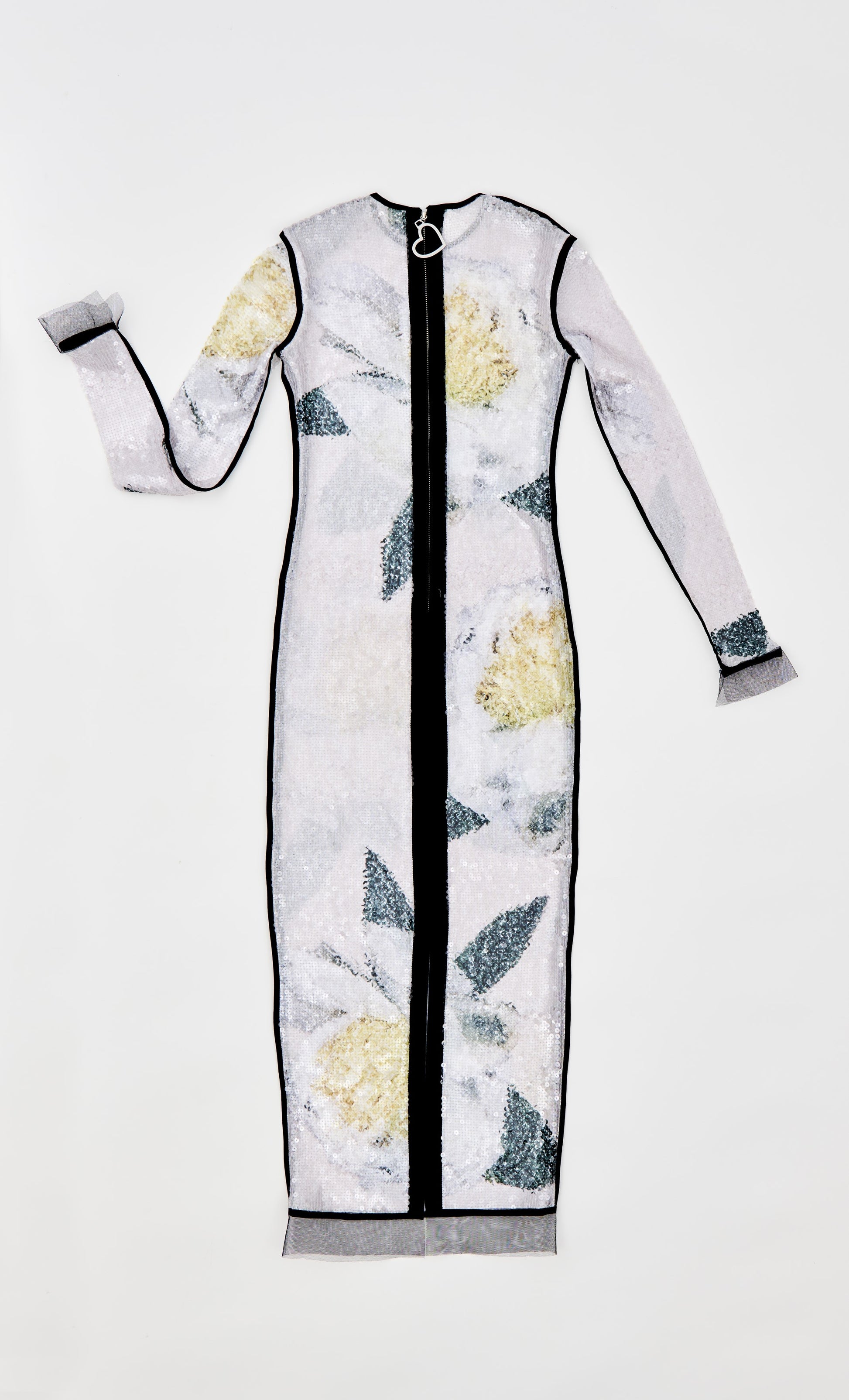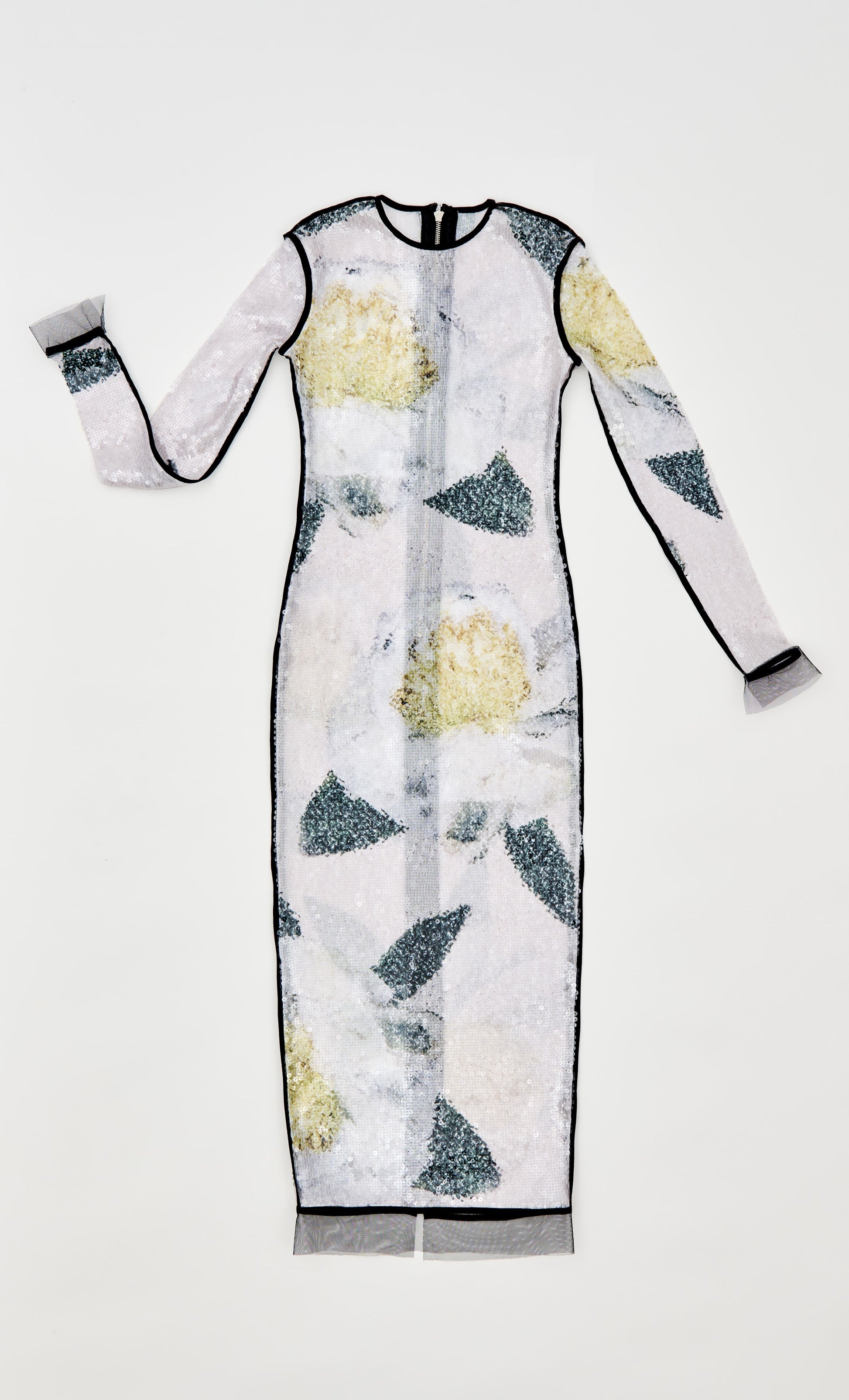 VESTIDO MIDI DE MANGA LARGA Y CUELLO REDONDO, REALIZADO EN LENTEJUELAS TRANSPARENTES ESTAMPADAS, REMATADO CON VIVOS A CONTRASTE COLOR NEGRO. SE CIERRA EN LA ESPALDA CON CREMALLERA METALICA CORAZON. BAJO ADONADO CON TUL NEGO.