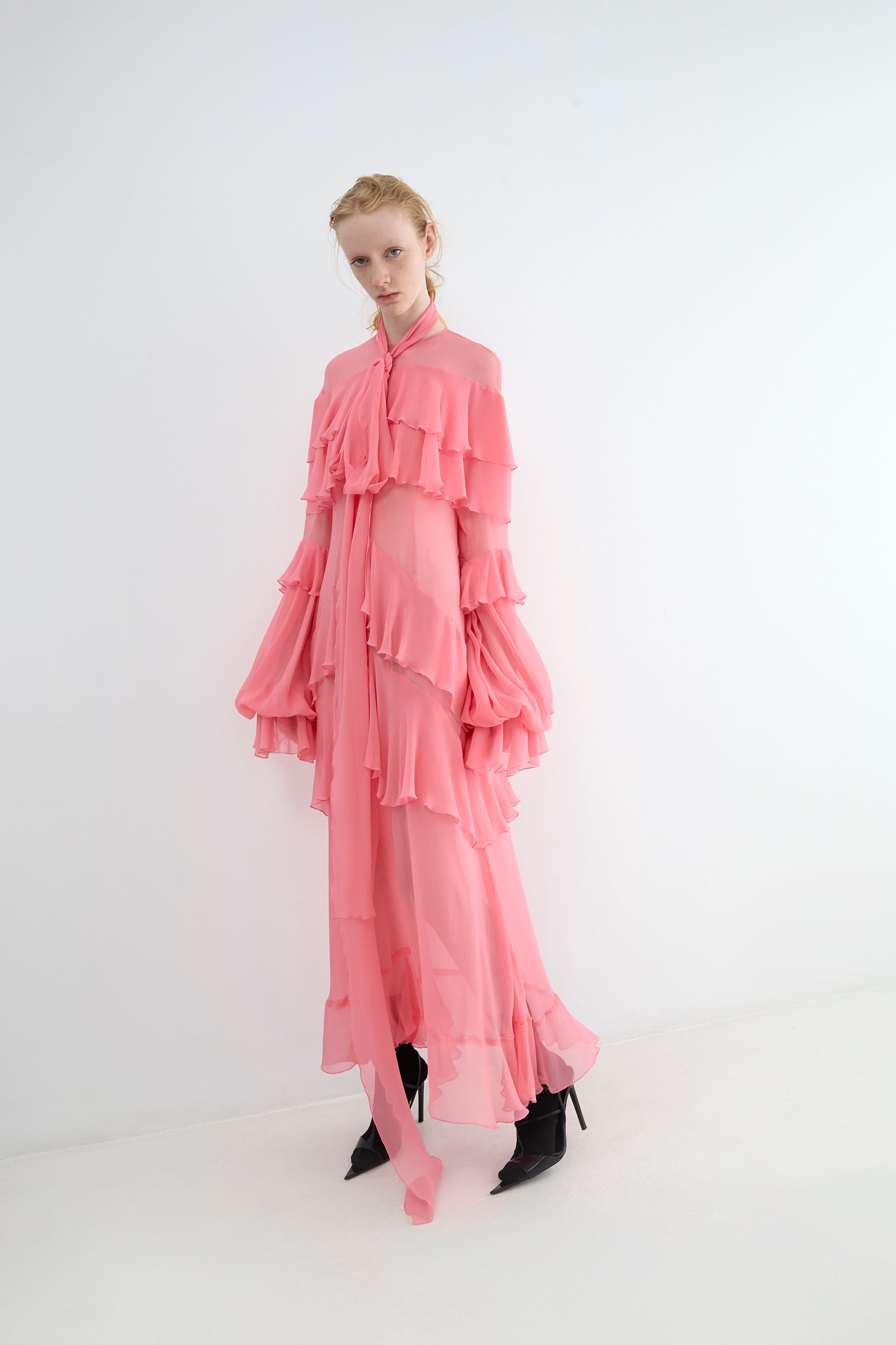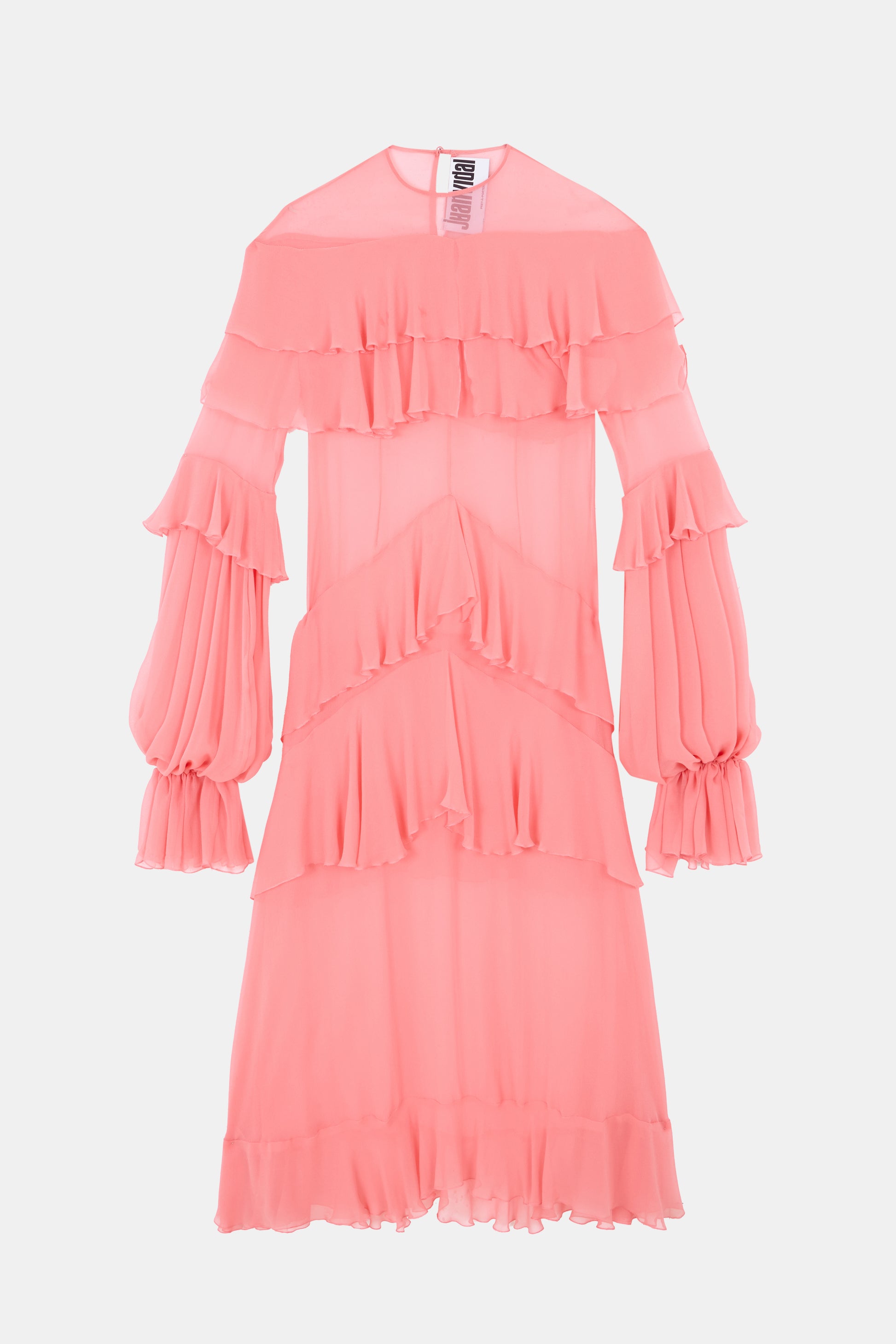 VESTIDO SEMIENTALLADO CON VOLANTES EN VARIAS DIRECCIONES, CONFECCIONADO EN GASA DE SEDA.