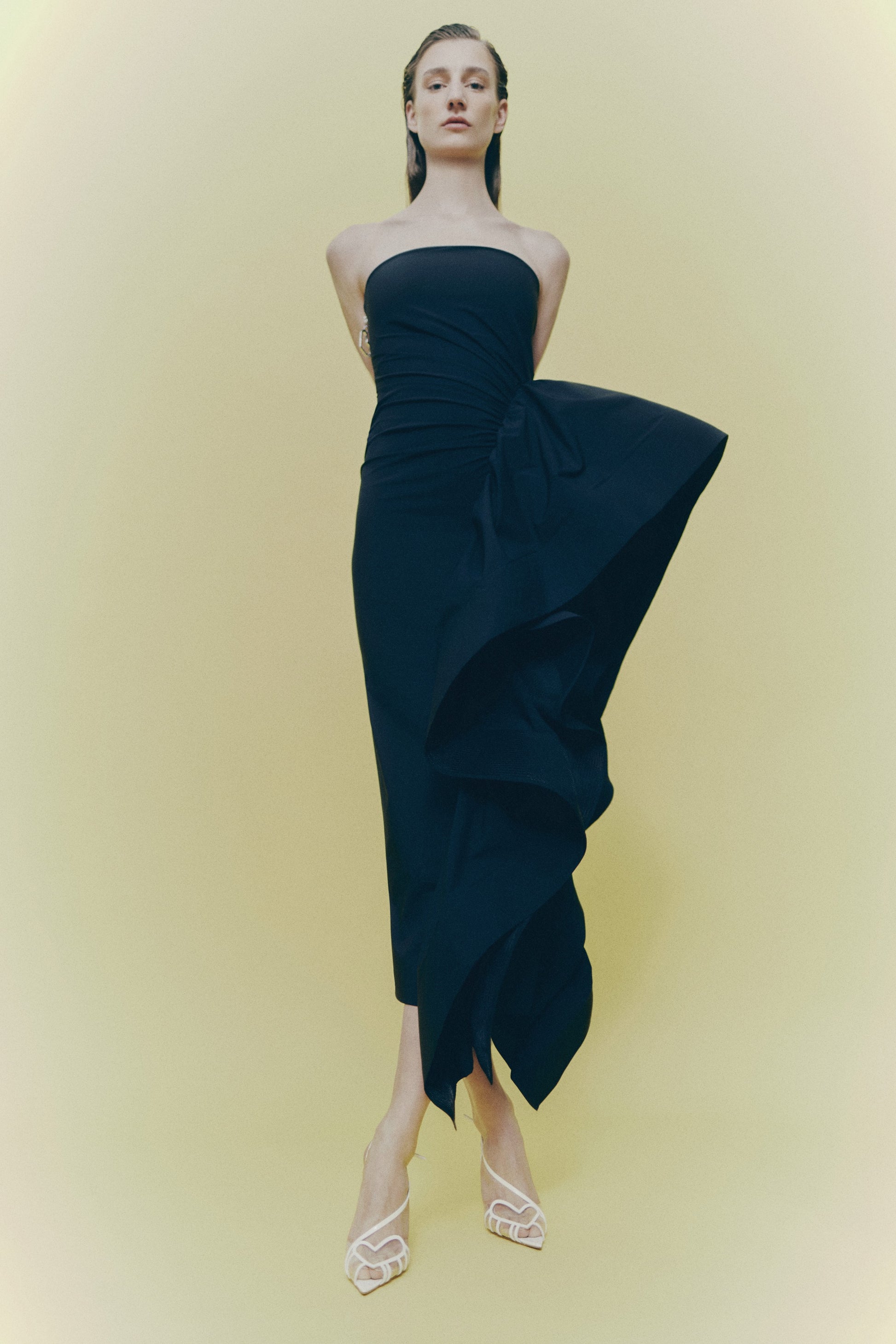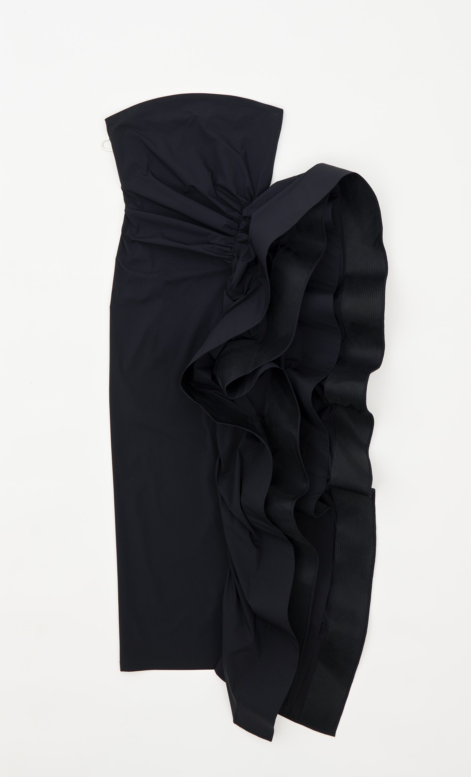 VESTIDO ELÁSTICO LARGO TOBILLO, CON ESCOTE PALABRA DE HONOR, PEQUEÑO FRUNCIDO EN UN LATERAL QUE DESEMBOCA EN UN VOLANTE DOBLE CON FORMA DE U DECORANDO DELANTERO Y TRASERO, EL MAXI VOLANTE ESCONDE UNA ABERTURA LATERAL. EL VESTIDO SE CIERRA CON UNA CREMALLERA METÁLICA CORAZÓN JUAN VIDAL EN EL LADO OPUESTO, YA QUE DELANTERO Y ESPALDA SON IGUALES. SE PUEDE REALIZAR EN TODOS LOS COLORES DEL. MISMO TEJIDO DISPONIBLES EN LA WEB.