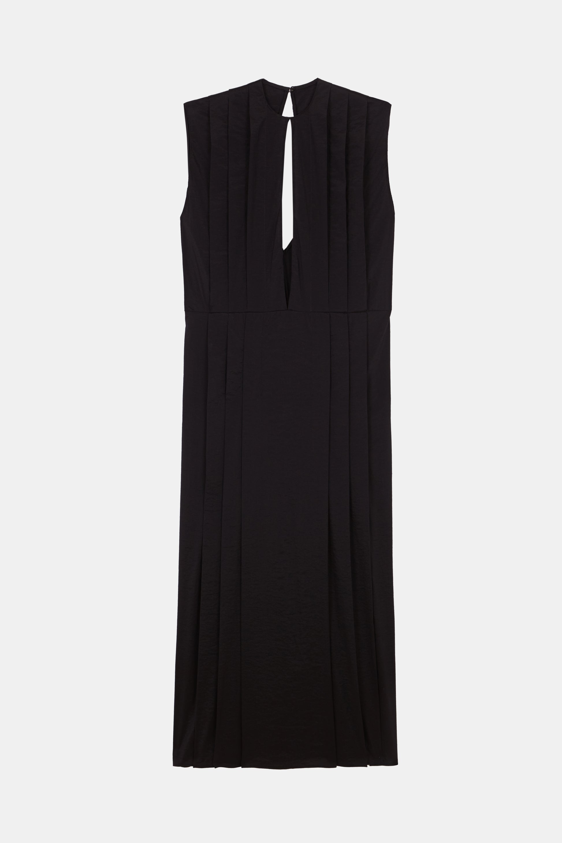 VESTIDO RECTO DE TABLAS, CON LAGRIMA EN ESCOTE DELANTERO Y ESPALDA. EN LA PARTE INFERIOR TIENE UNA DOBLE APERTURA. REALIZADO EN TEJIDO TECNICO.