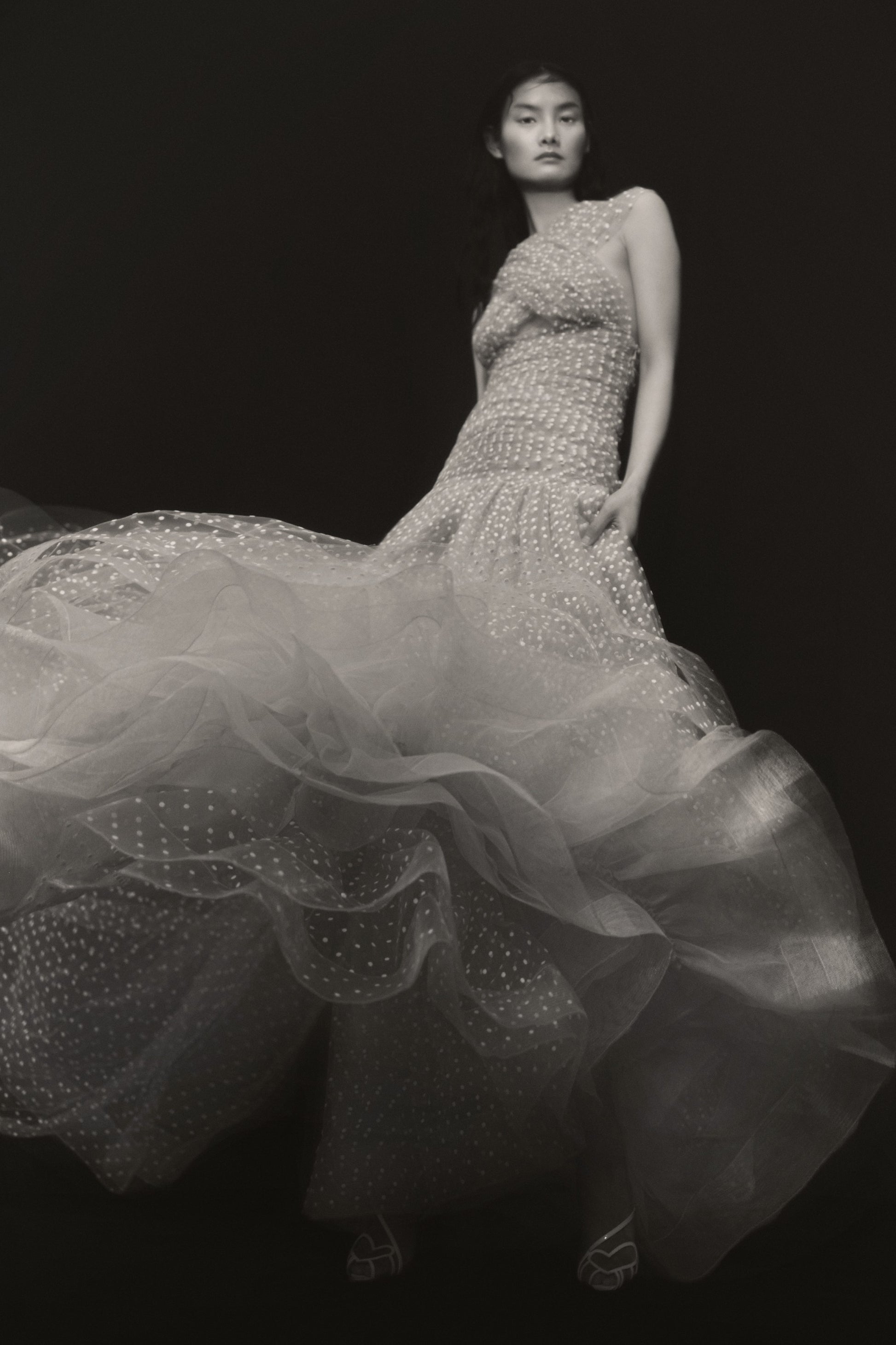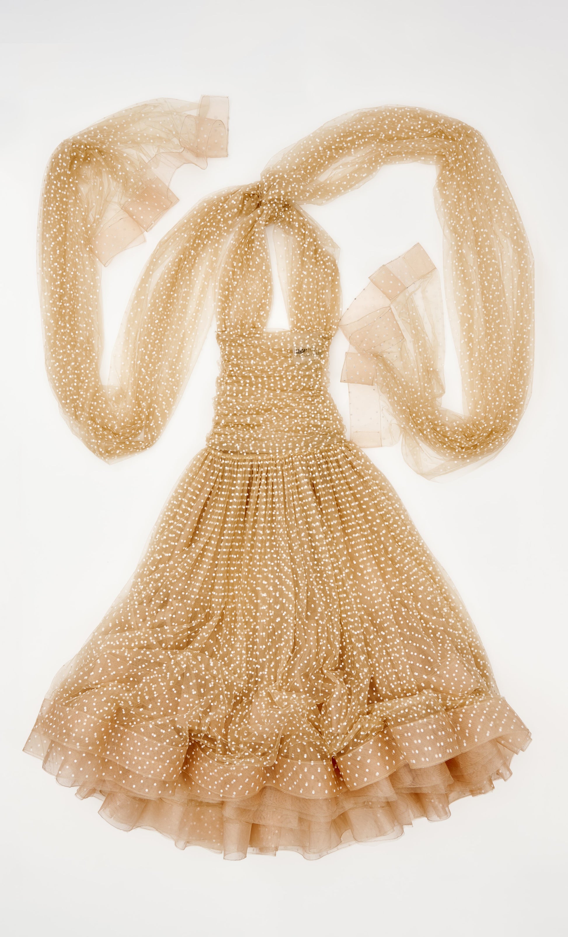 VESTIDO LARGO DE TUL PLUMETI COLOR ARENA, CON EL POIS EN CONTRASTE COLOR CRUDO. PIEZA CENTRAL DEL VESTIDO DRAPEADA, FALDA DE VUELO CON VARIAS CAPAS DE TUL Y VOLANTES INTERIORES, Y PARTE SUPERIOR CON DOS BANDAS ANCHAS QUE CUBREN EL PECHO Y SE ANUDAN EN LA ESPALDA A MODO DE CAPA.