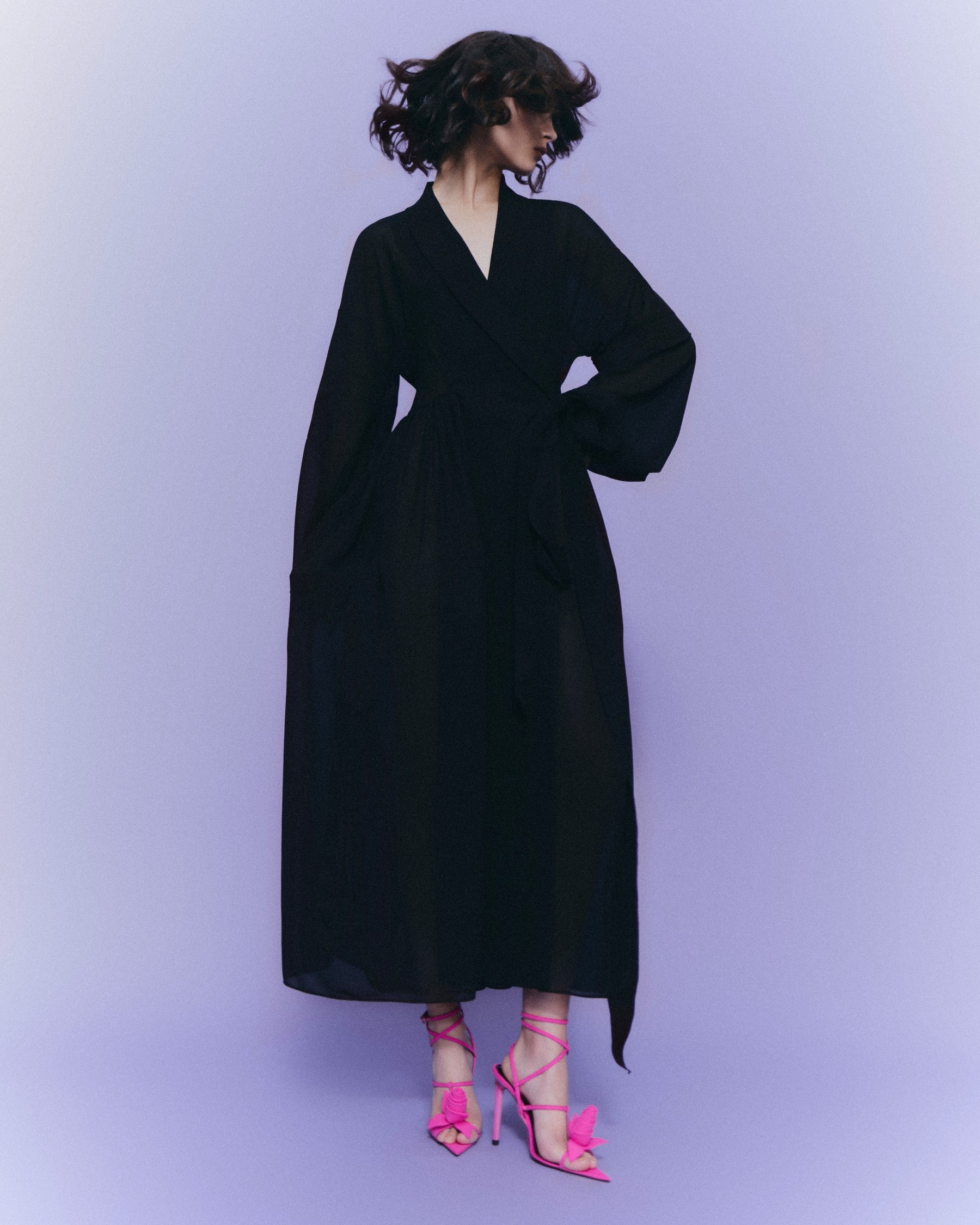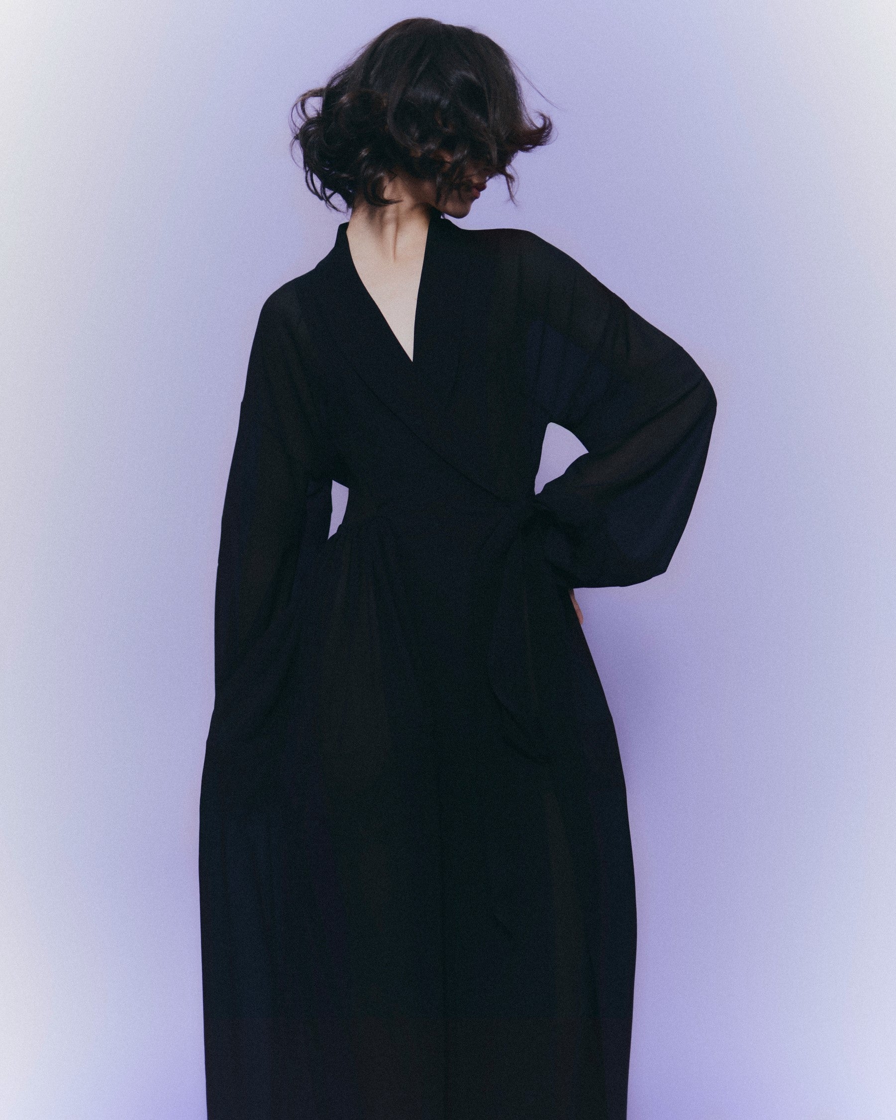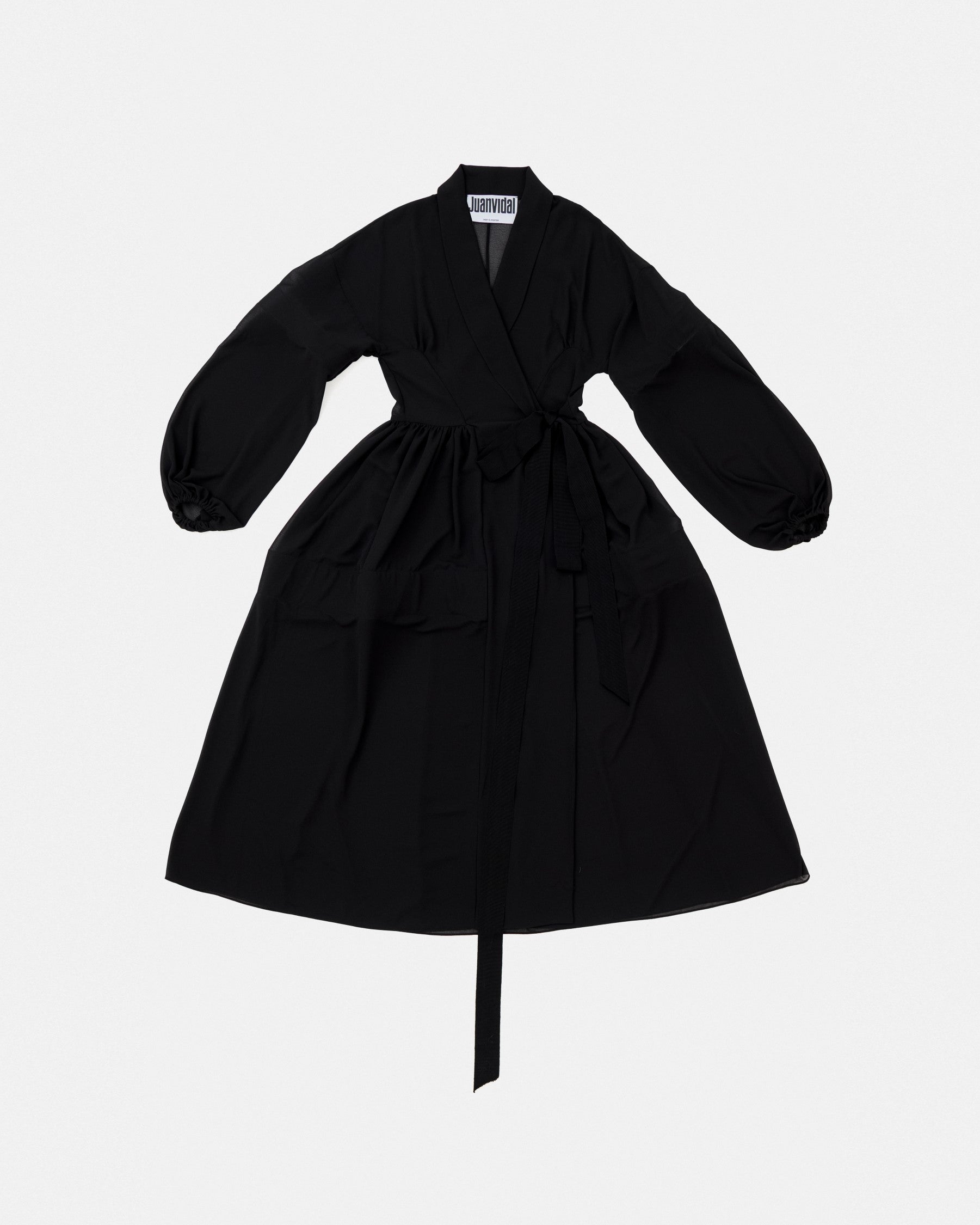 Vestido wrap camisero cortado en cintura, manga larga ablusada y falda de vuelo. Escote en V con solapa smoking que desemboca en un lazo de grosgrain a contraste. Para sostener el volumen el vestido lleva refuerzos de crin interiores.