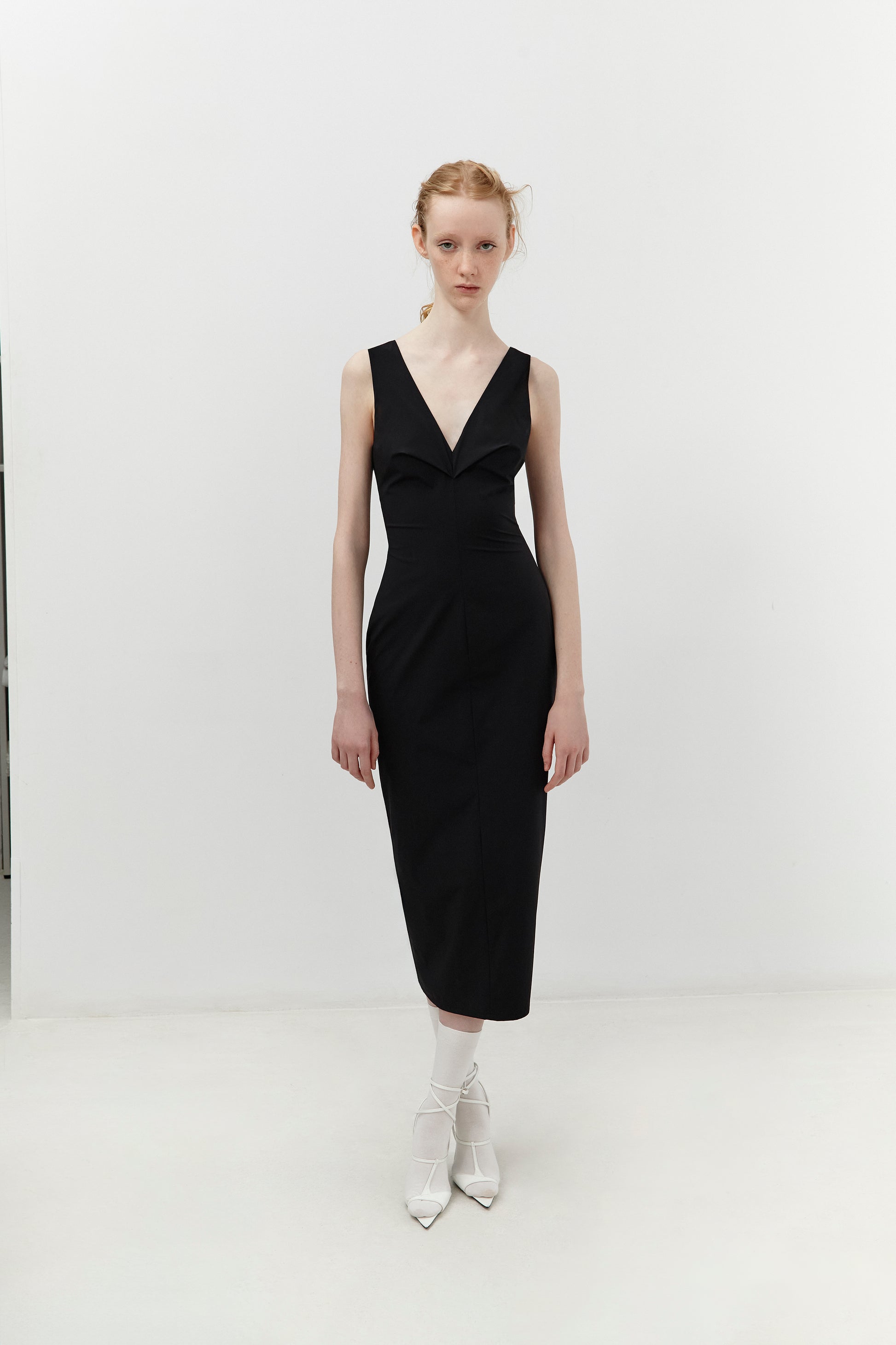 VESTIDO ESCOTE EN V FRONTAL, ESCOTE EN U Y VOLANTES VERTICALES EN LA ESPALDA.