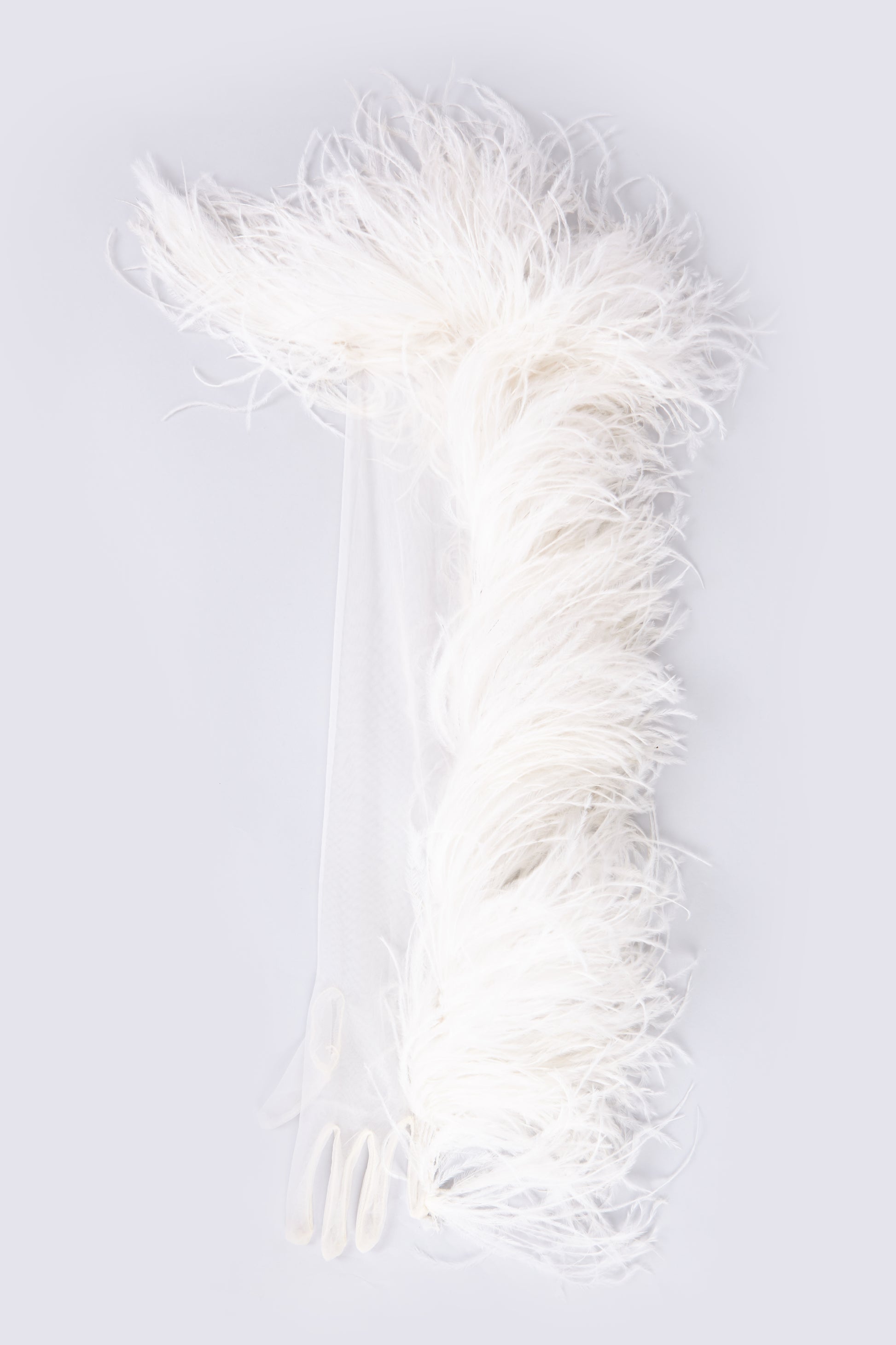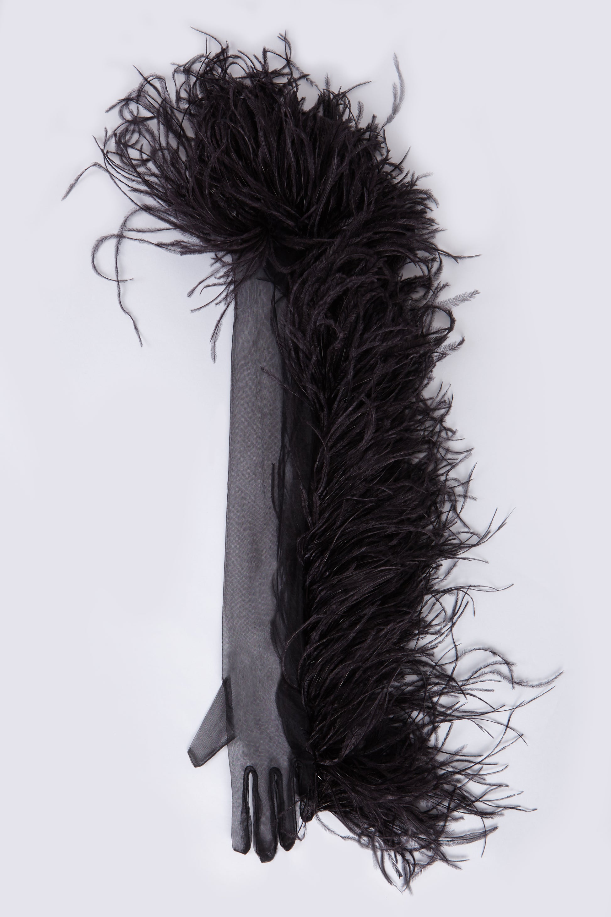 GUANTES LARGOS DE TUL CON PLUMAS DE AVESTRUZ BORDADAS.