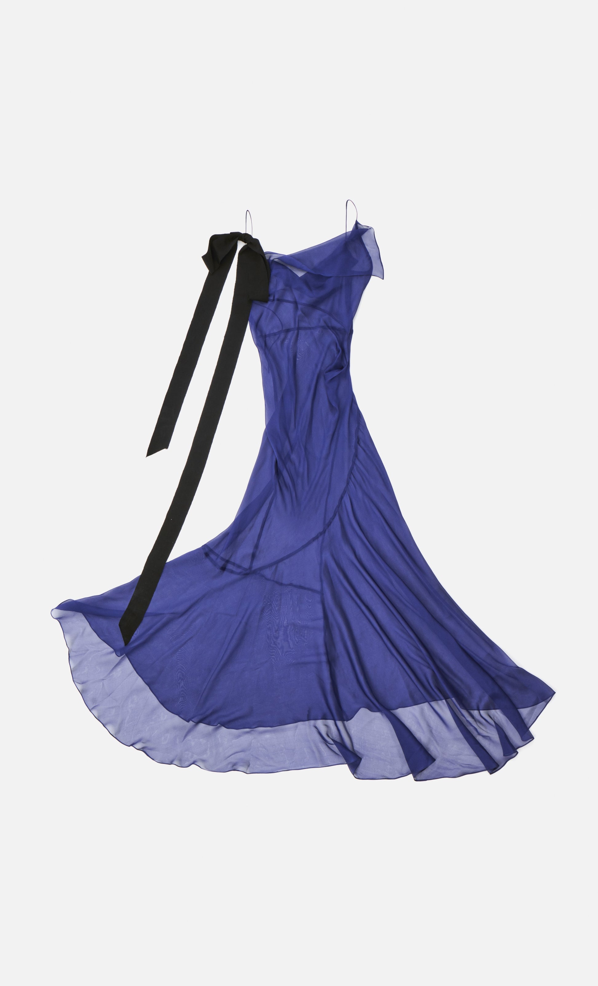 Vestido largo asimétrico cortado al bies con escote frontal y de espalda drapeado. La falda tiene un corte diagonal con una pieza media capa y volumen en un lateral. Un tirante se decora con un lazo de grosgrain negro.