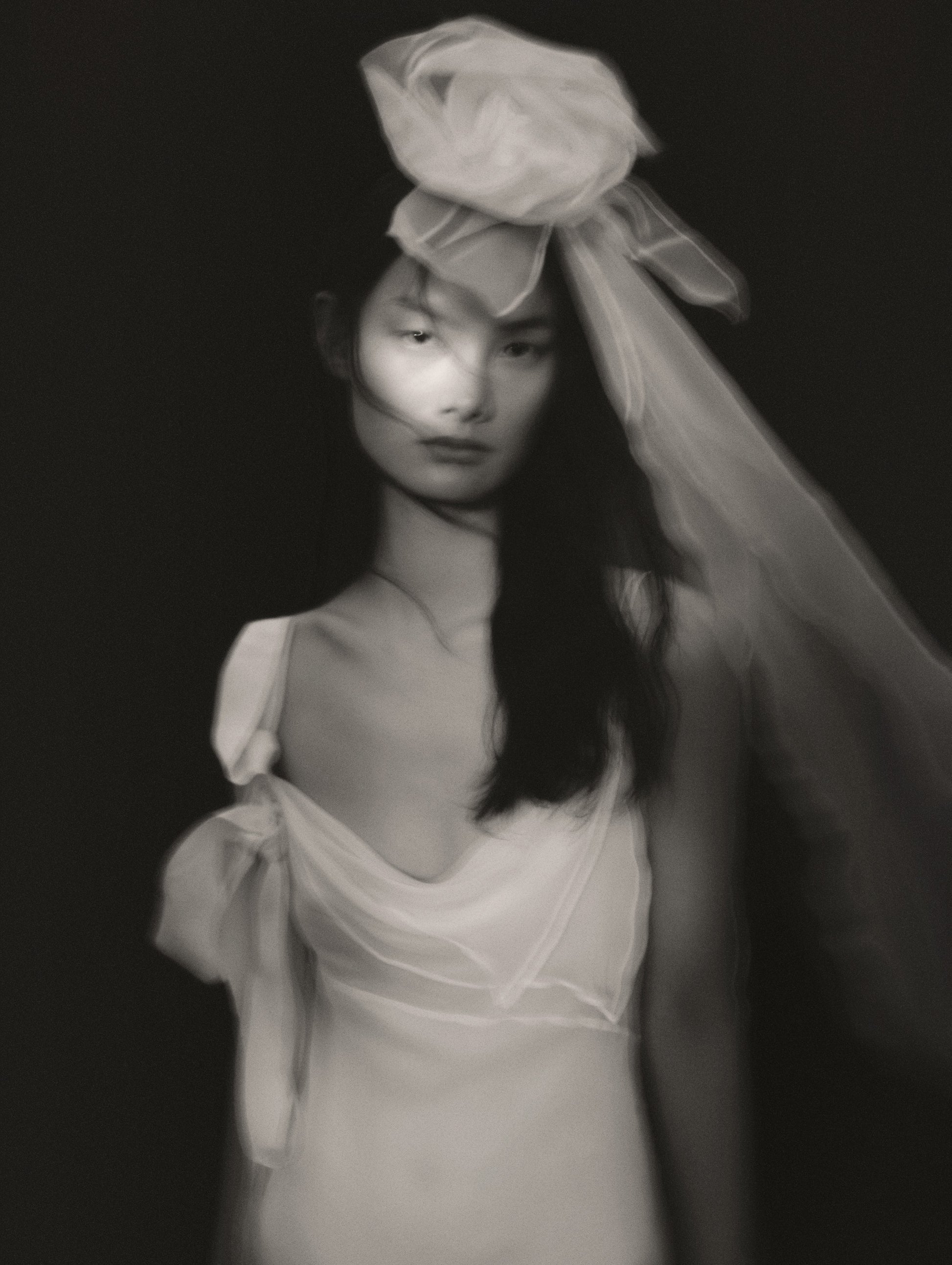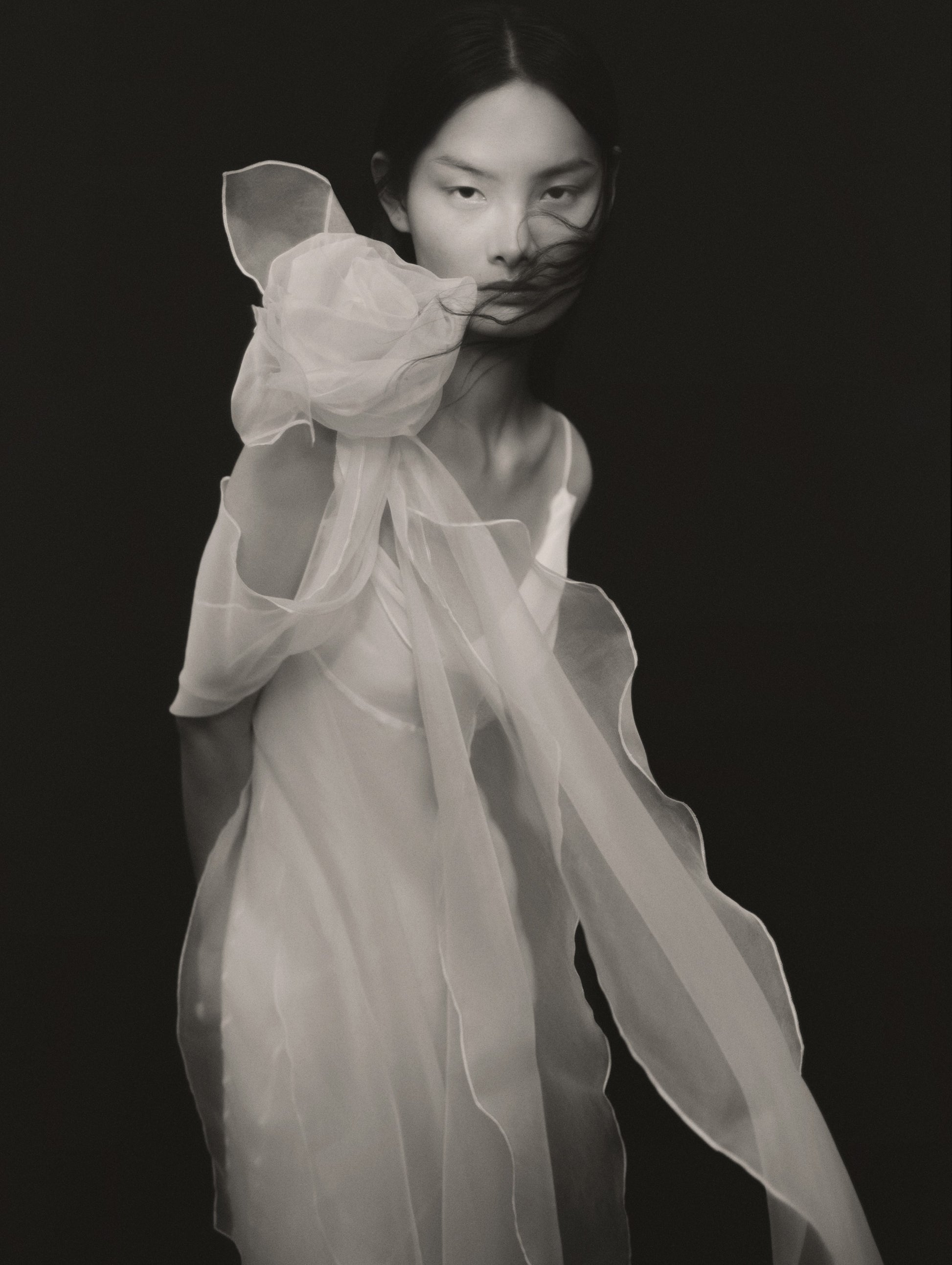 VESTIDO LENCERO DE GASA DE SEDA, CON ESCOTE DRAPEADO Y LAZO A MODO DE FLOR REALIZADO EN ORGANZA SITUADA EN UNO DE LOS TIRANTES. DE LA FLOR CAEN VARIAS BANDAS DE TEJDO SOBRE EL CUERPO.