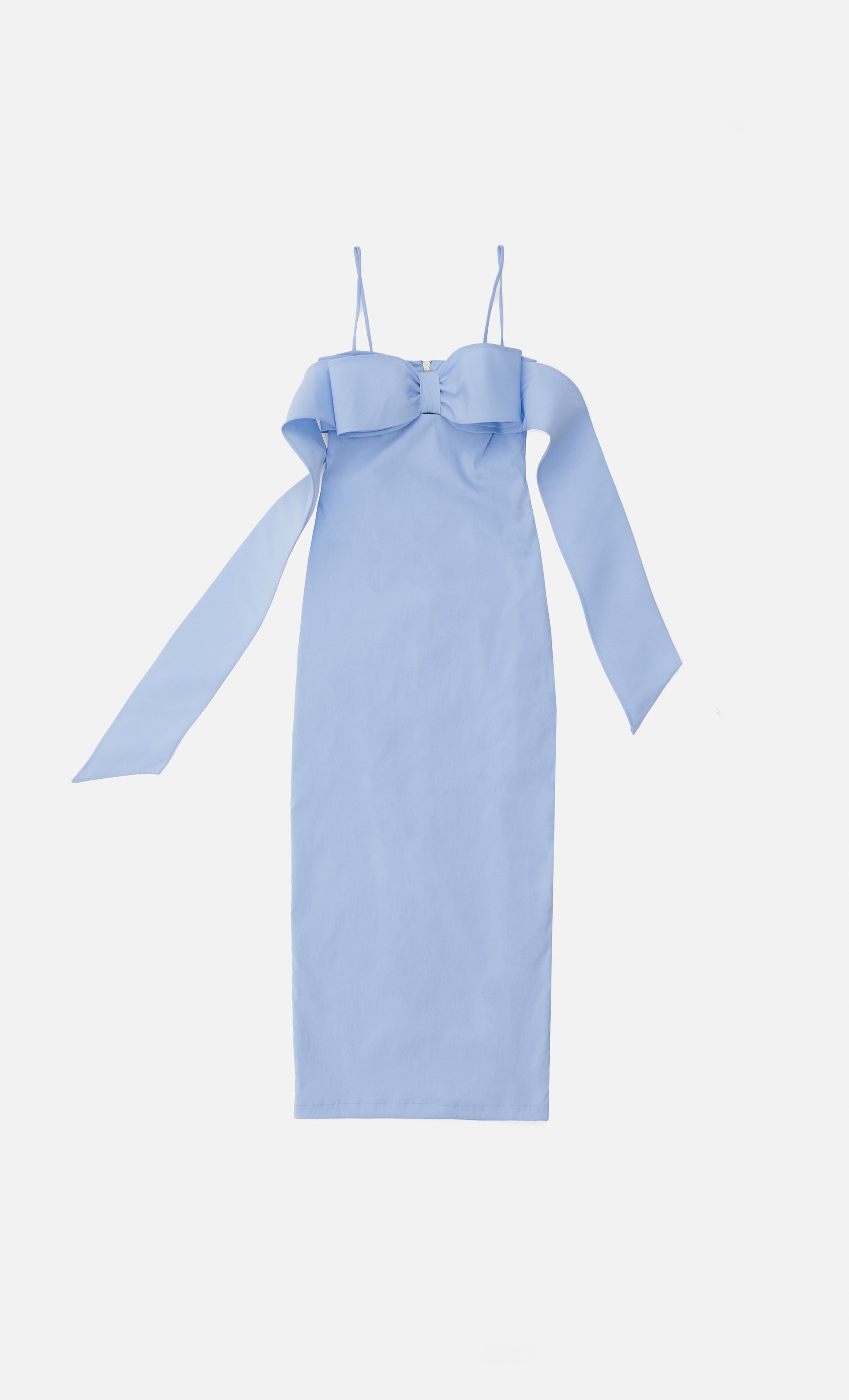 Vestido elástico entallado largo con detalle frontal en forma de lazo que recorre los lateras del vestido y recoge la pieza superior del pecho.  LAs vagas del lazo caen de forma aleatoria a ambos lados del cuerpo. Se puede usar con y sin tirante espagueti.