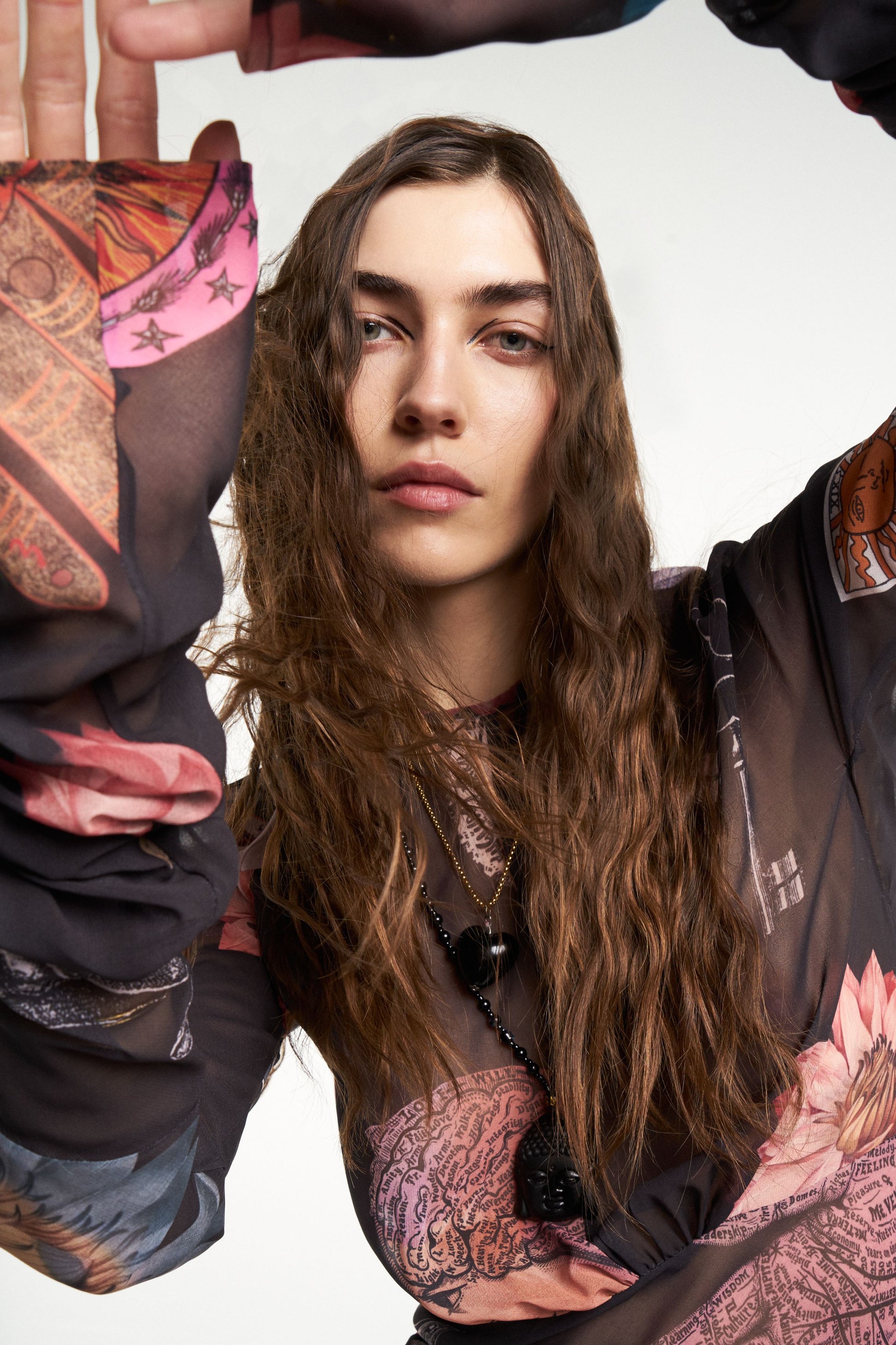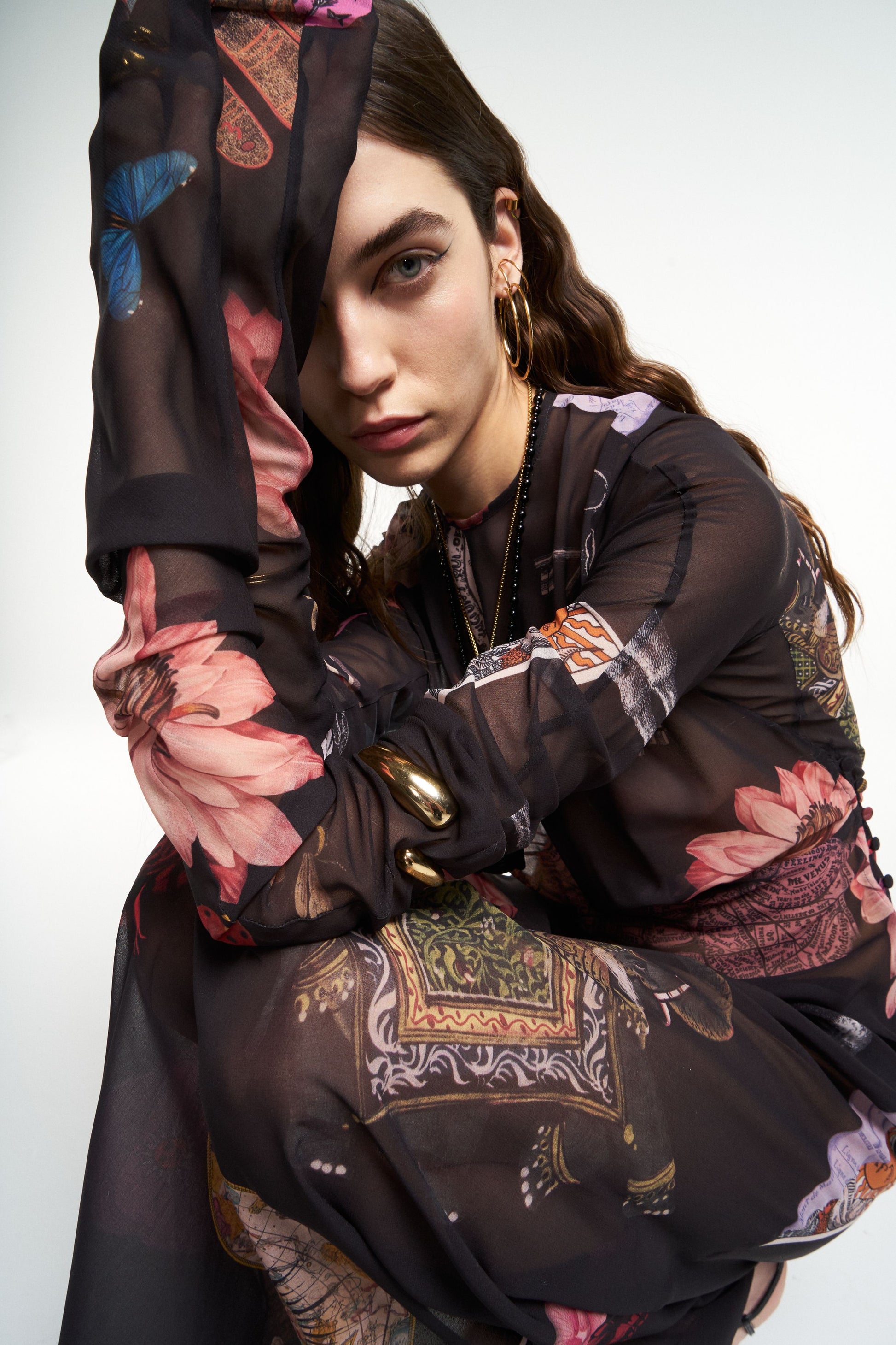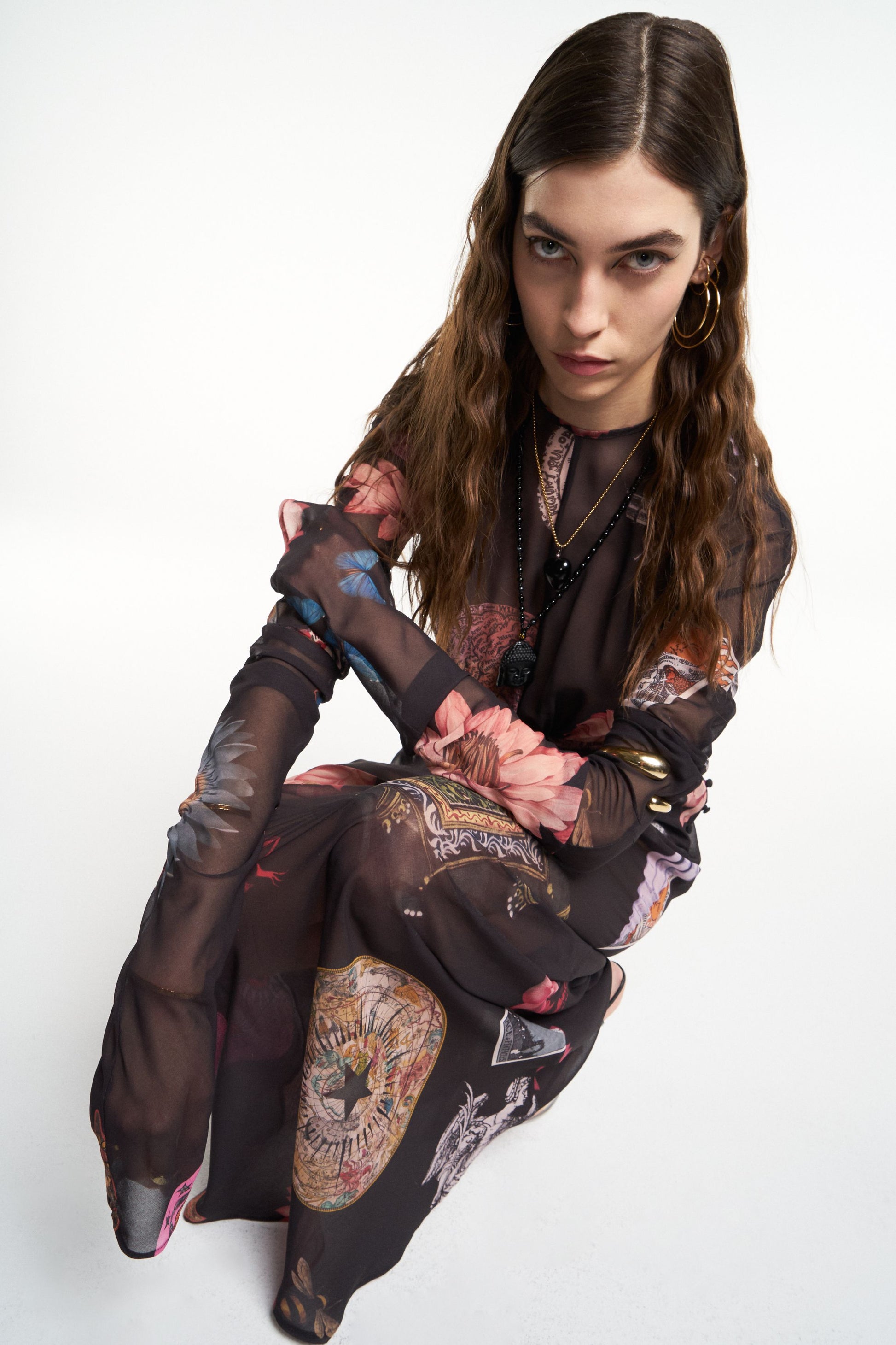 Vestido estampado largo al bies cortado en la cintura con detalle rizado en el centro inferior y manga dolman entallada extra larga para rizar de forma natural sobre las muñecas