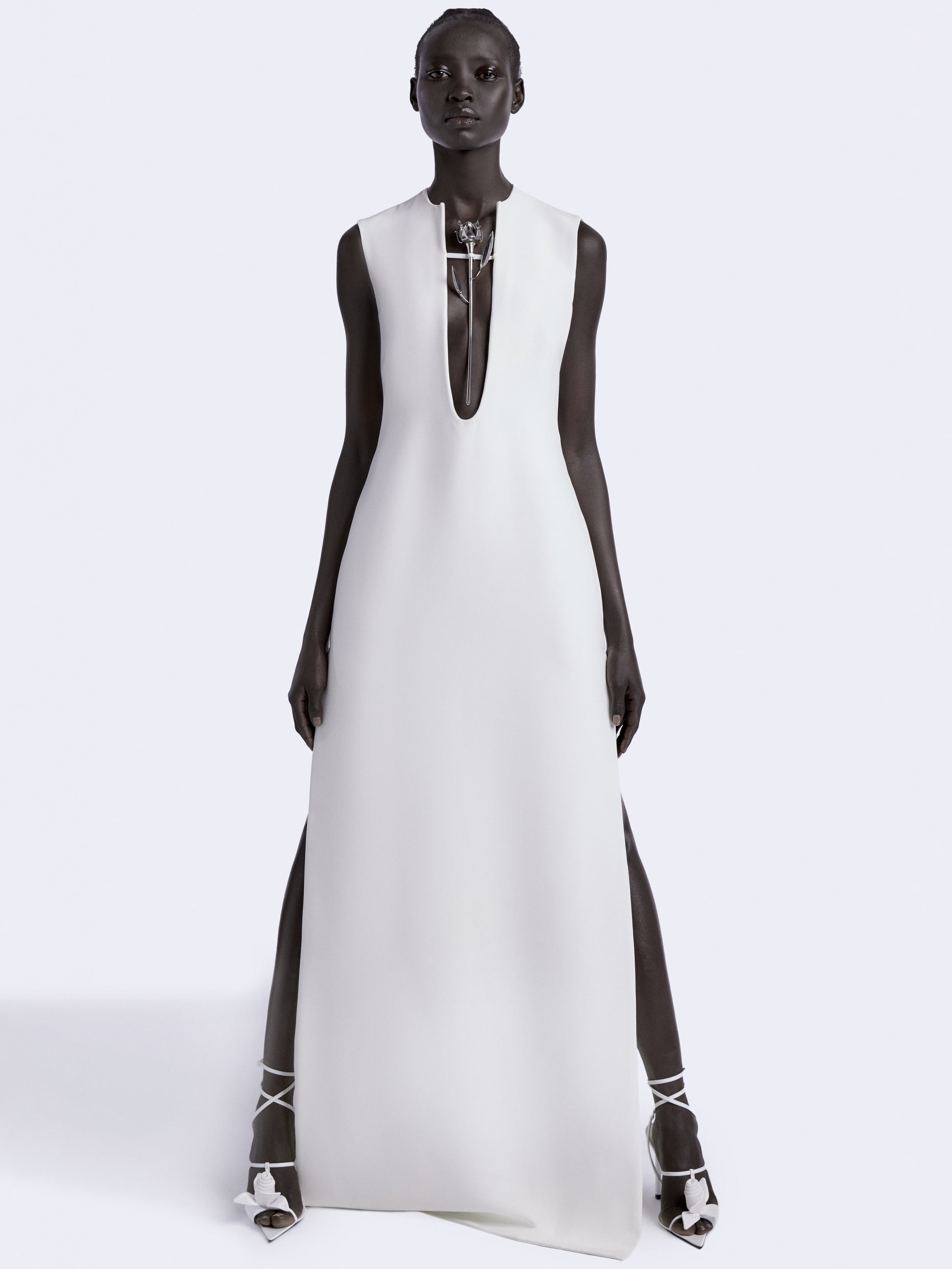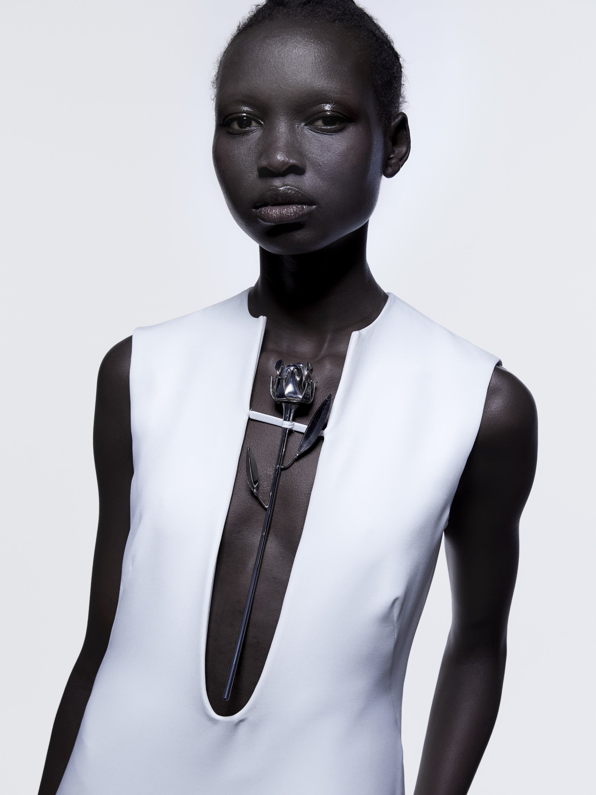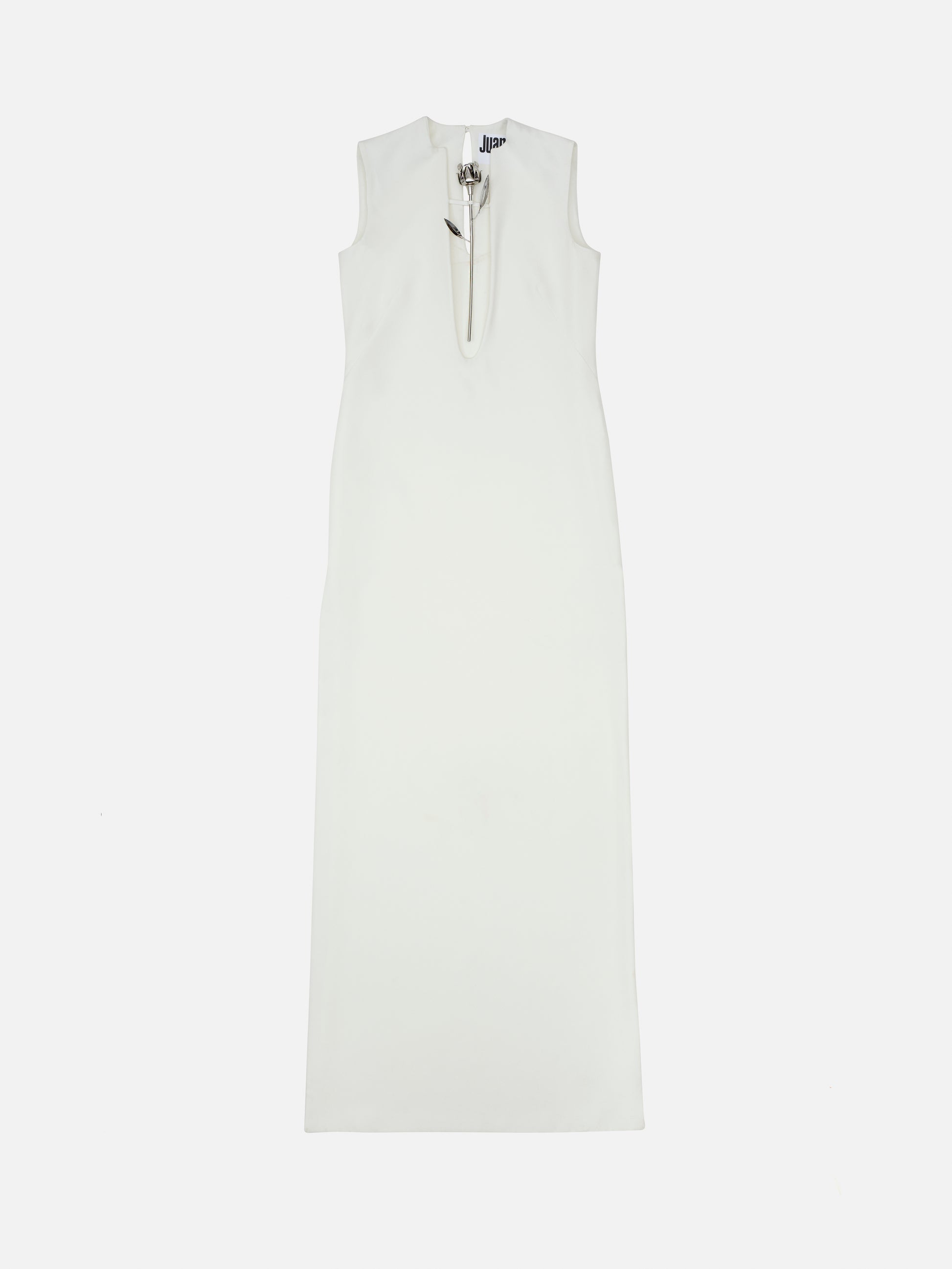 Vestido cuello caja sin mangas, con escote en forma de U profunda y rematada con una estructura interior moldeada para adaptarse al cuerpo e impedir su abertura. El escote está decorado con una rosa metálica de tallo largo cosida a mano sobre una pieza del mismo tejido. El vestido se cierra en la espalda a través de una lágrima abotonada en la parte superior.