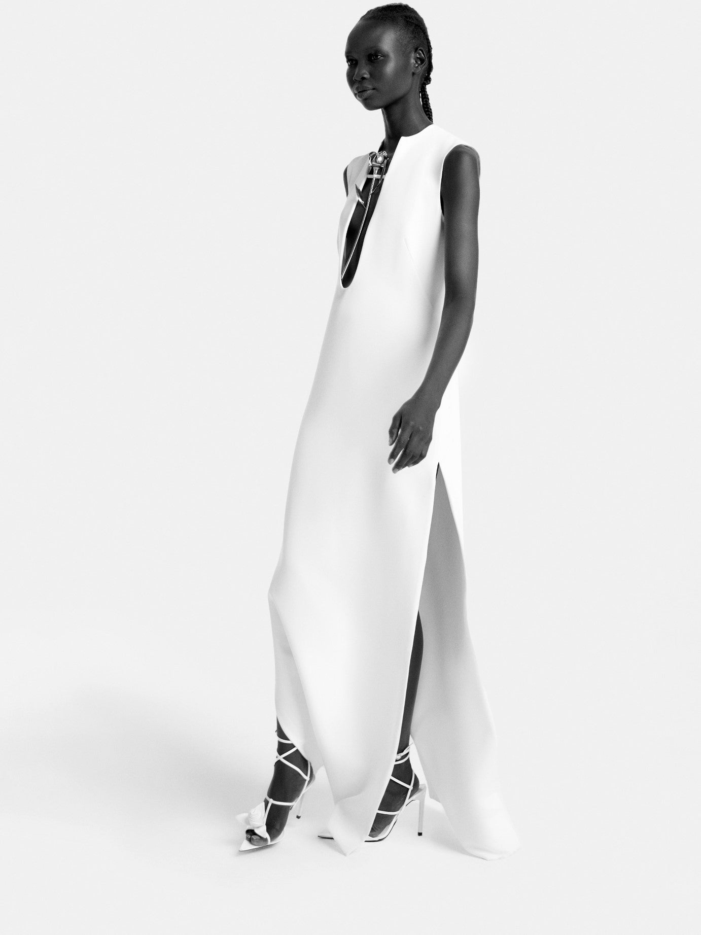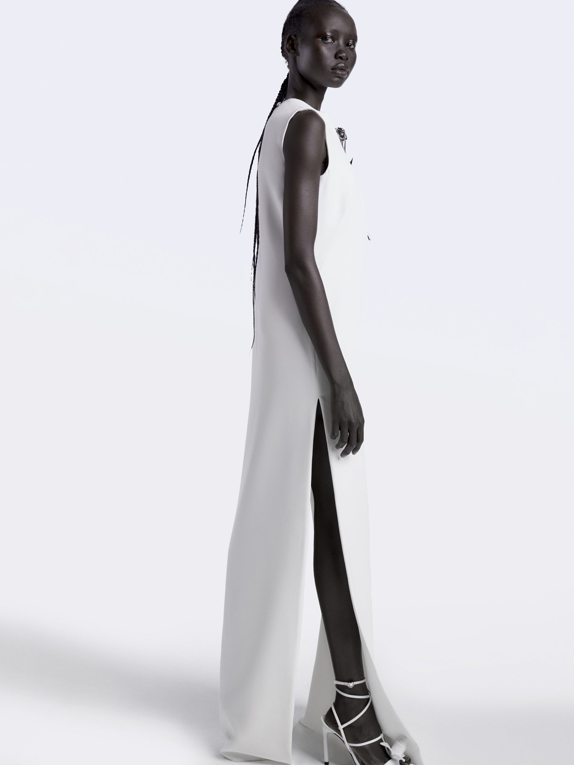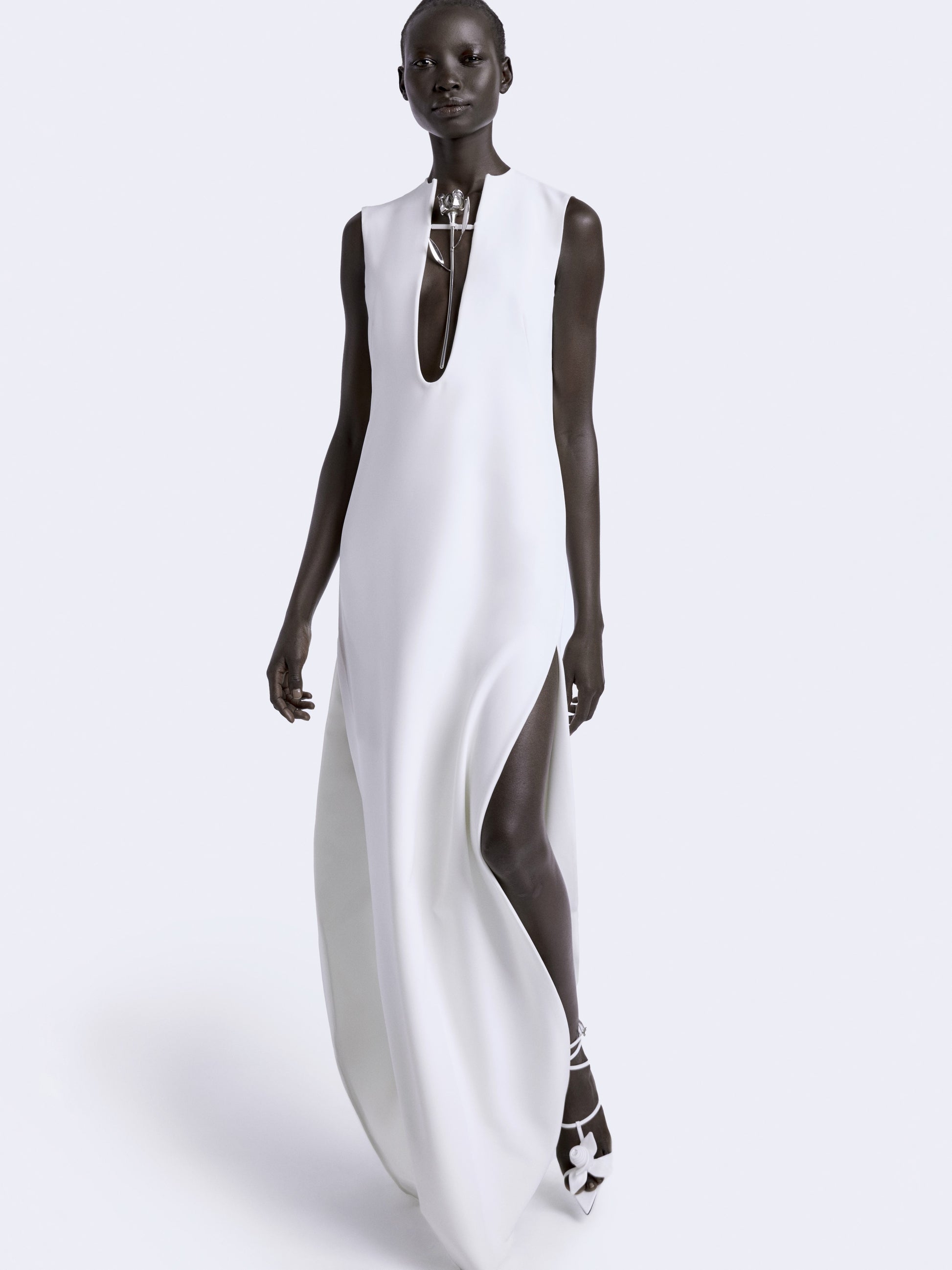 Vestido cuello caja sin mangas, con escote en forma de U profunda y rematada con una estructura interior moldeada para adaptarse al cuerpo e impedir su abertura. El escote está decorado con una rosa metálica de tallo largo cosida a mano sobre una pieza del mismo tejido. El vestido se cierra en la espalda a través de una lágrima abotonada en la parte superior.