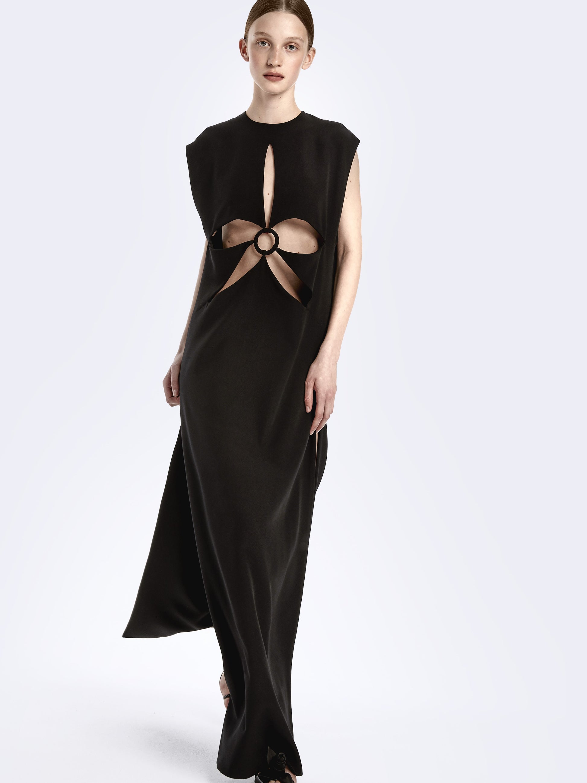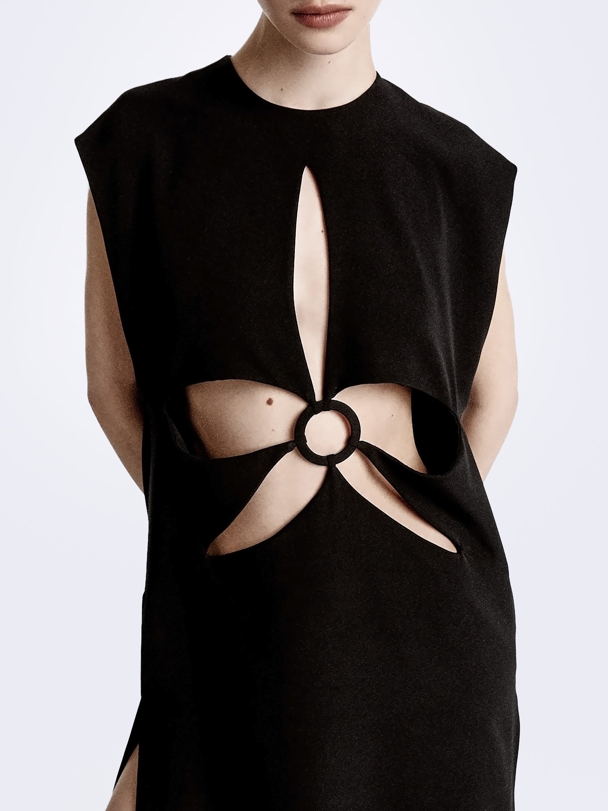 Vestido recto, cuello caja y sin mangas, con decoración frontal a base de varios ojales en forma de pétalo que se recogen en una arandela central forrada del mismo tejido. Tiene una abertura trasera y se cierra en la espalda a través de una lágrima abotonada en la parte superior.