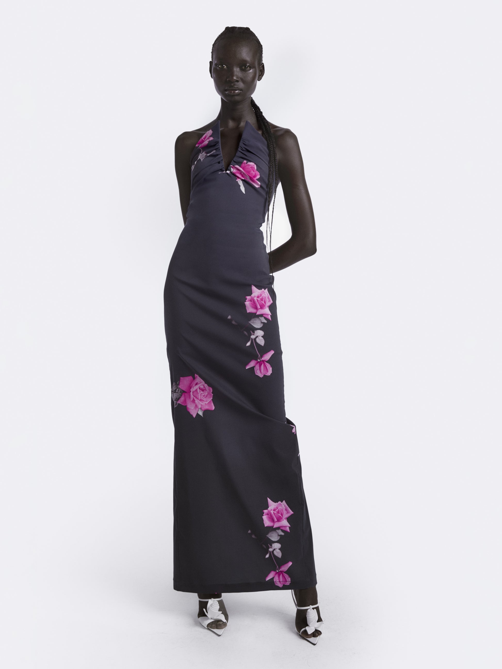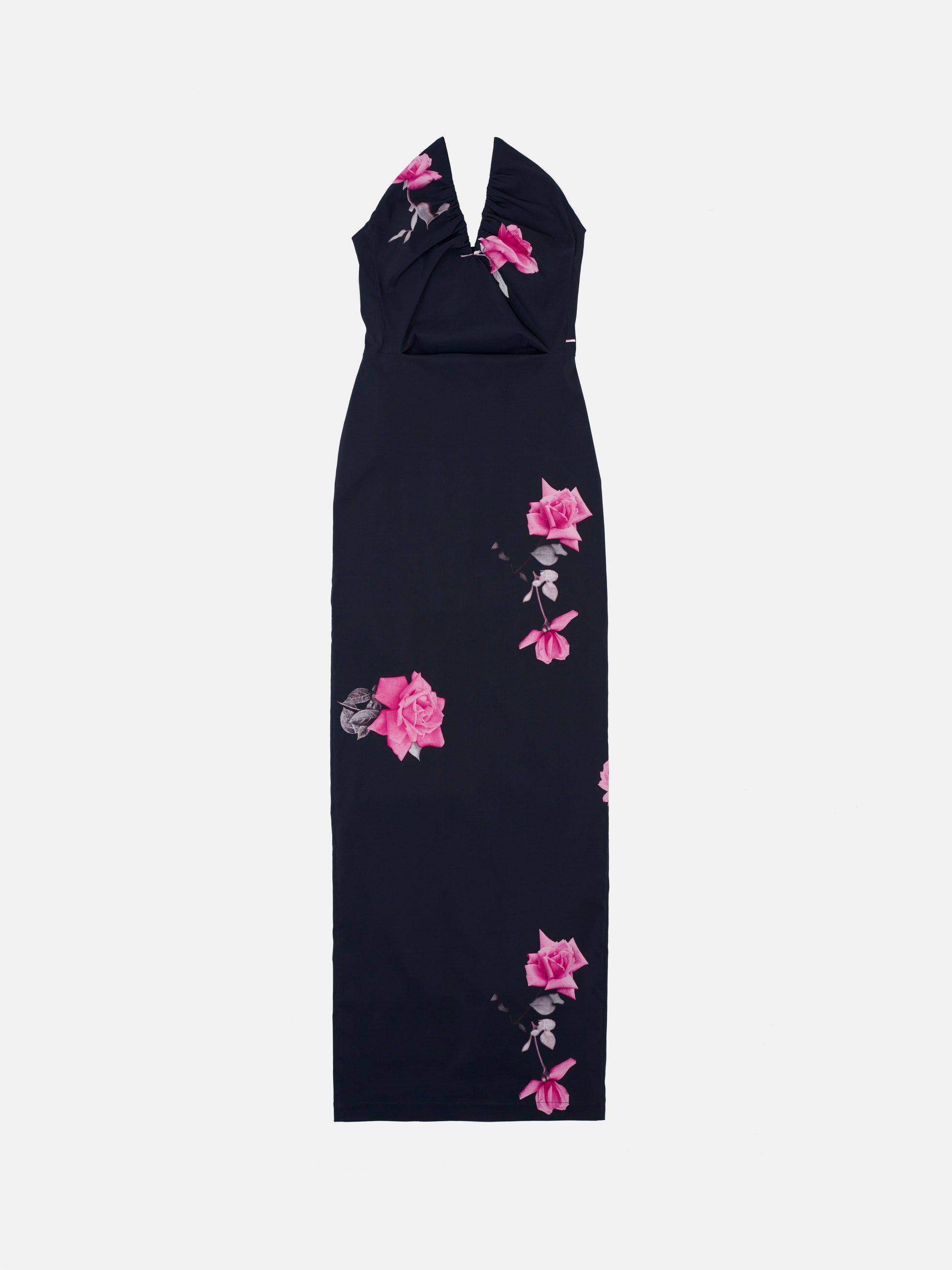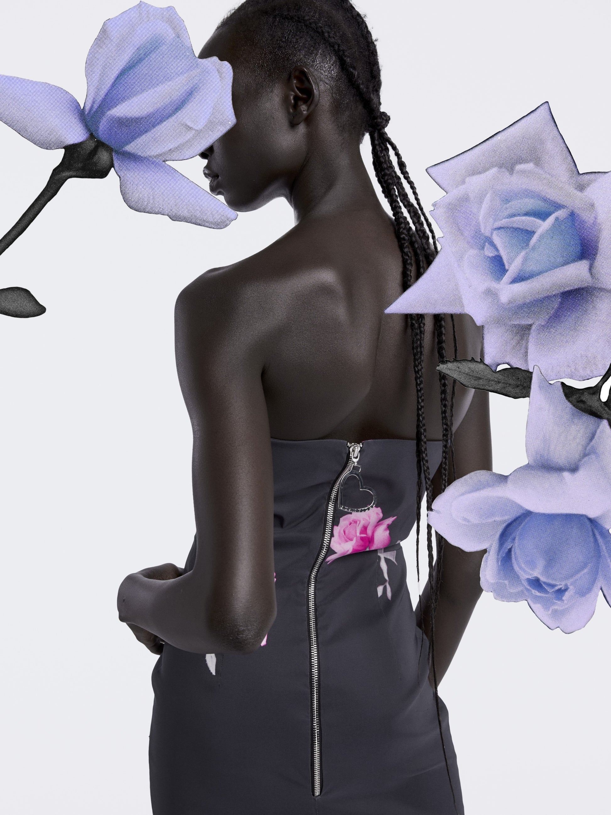 Vestido strapless elástico con escote en forma de V drapeada sobre una estructura interior. Se cierra en la espalda con una cremallera metálica.